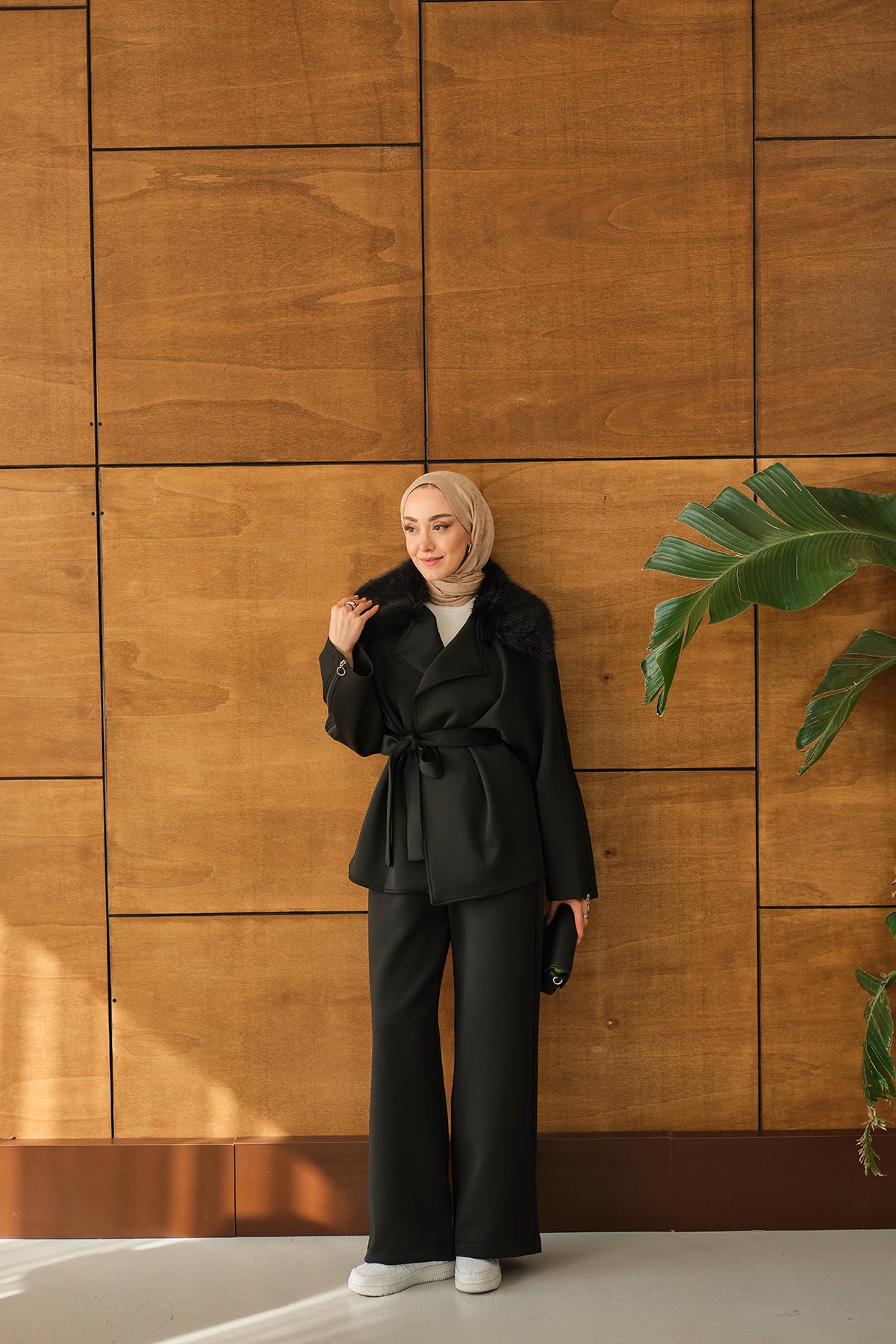Yakası Kürk Kolları fermuarlı Takım Siyah