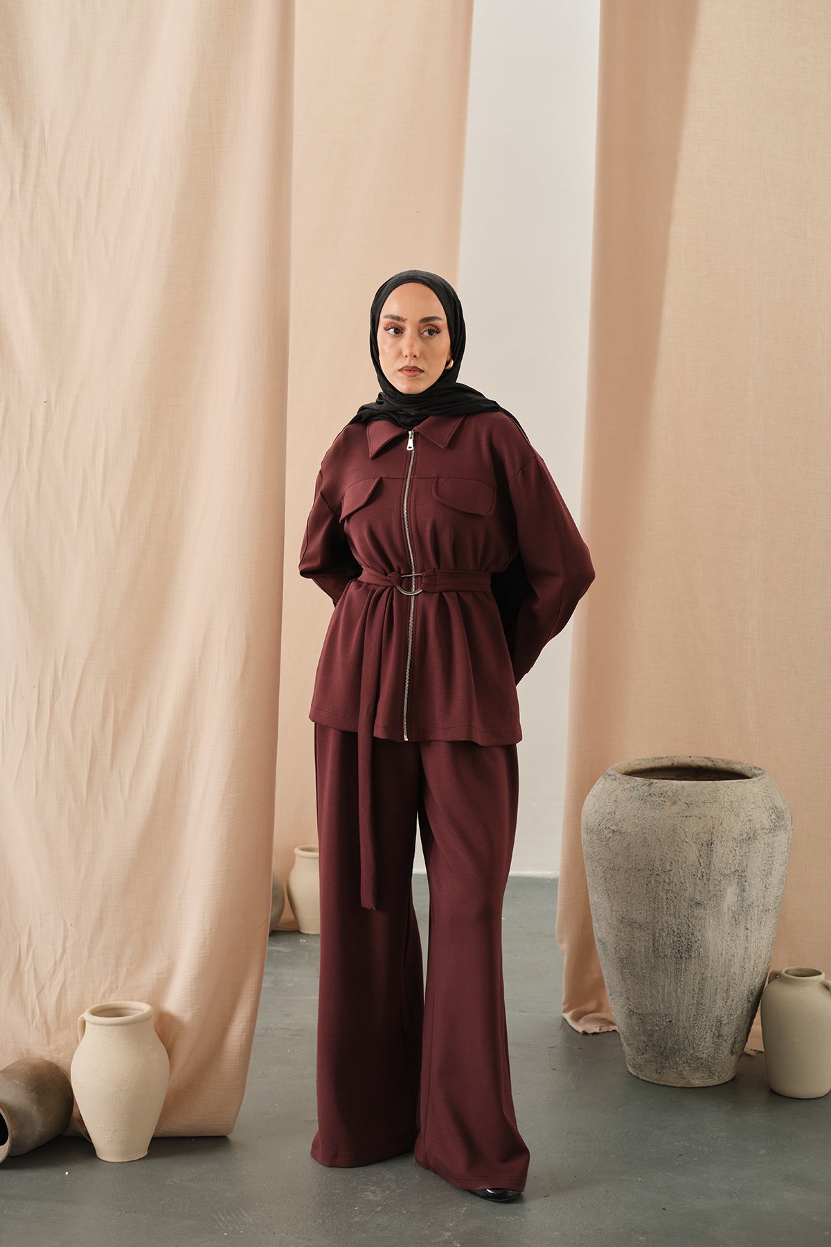 Zipper Detail Waist-Tie Two-Piece Set – Burgundy