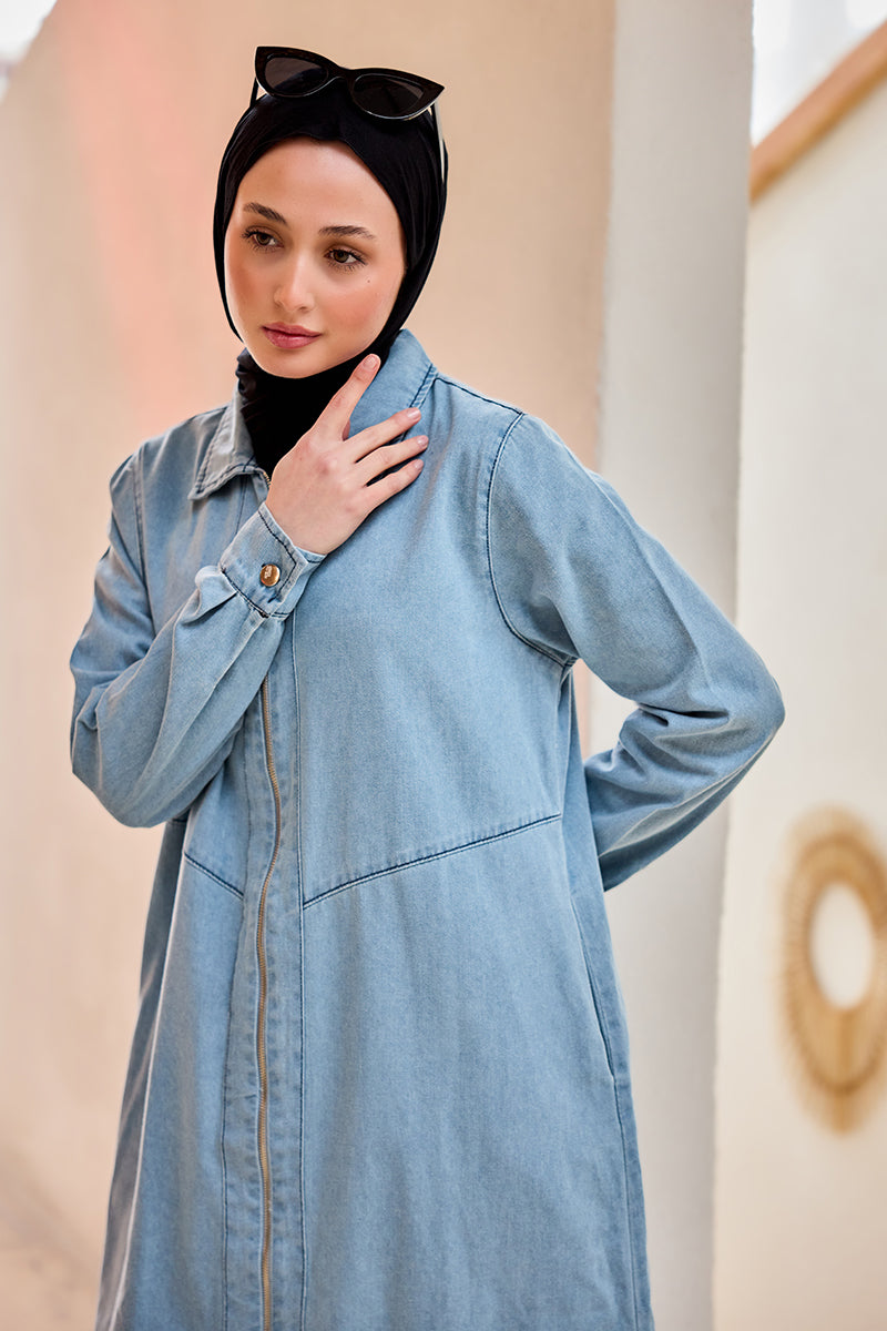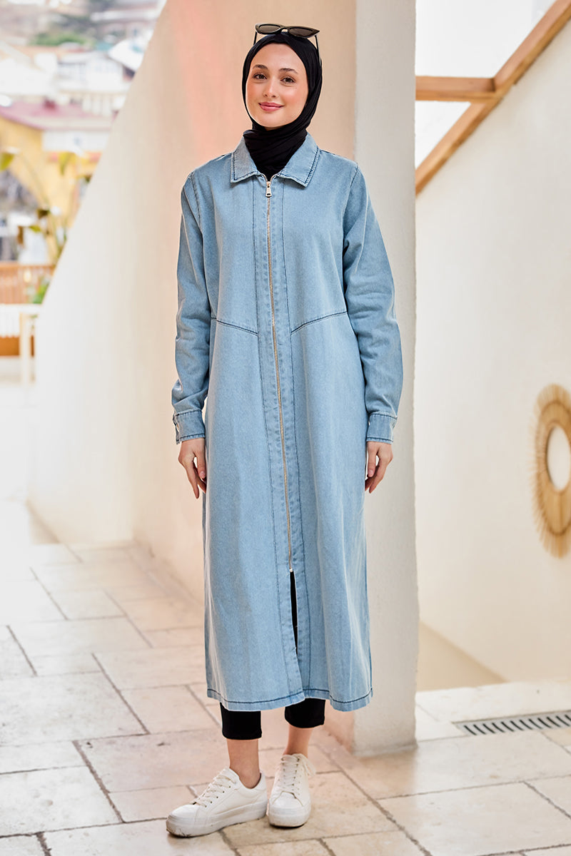 Zippered Midi Length Denim Jacket Ice Blue