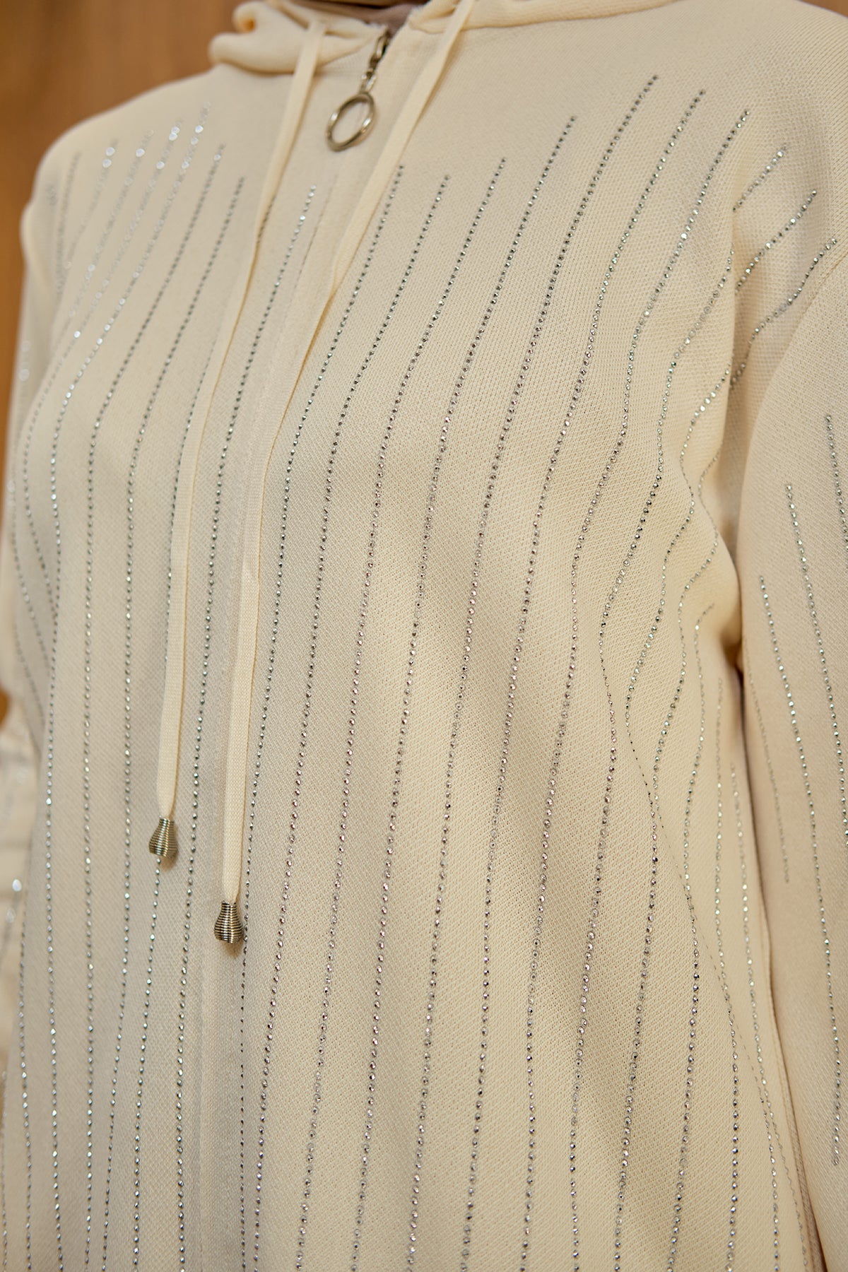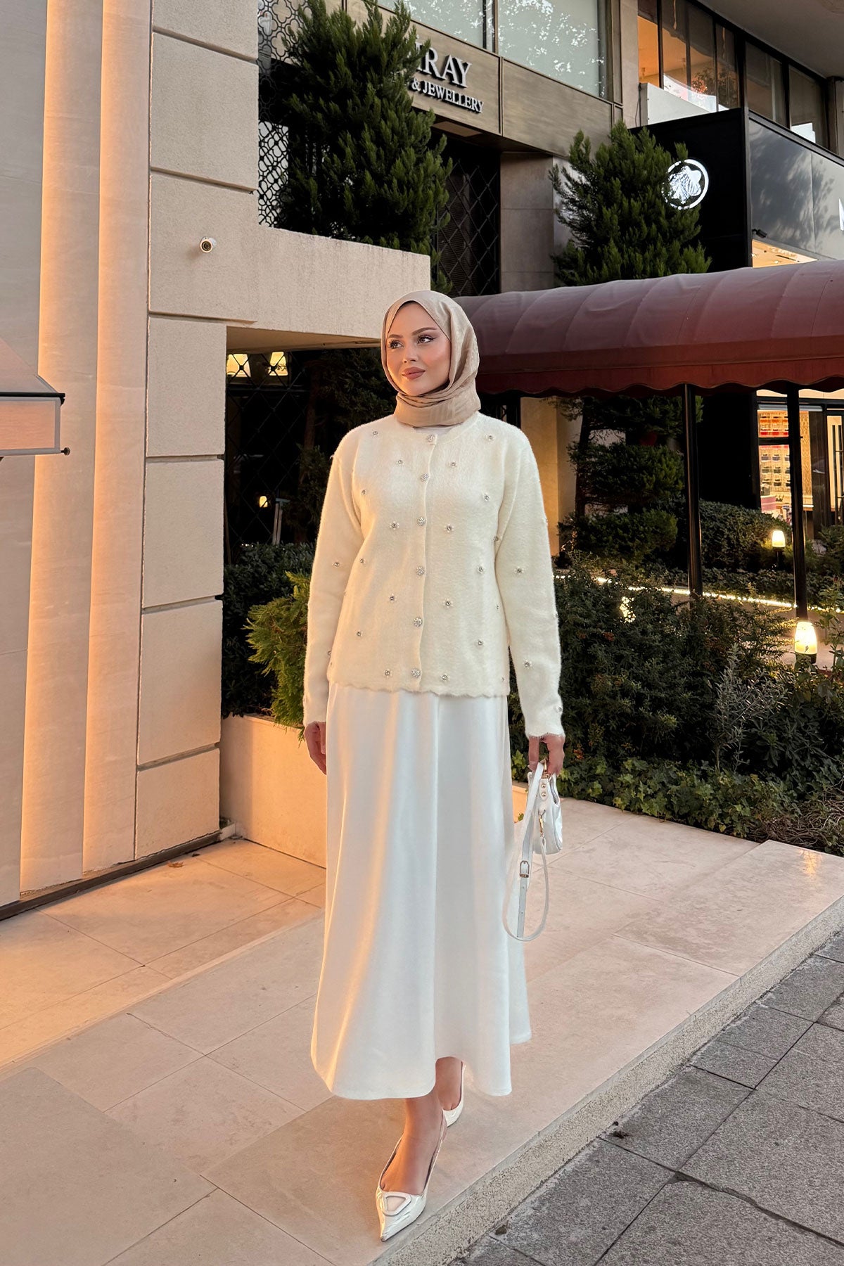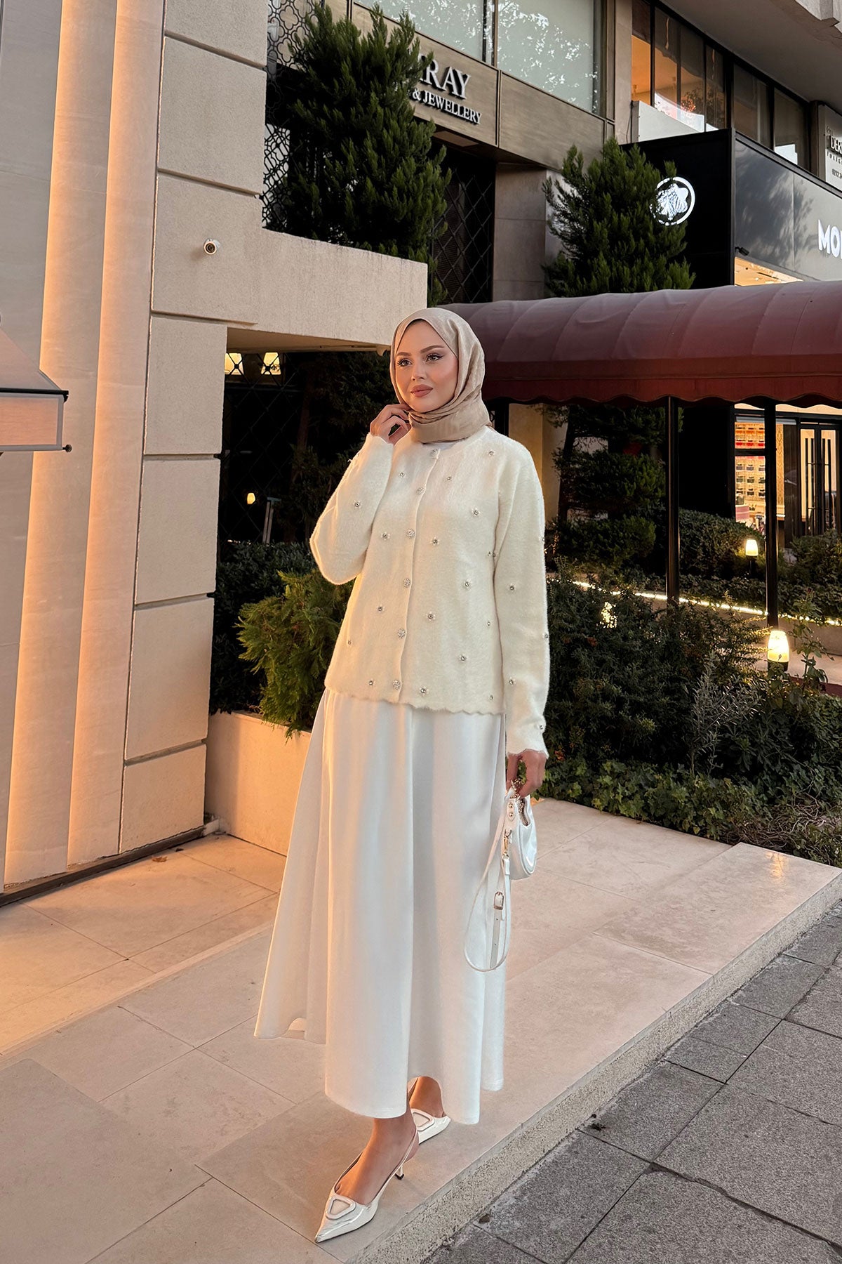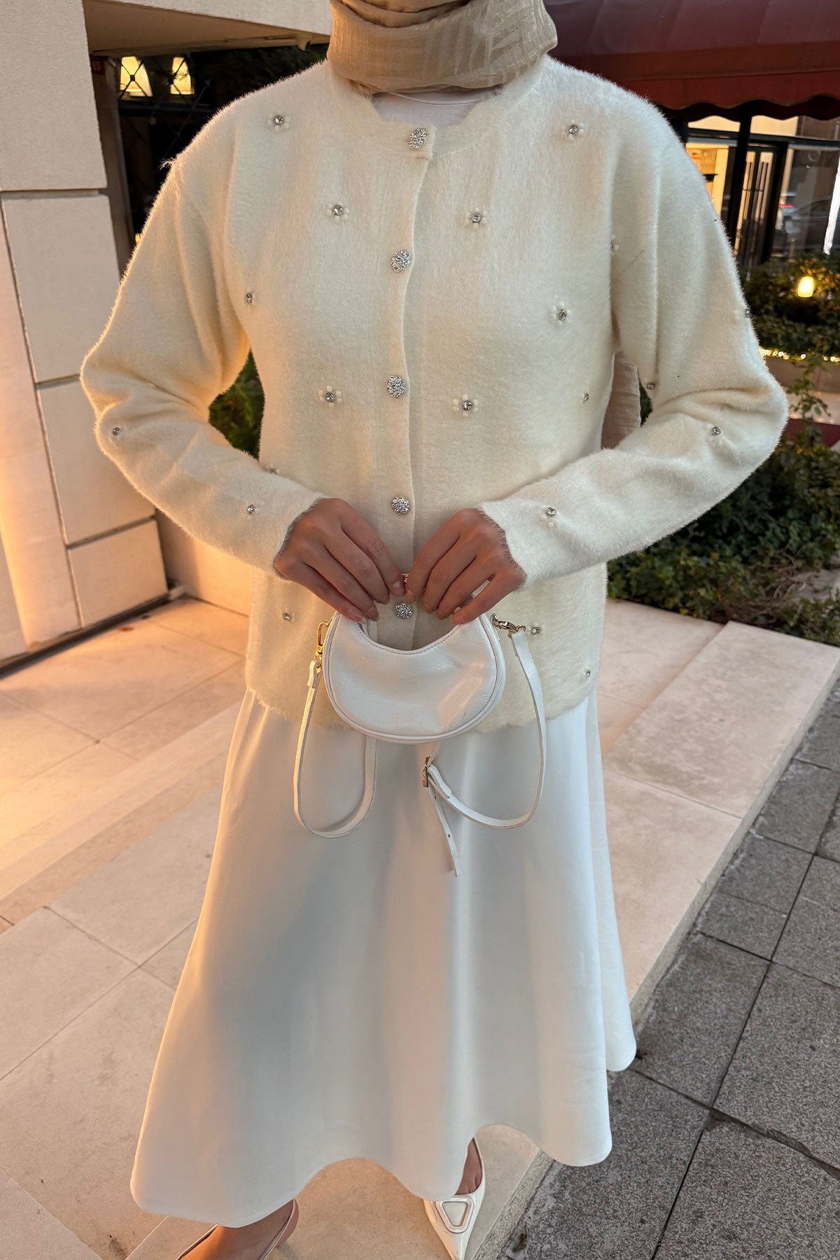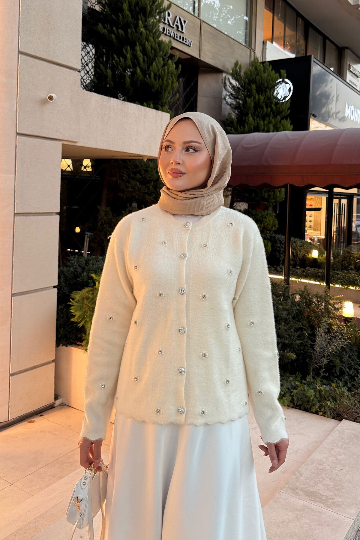 Taşlı Çiçek Düğmeli Hırka Ekru