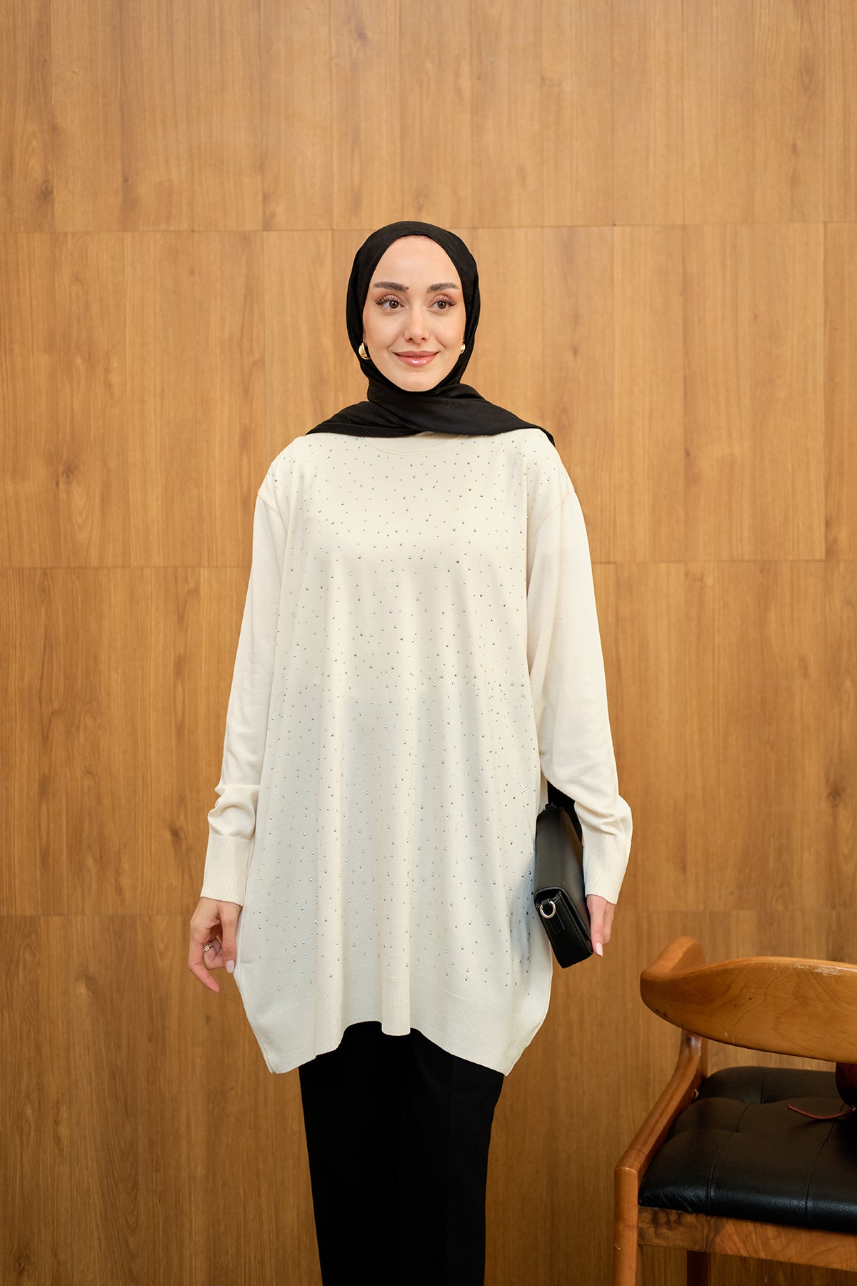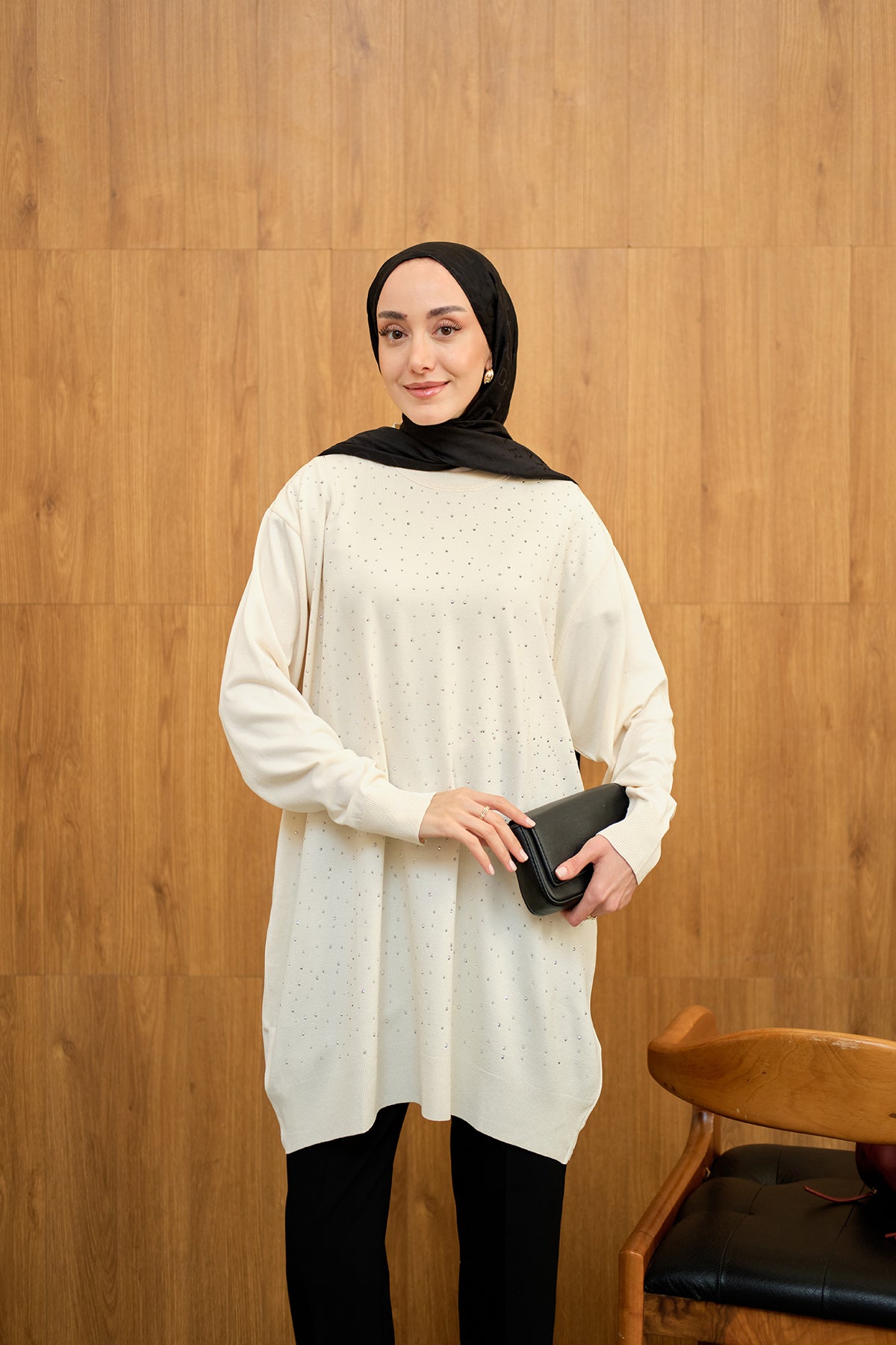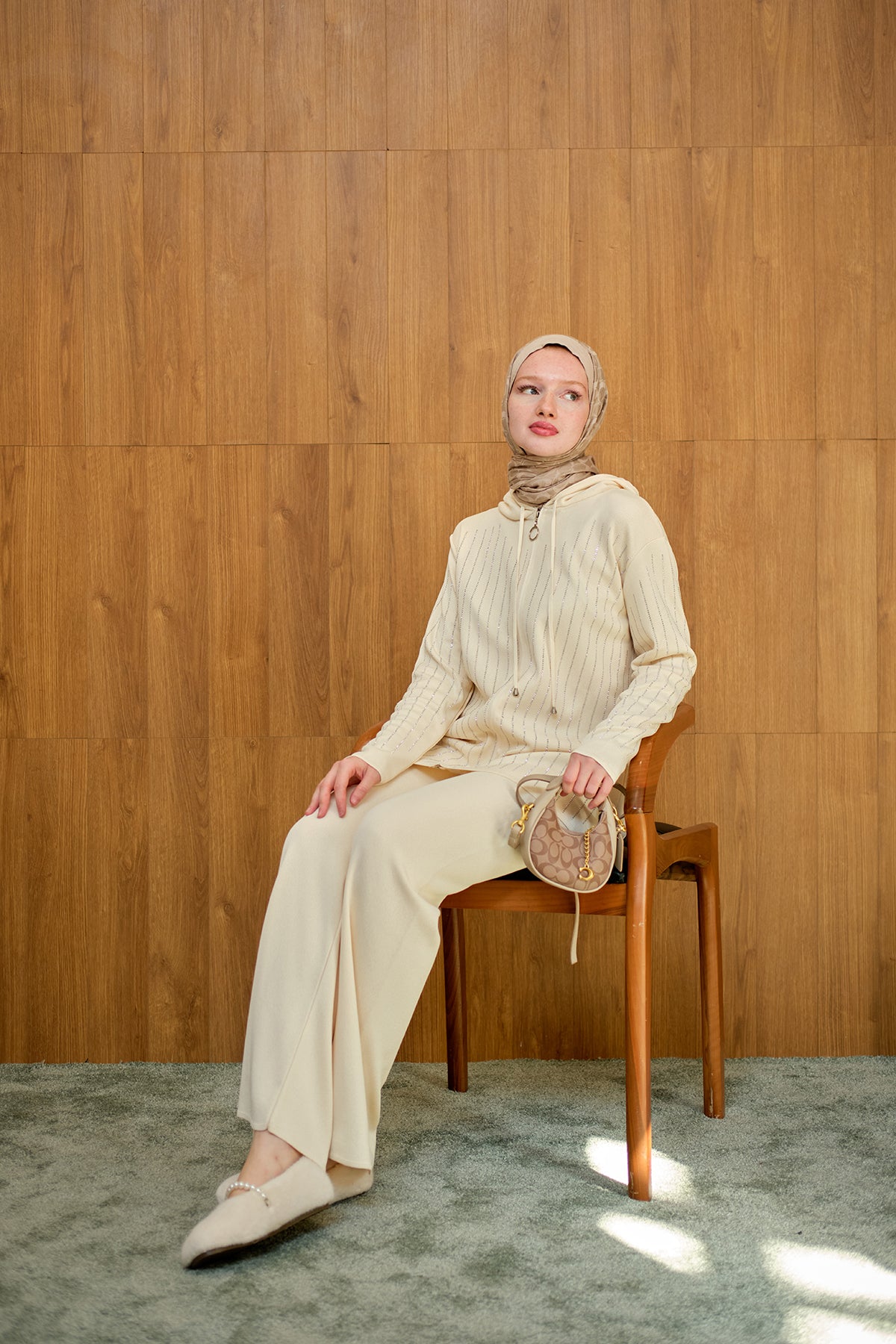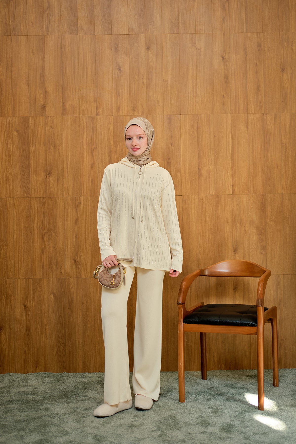 Taşlı Çiçek Düğmeli Hırka Ekru