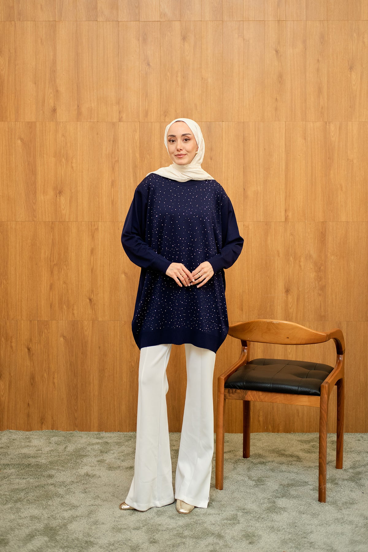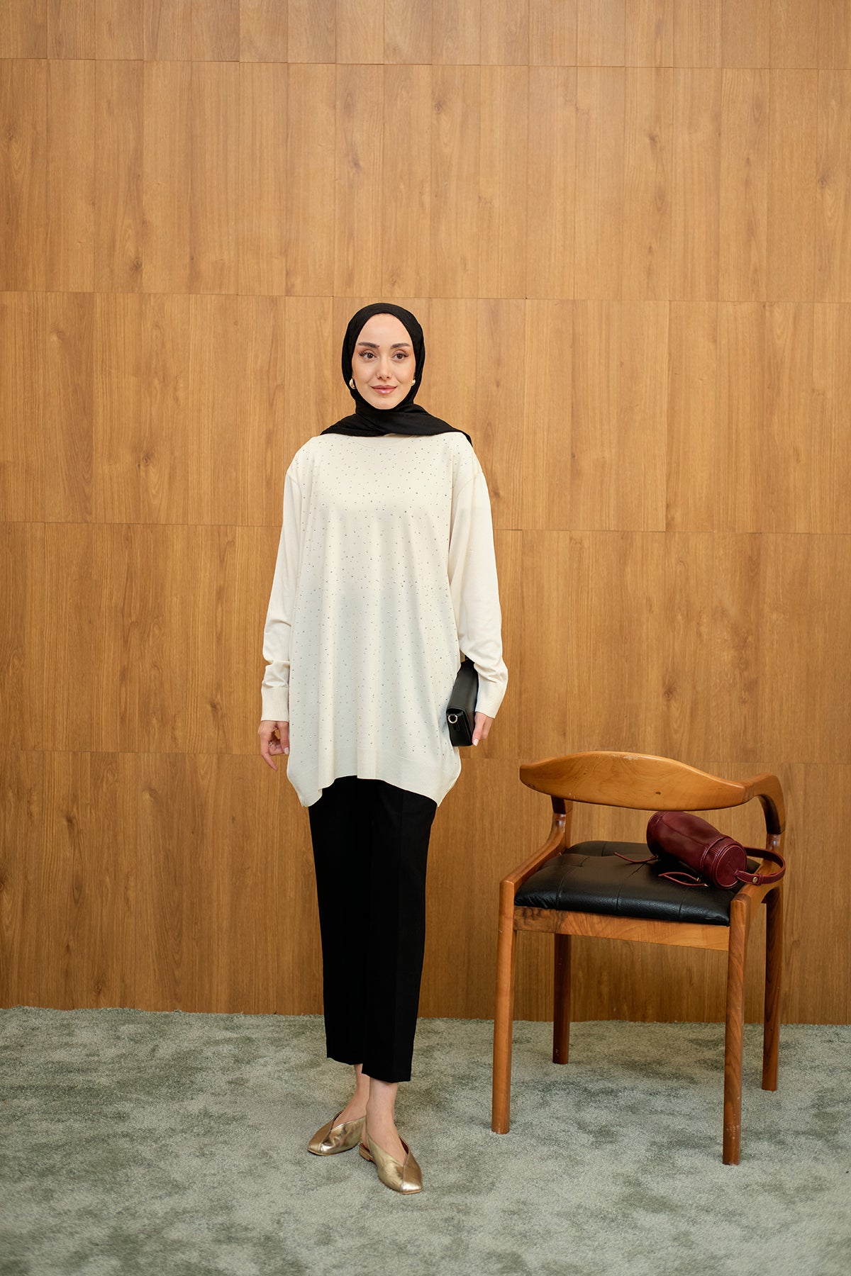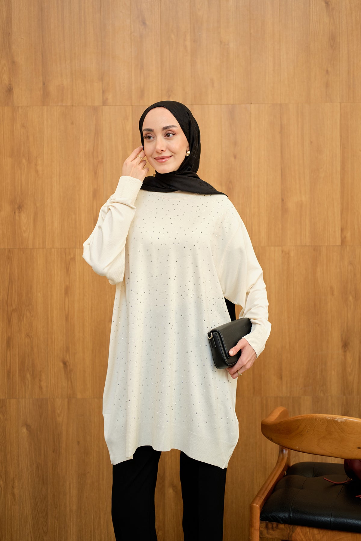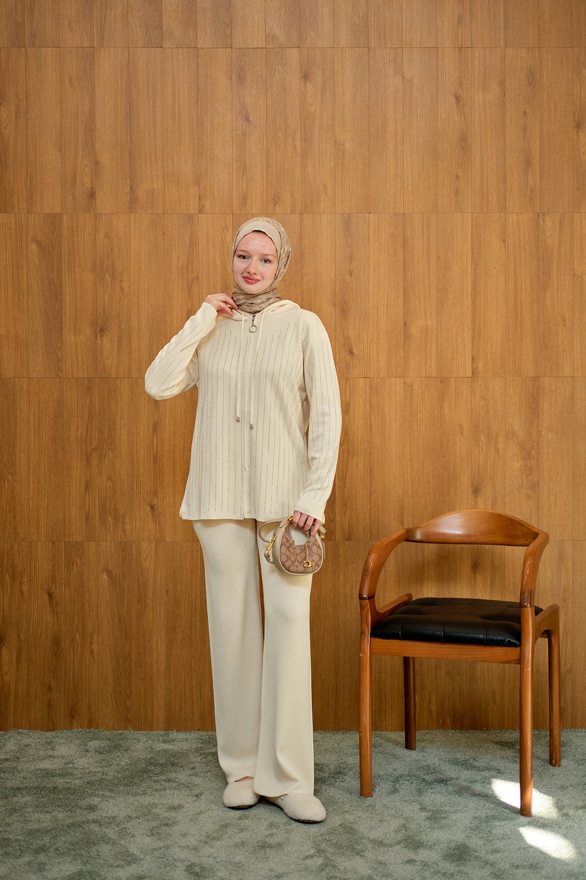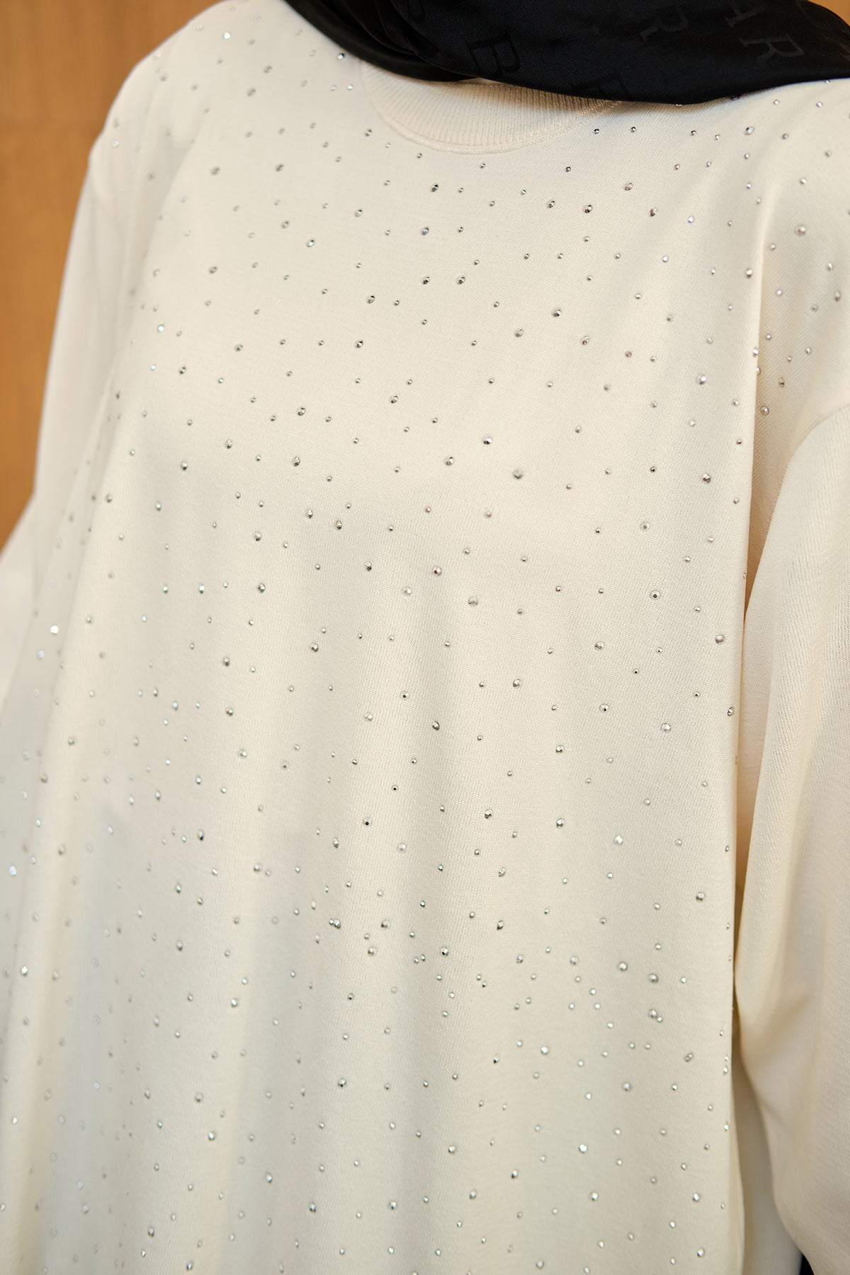 Taşlı Çiçek Düğmeli Hırka Ekru