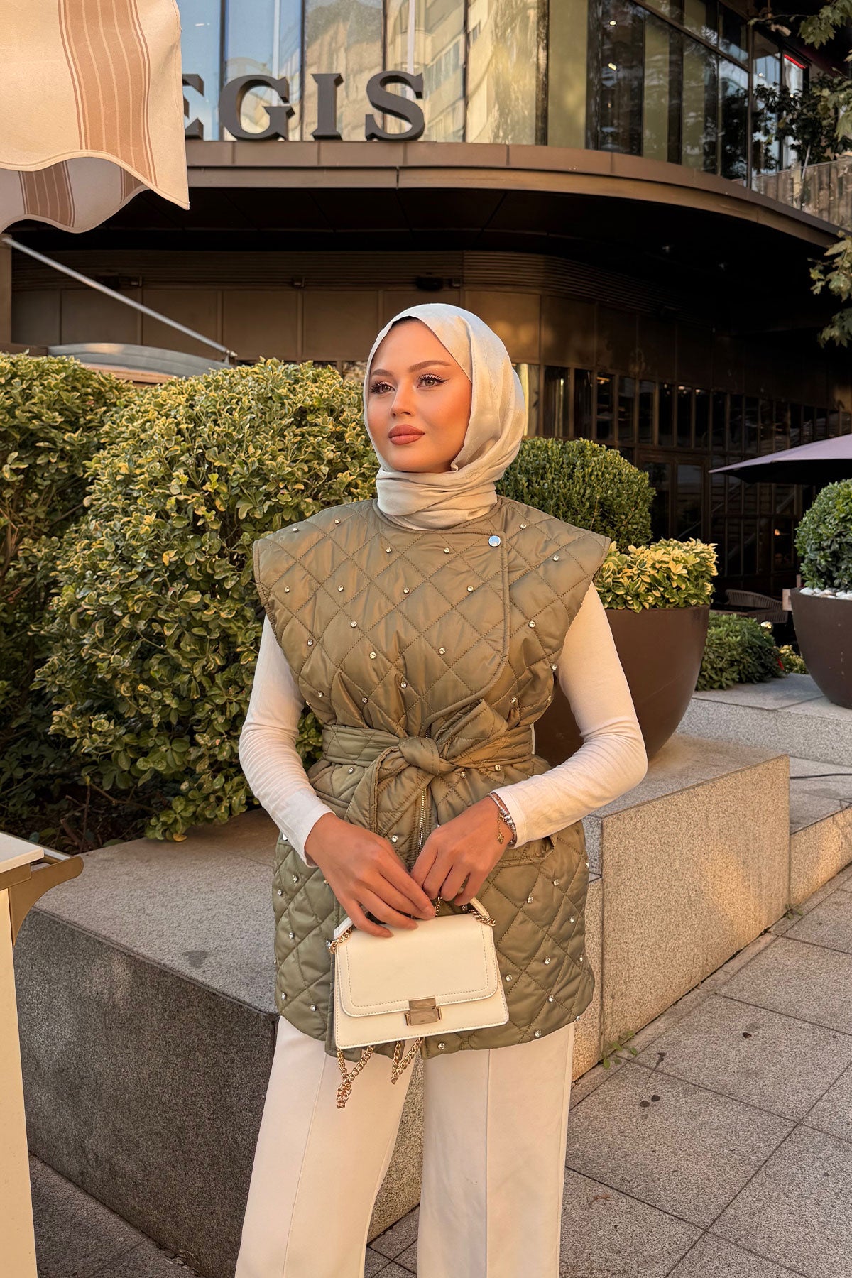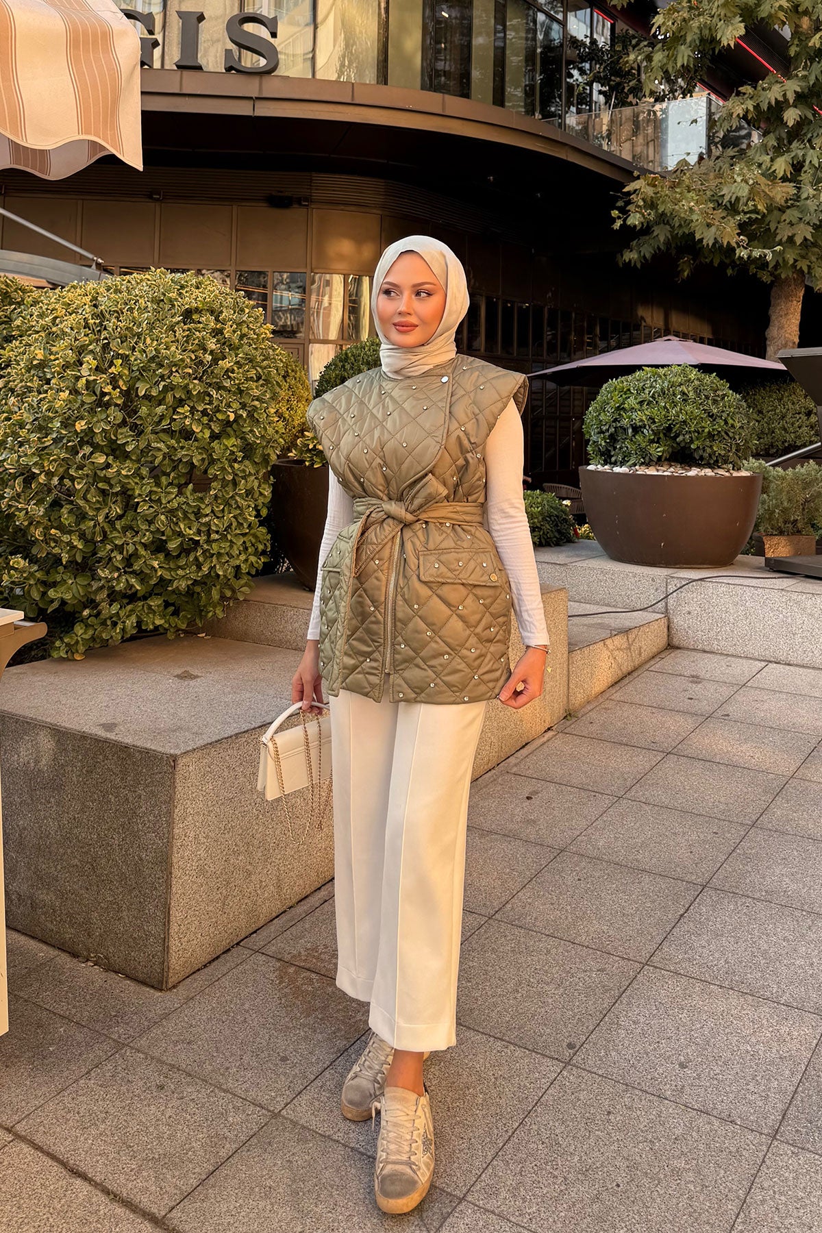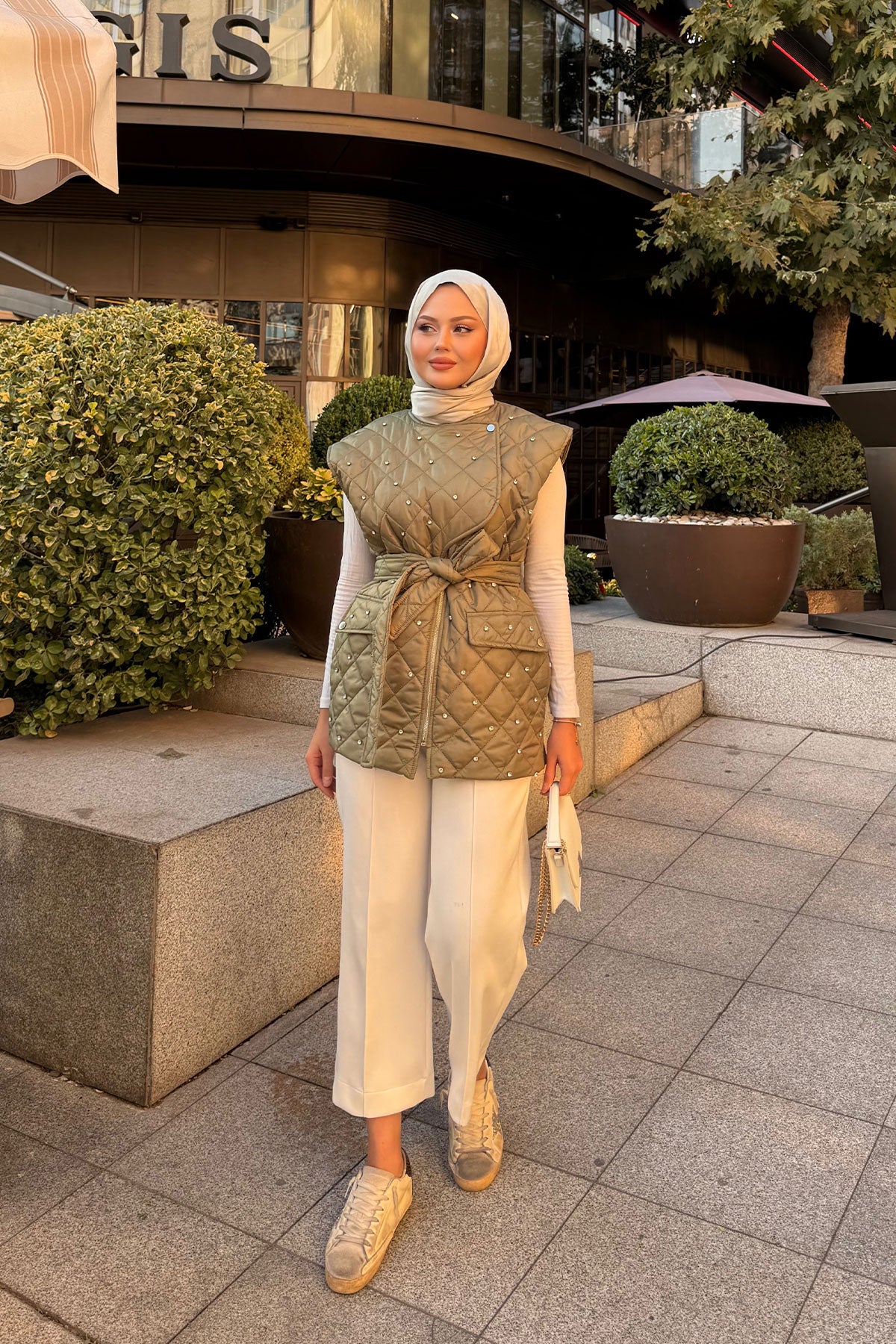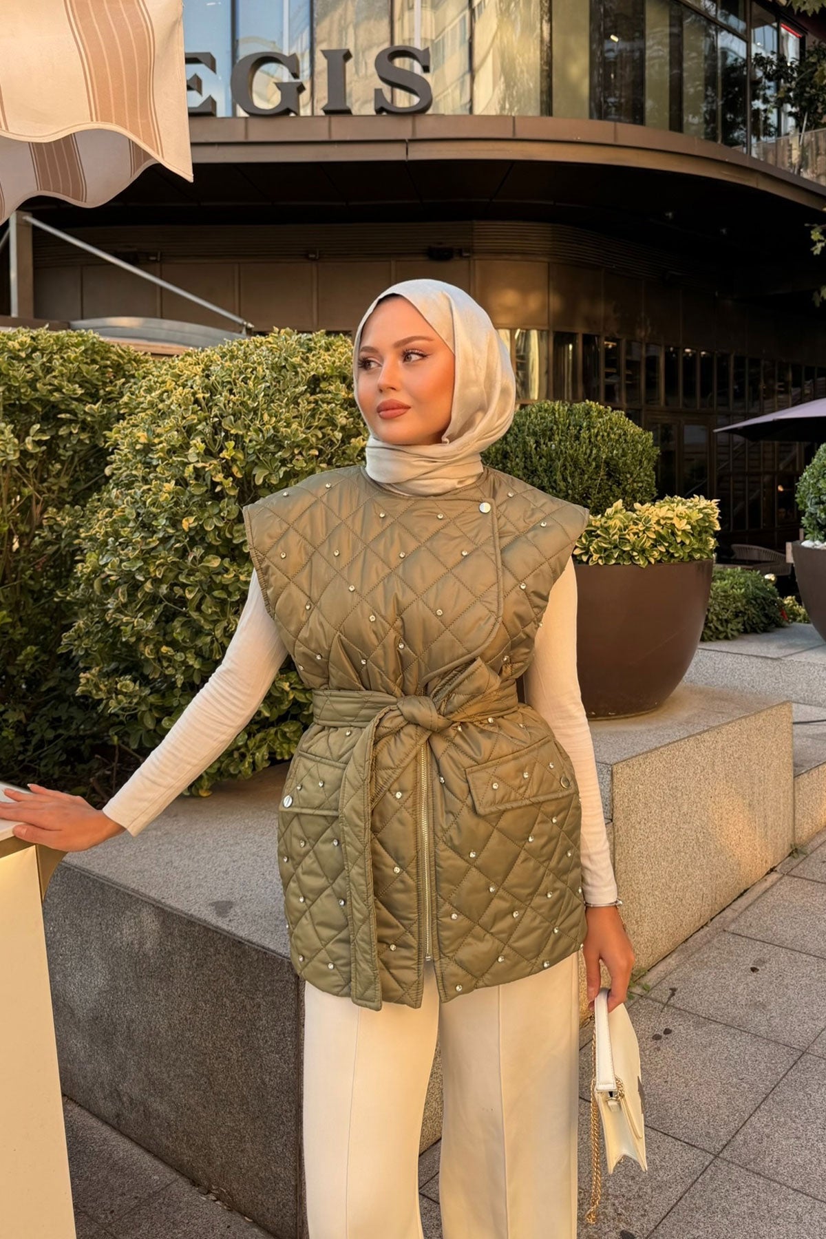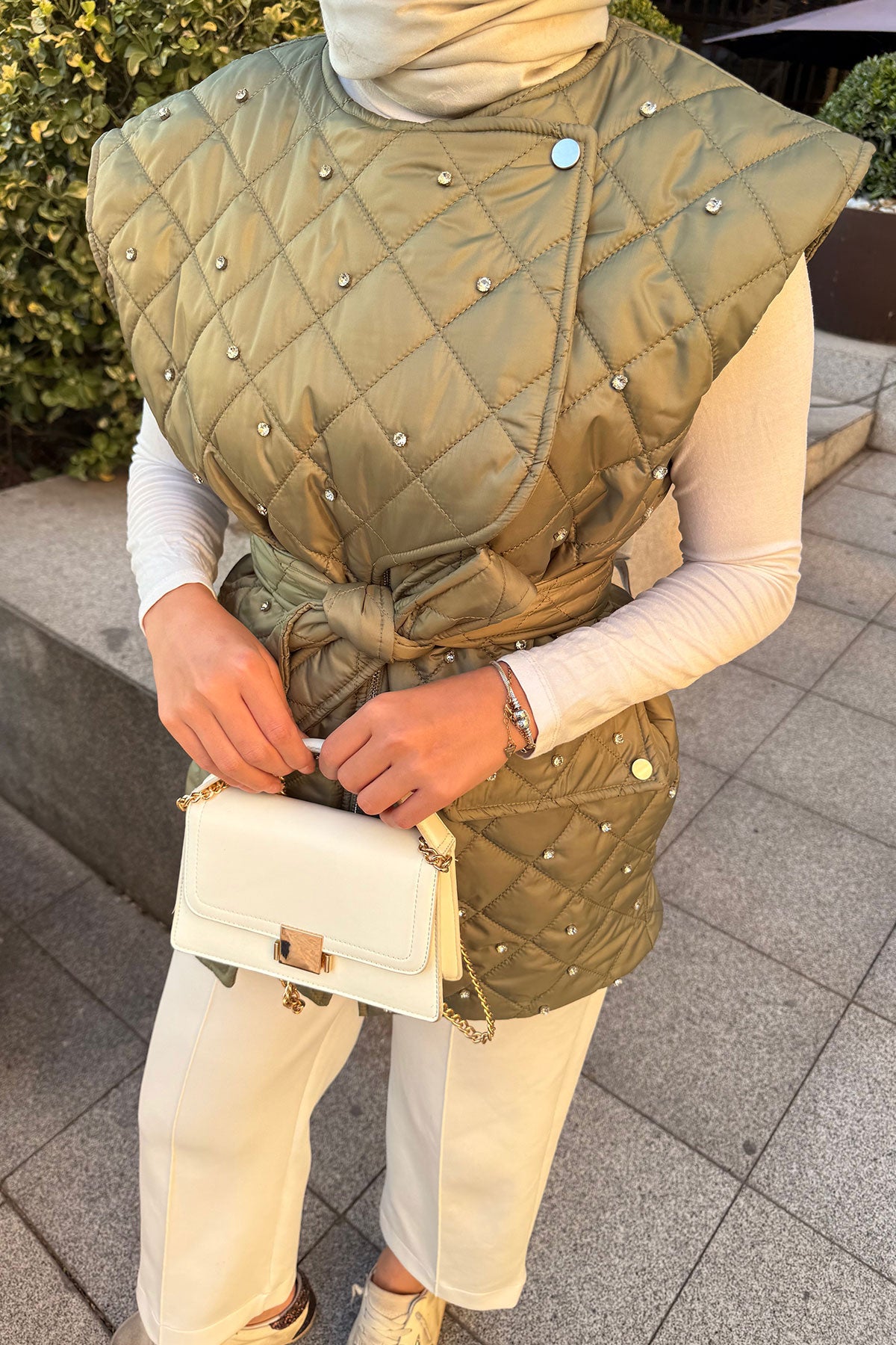 Taş Detaylı Kapitone Yelek Haki Yeşil