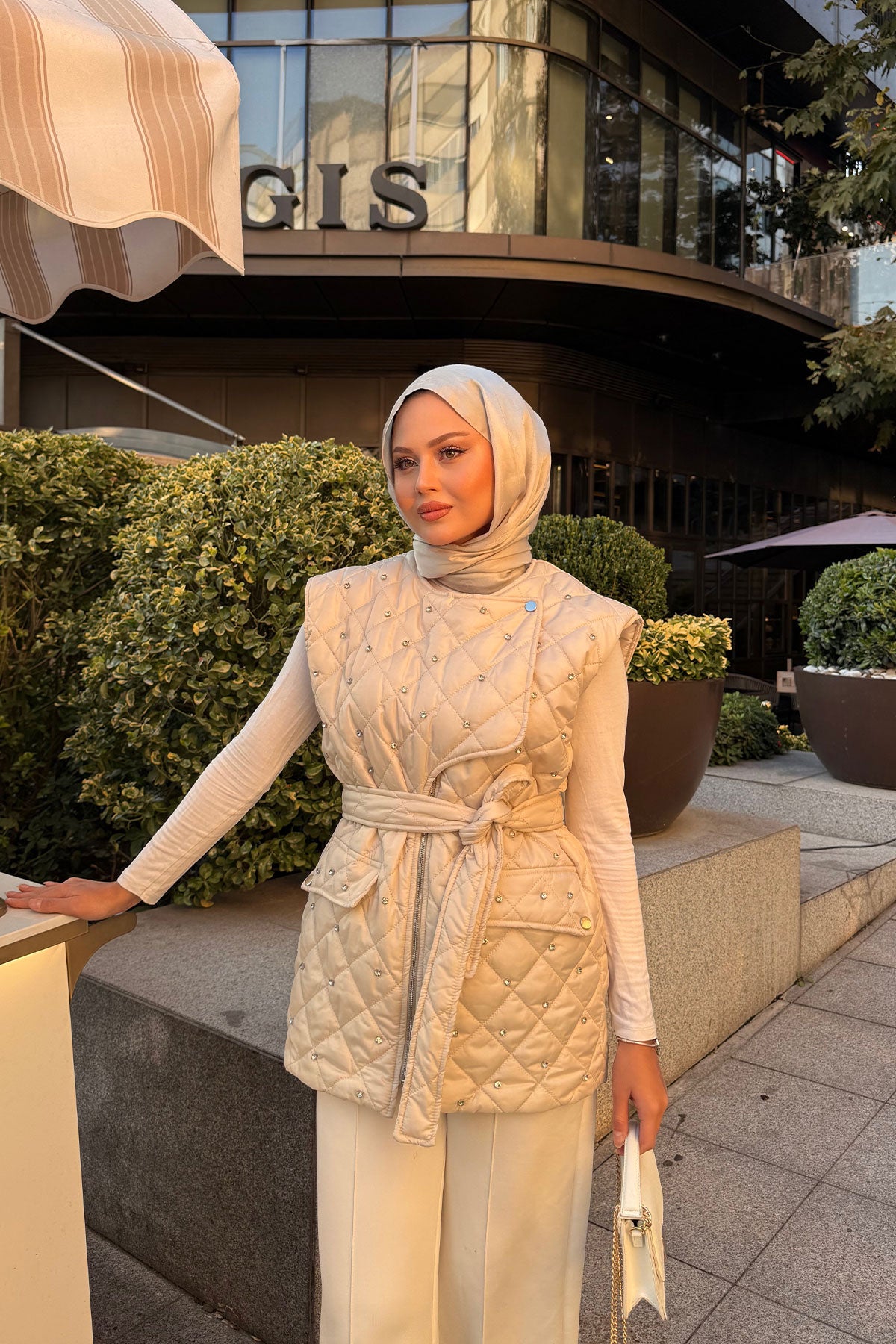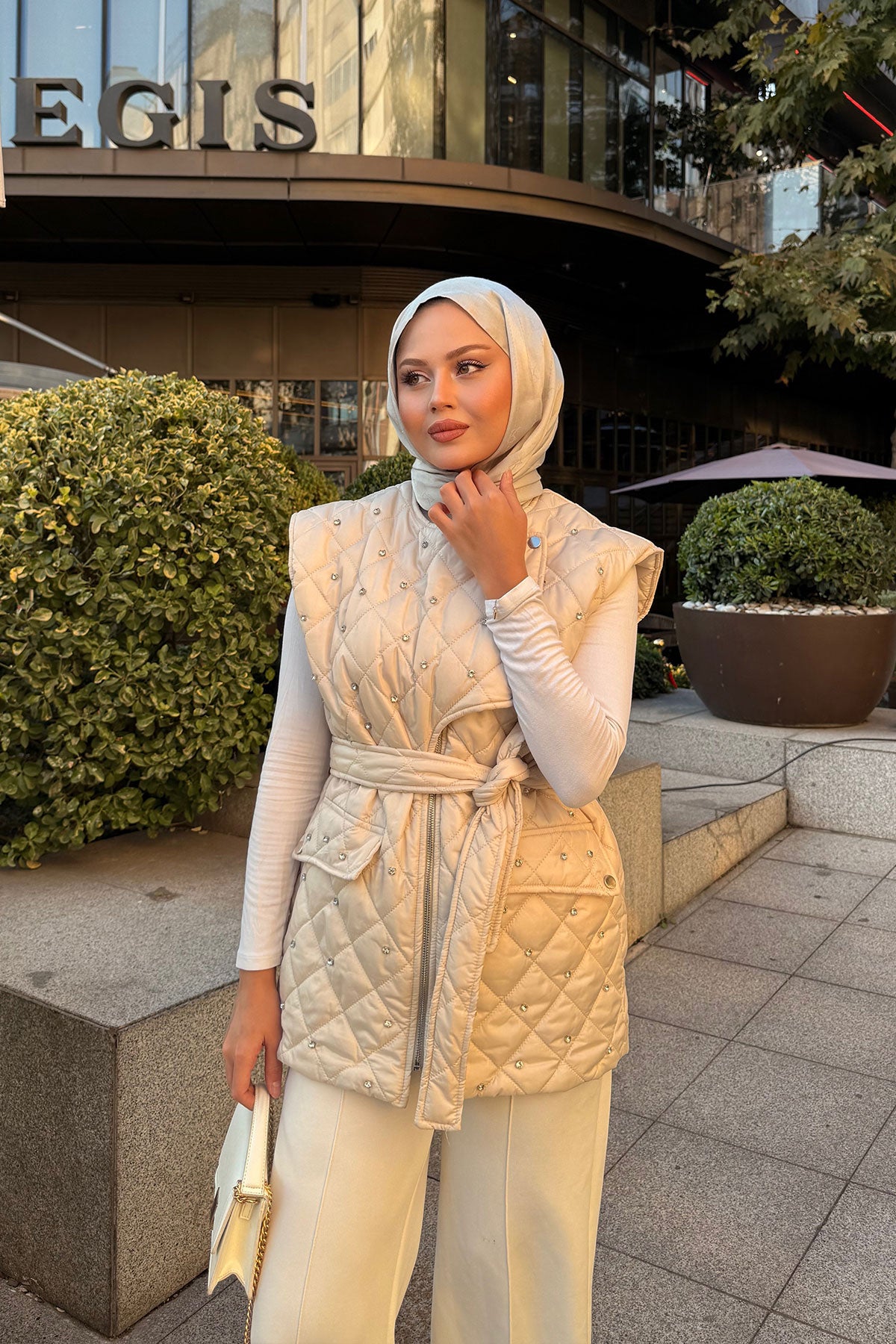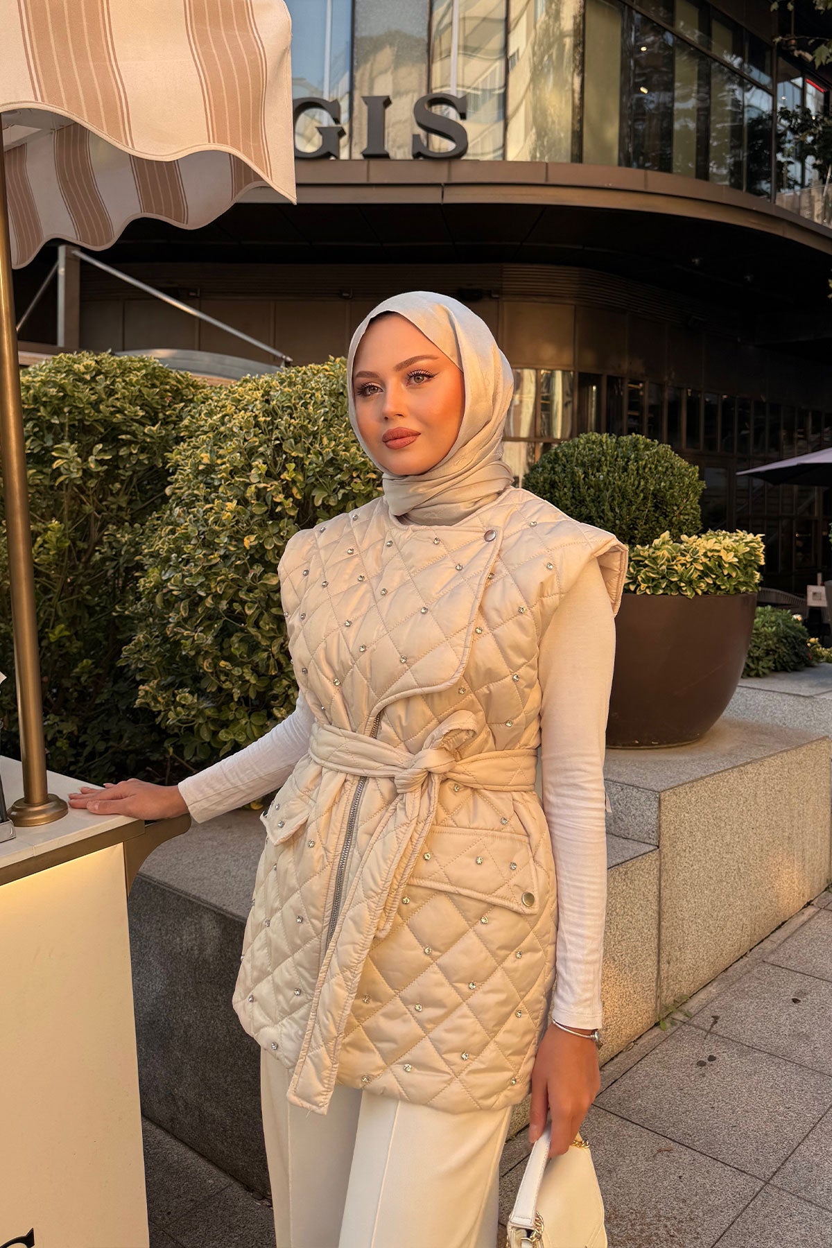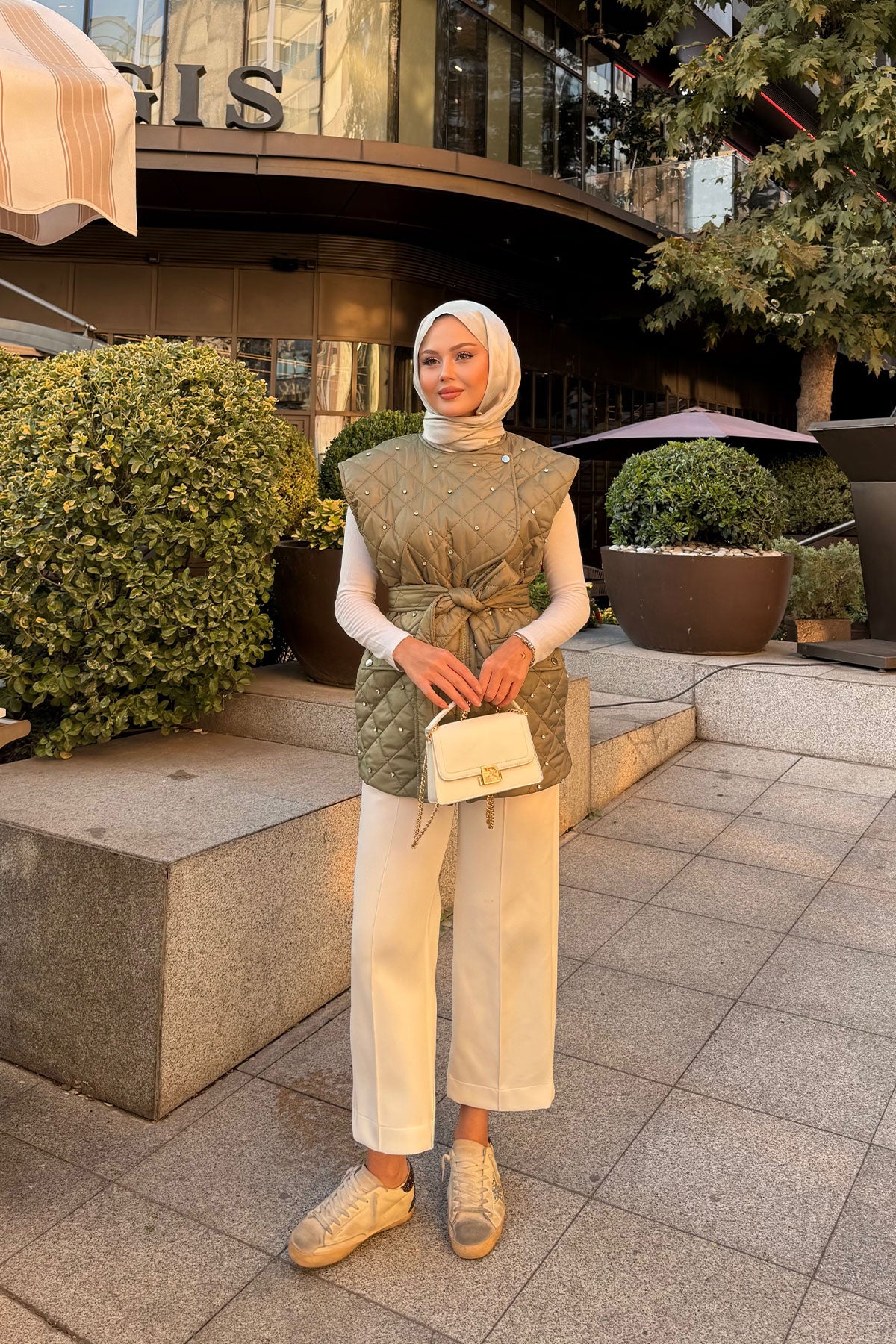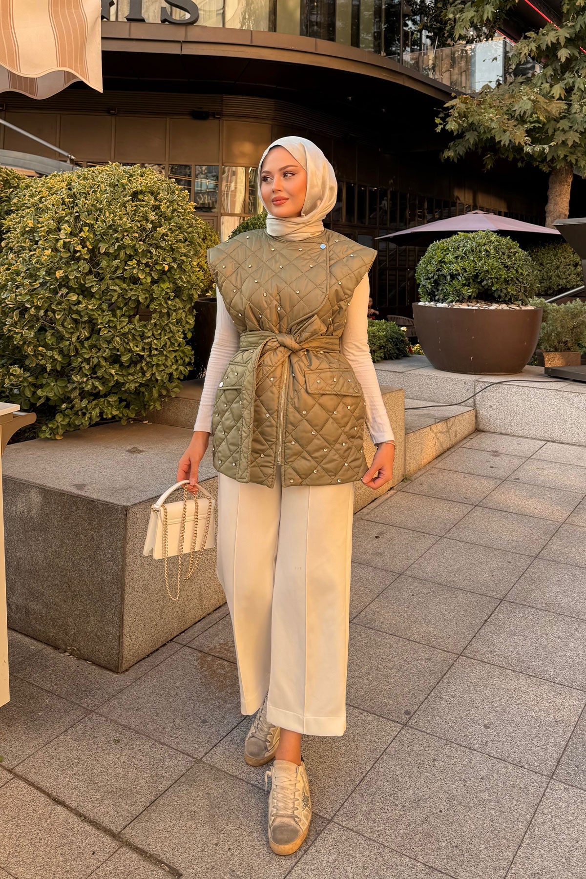 Taş Detaylı Kapitone Yelek Haki Yeşil