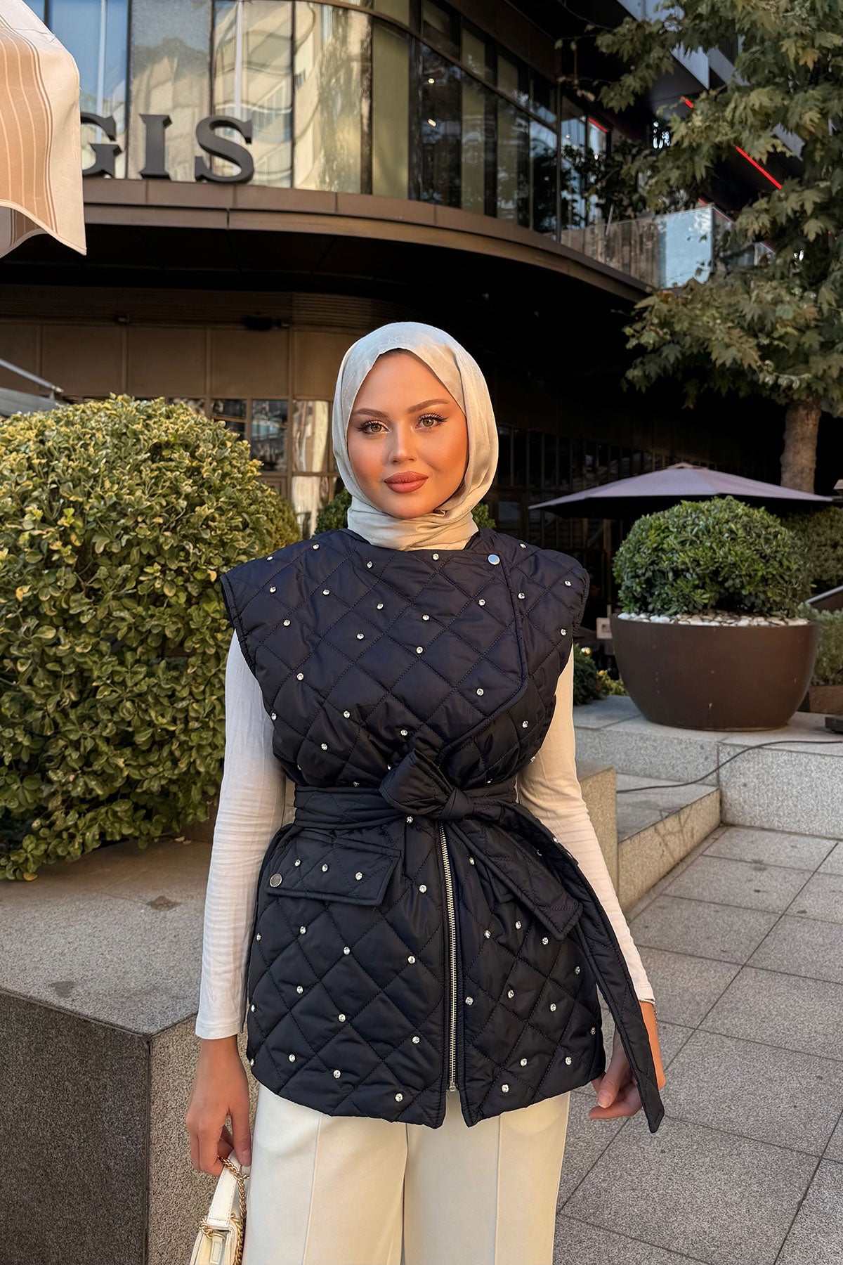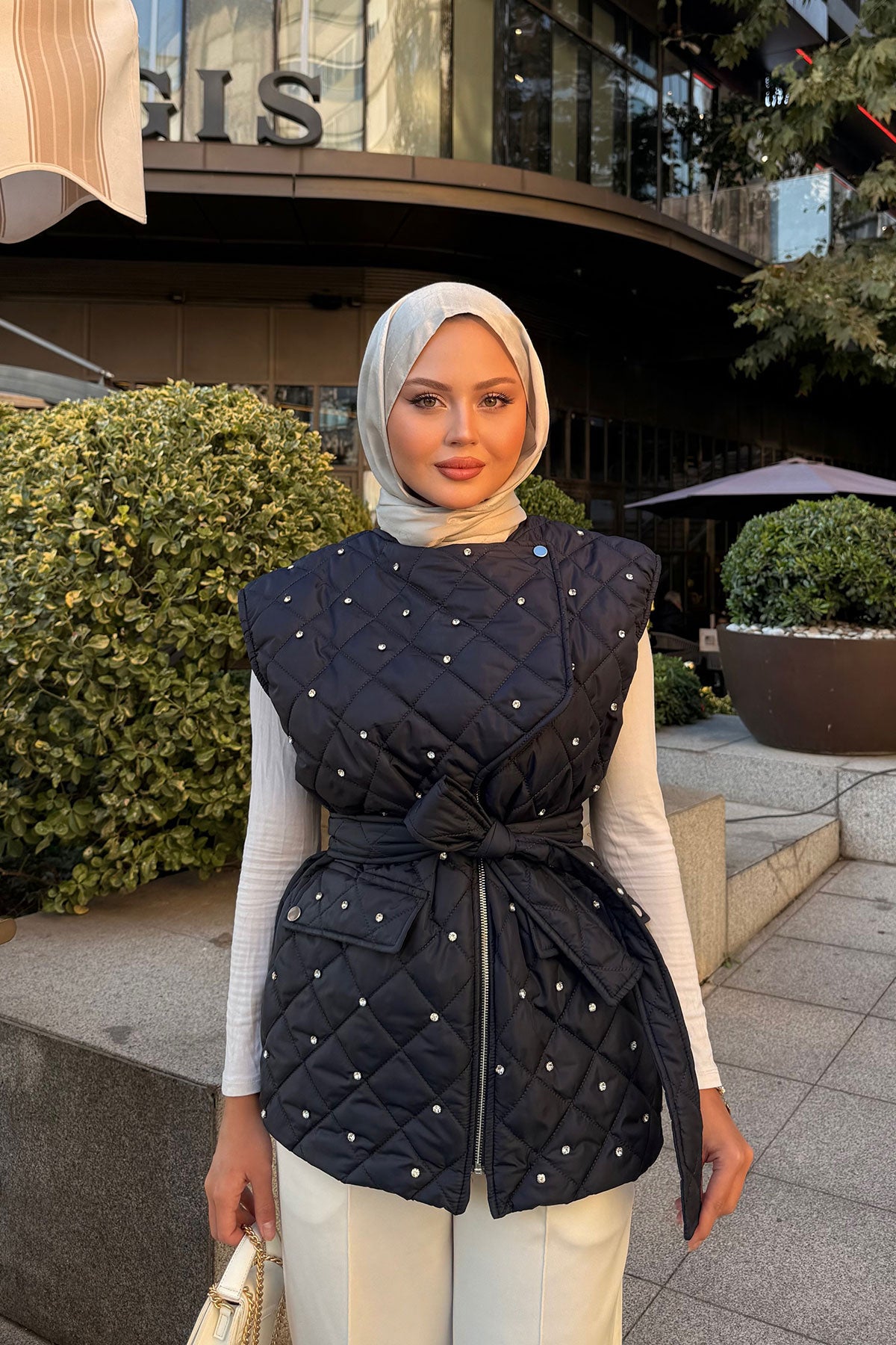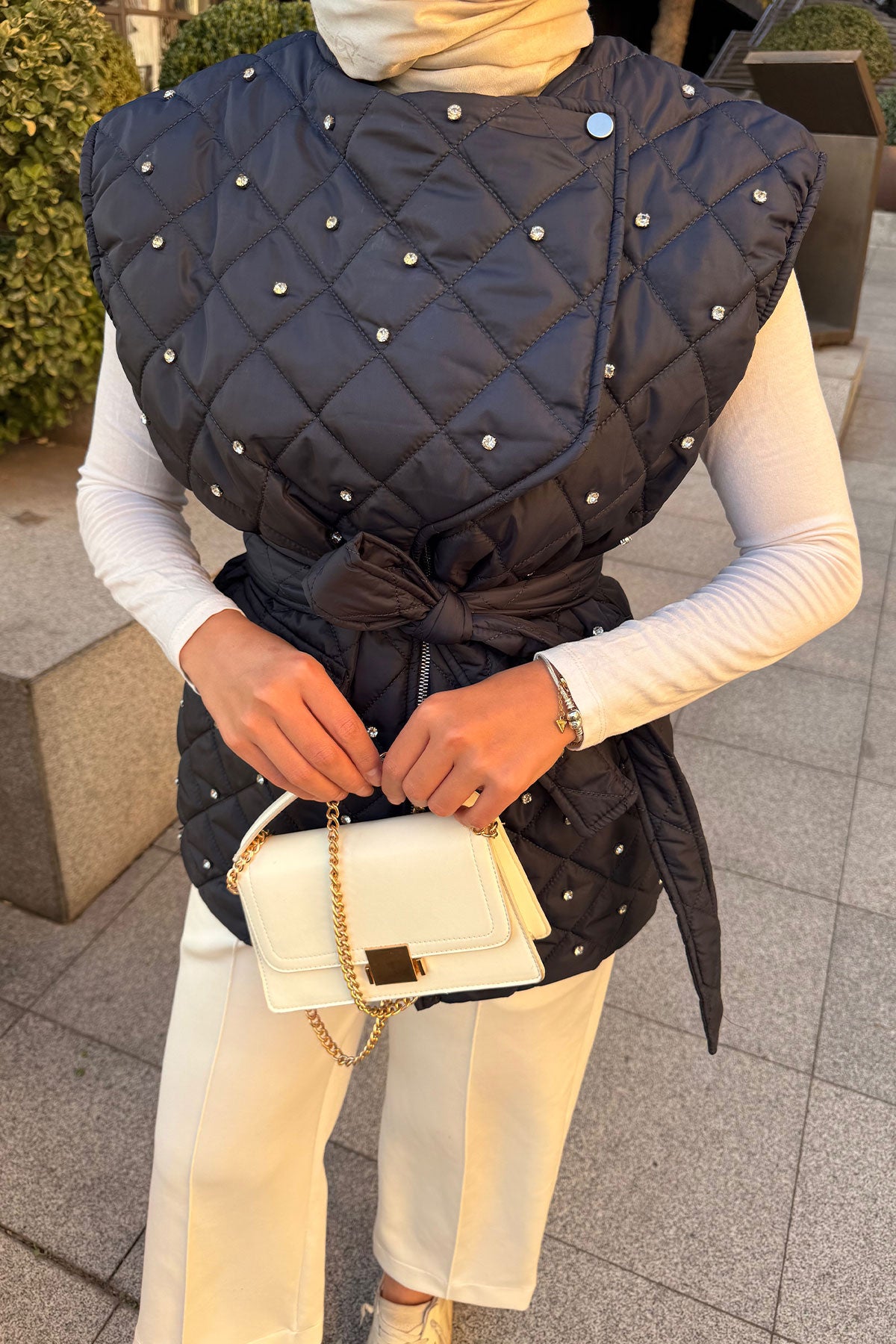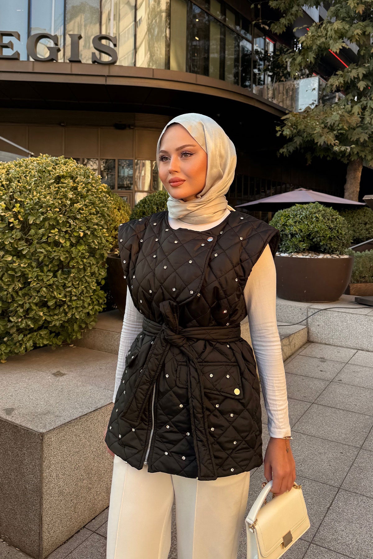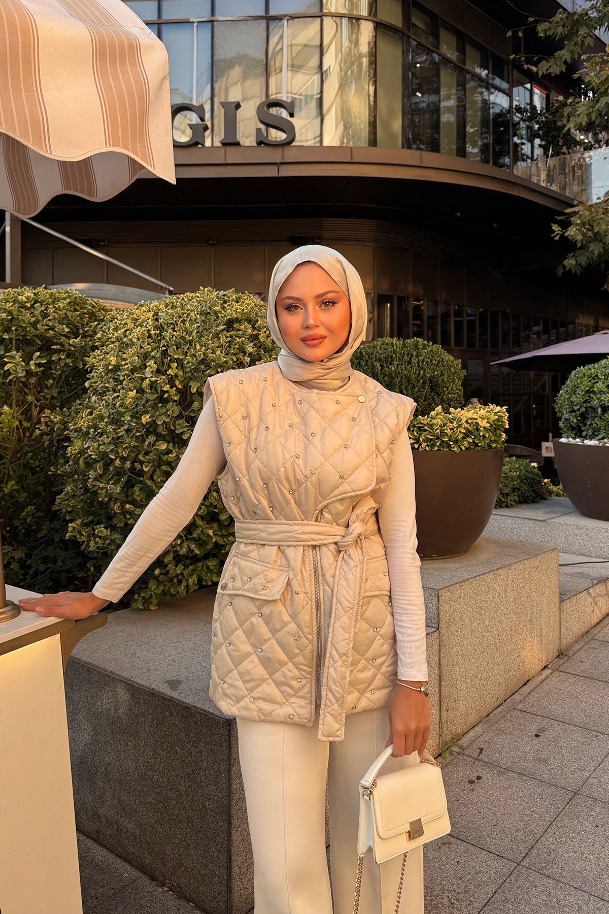 Taş Detaylı Kapitone Yelek Haki Yeşil