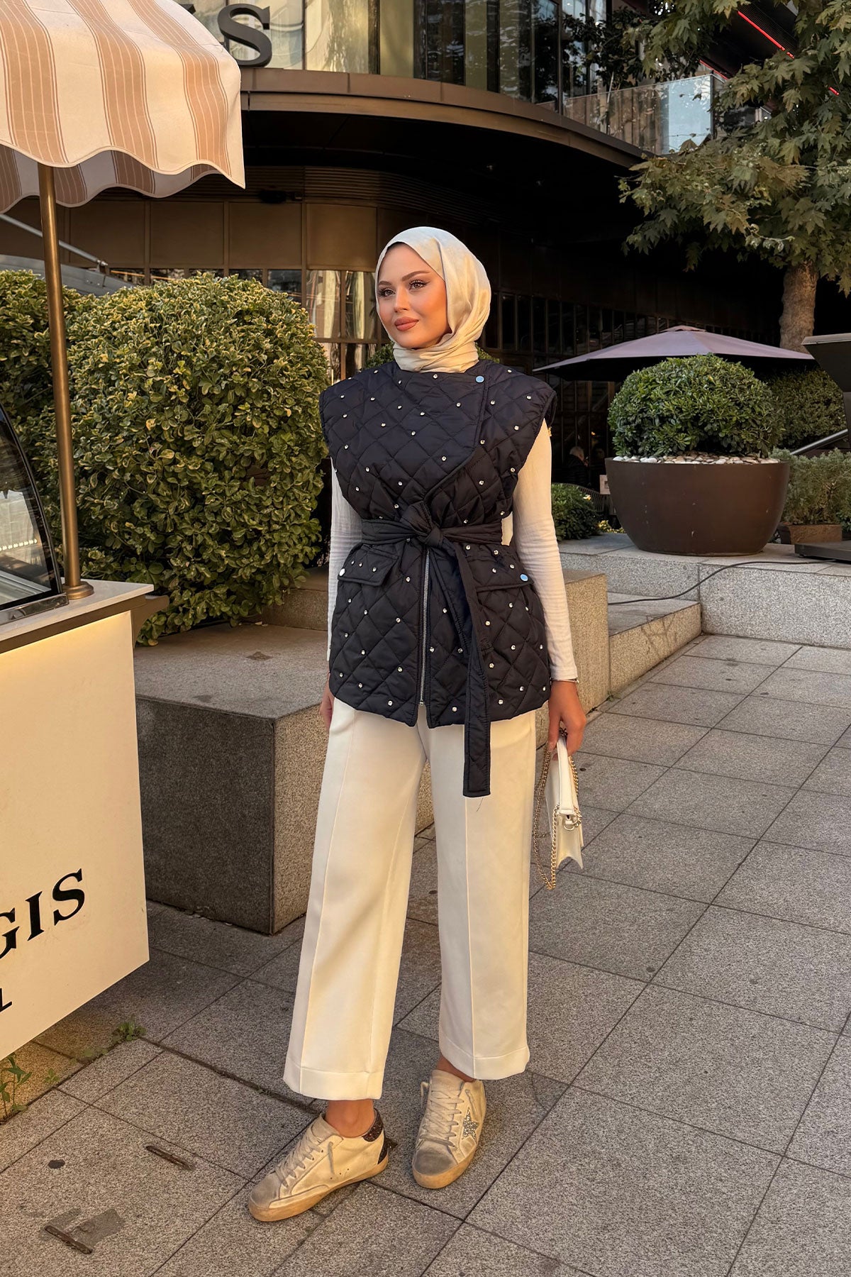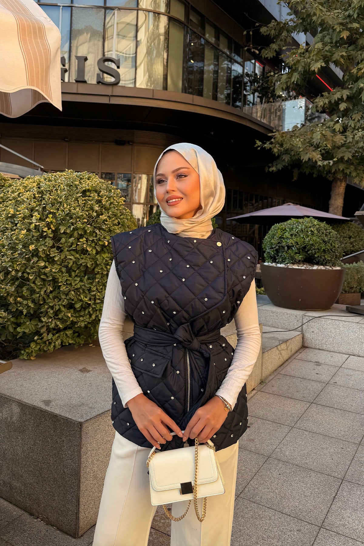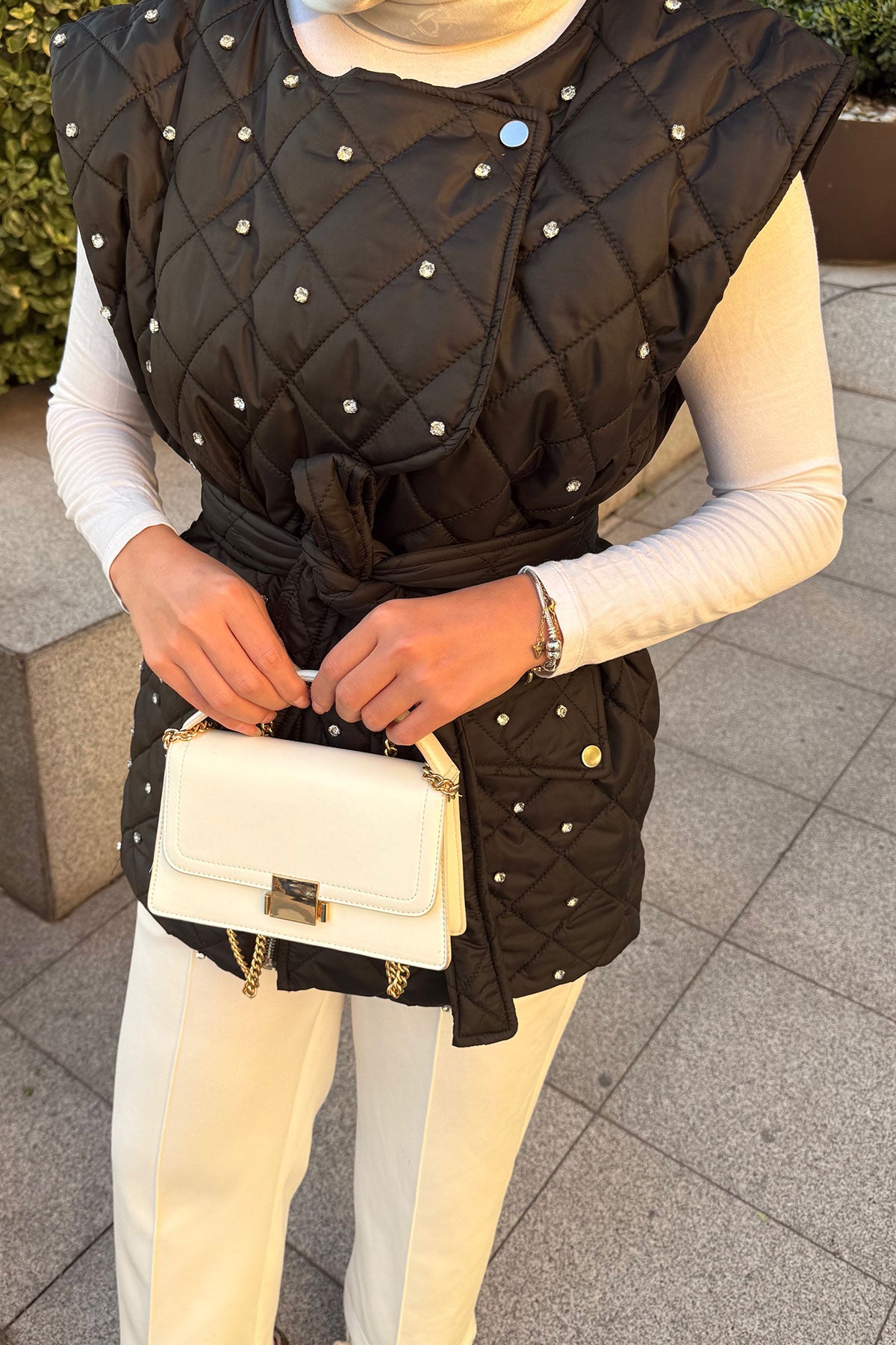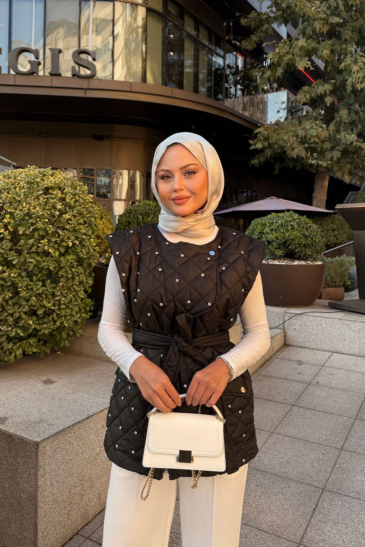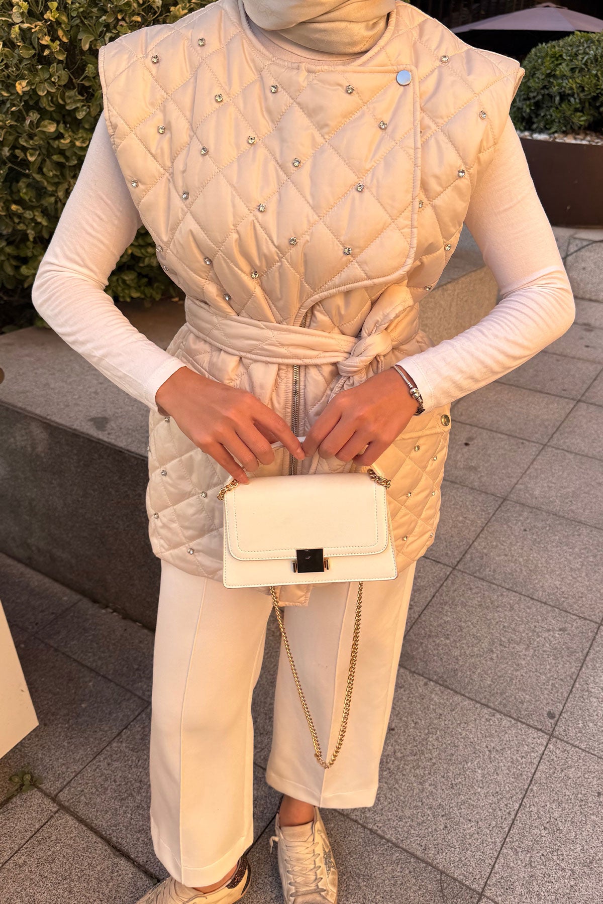 Taş Detaylı Kapitone Yelek Haki Yeşil