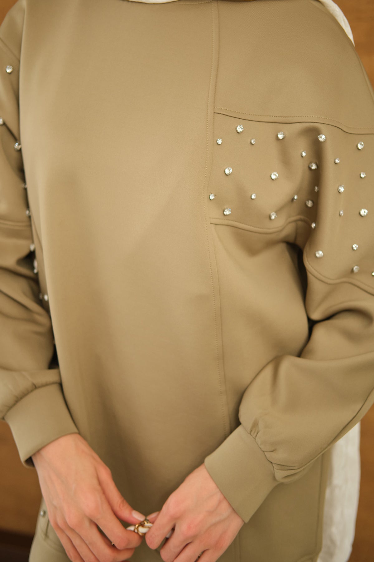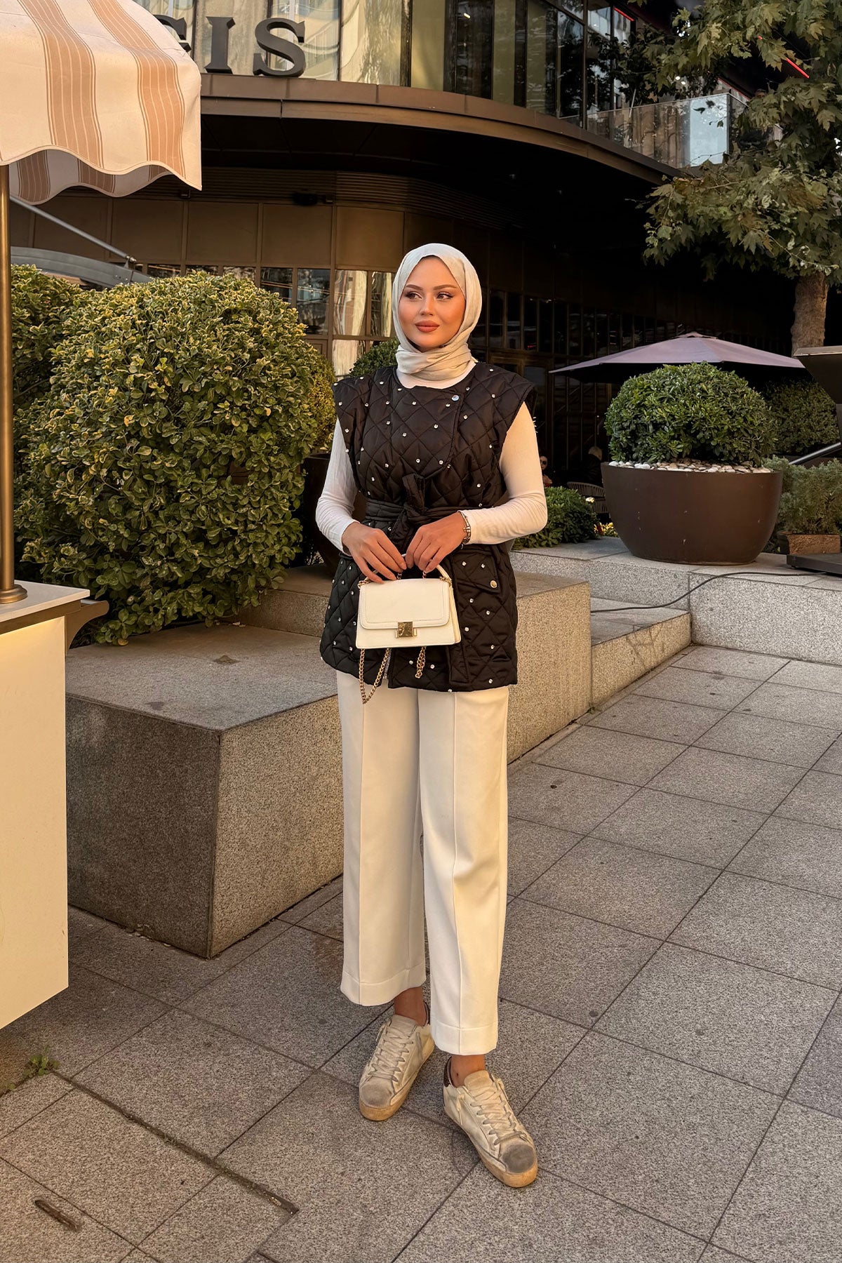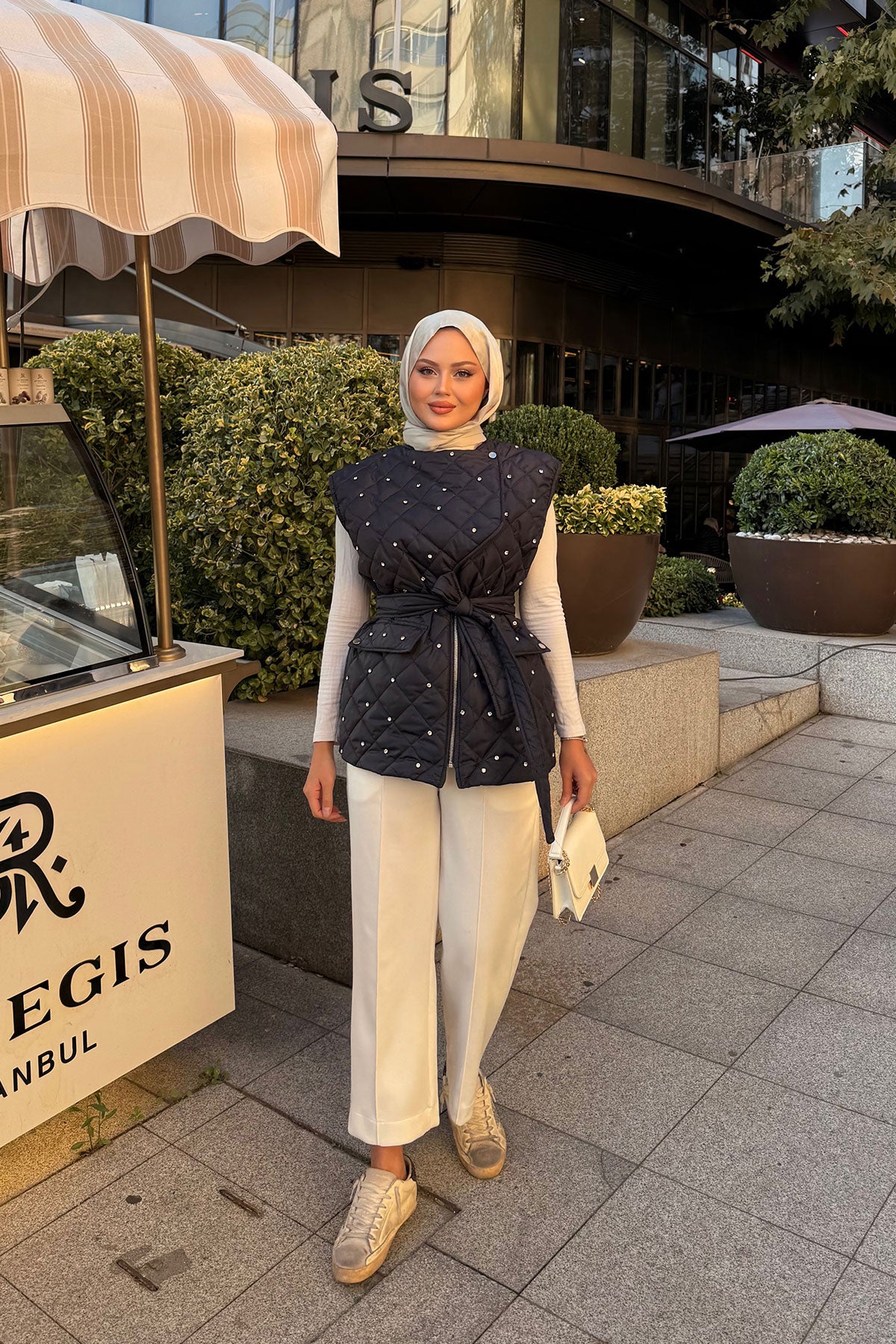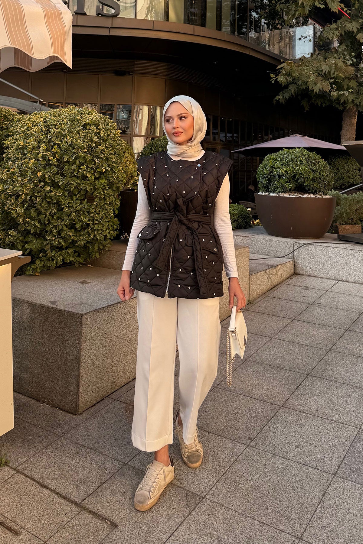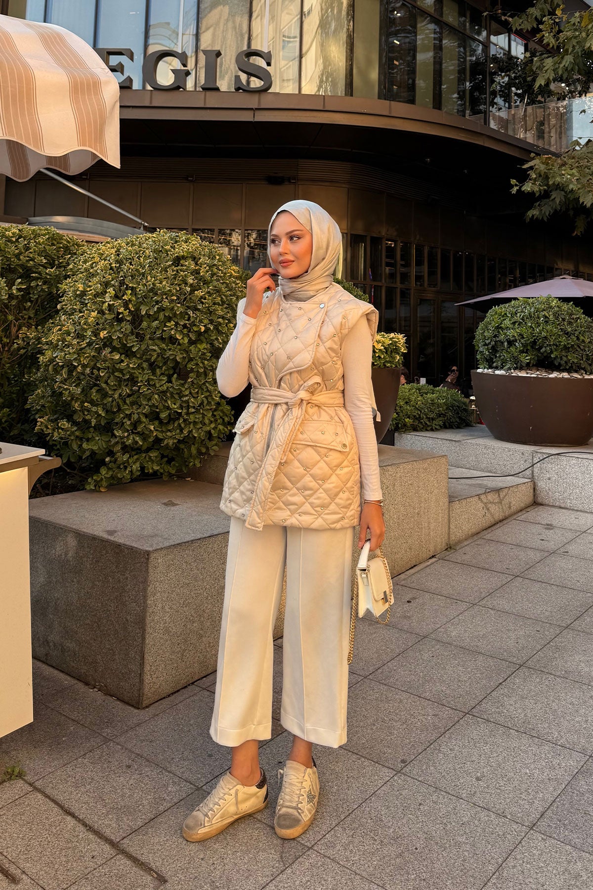 Taş Detaylı Kapitone Yelek Haki Yeşil