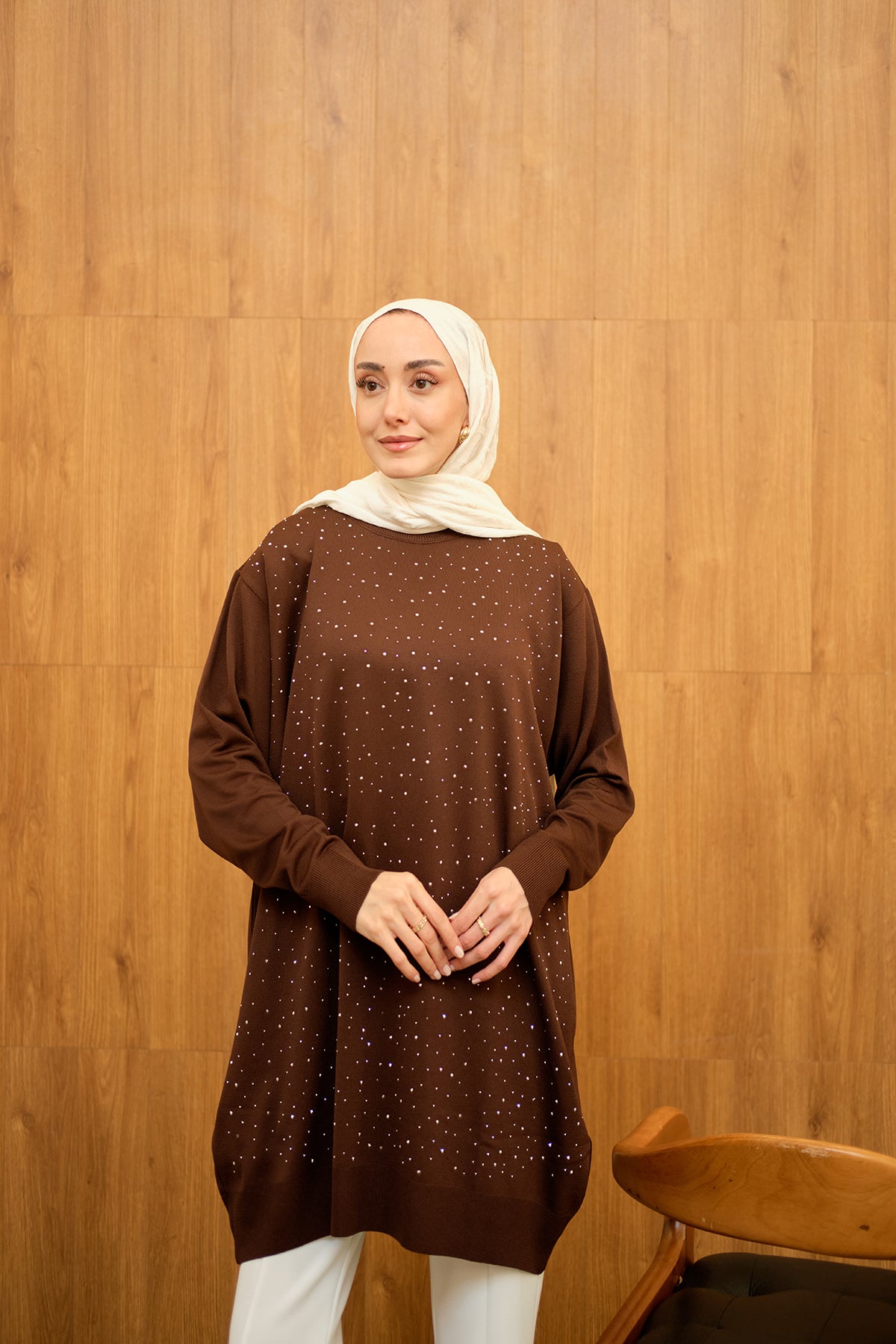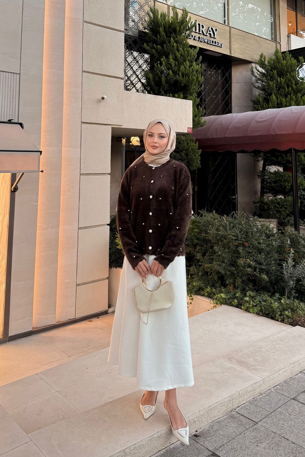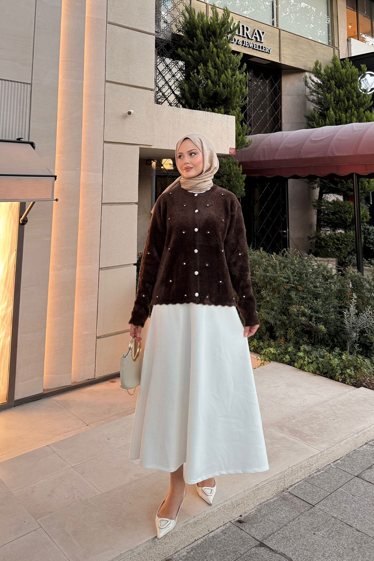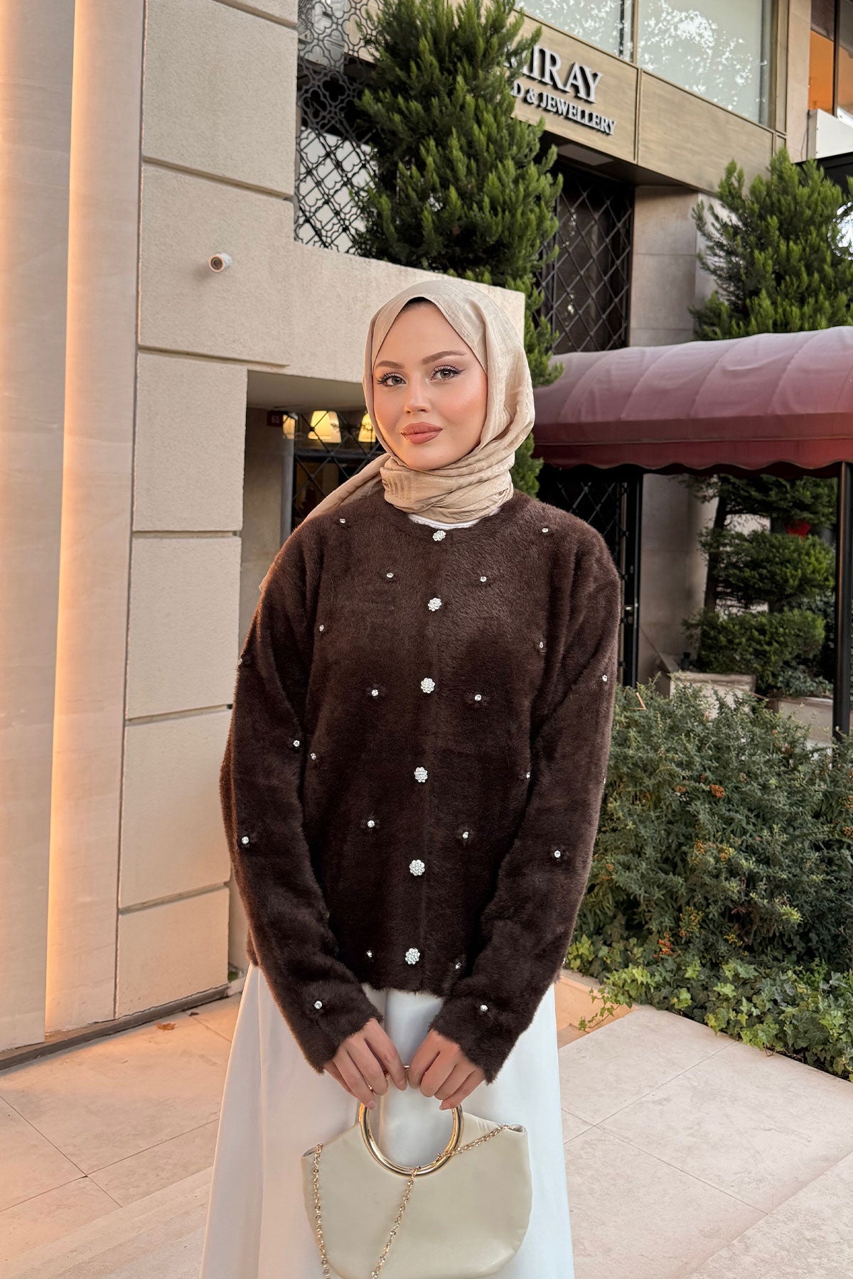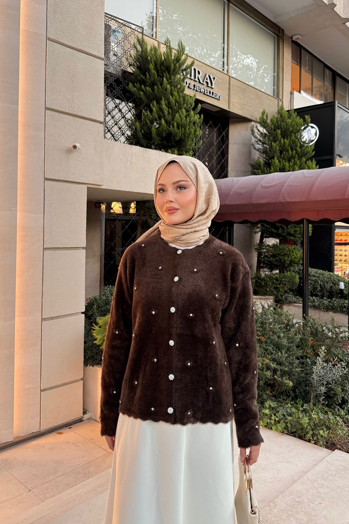 Taşlı Çiçek Düğmeli Hırka Kahverengi