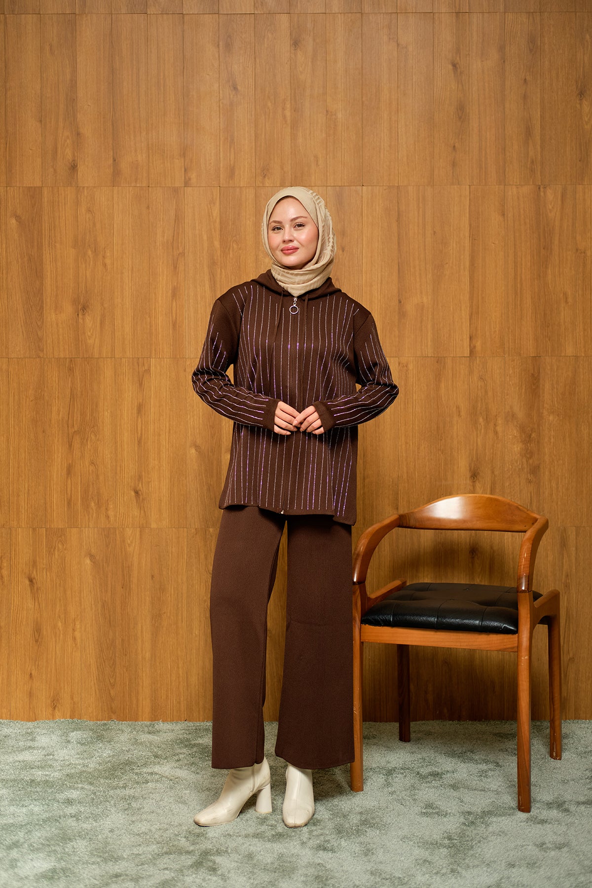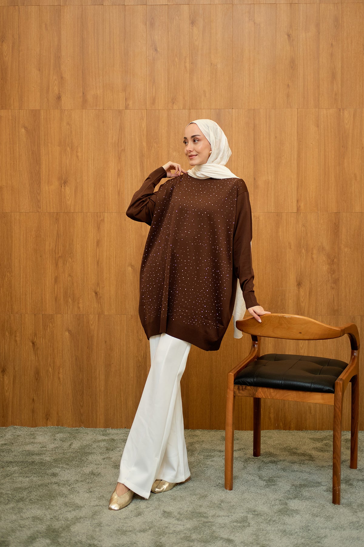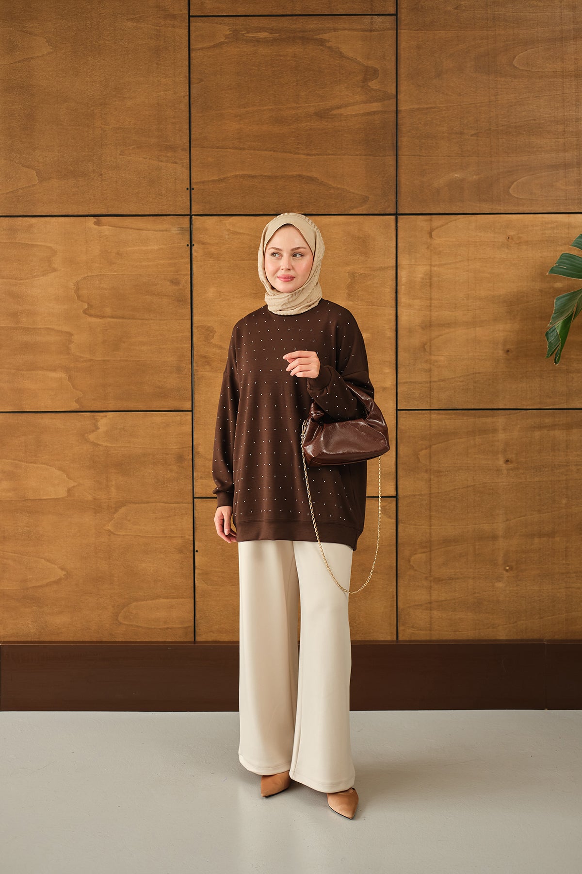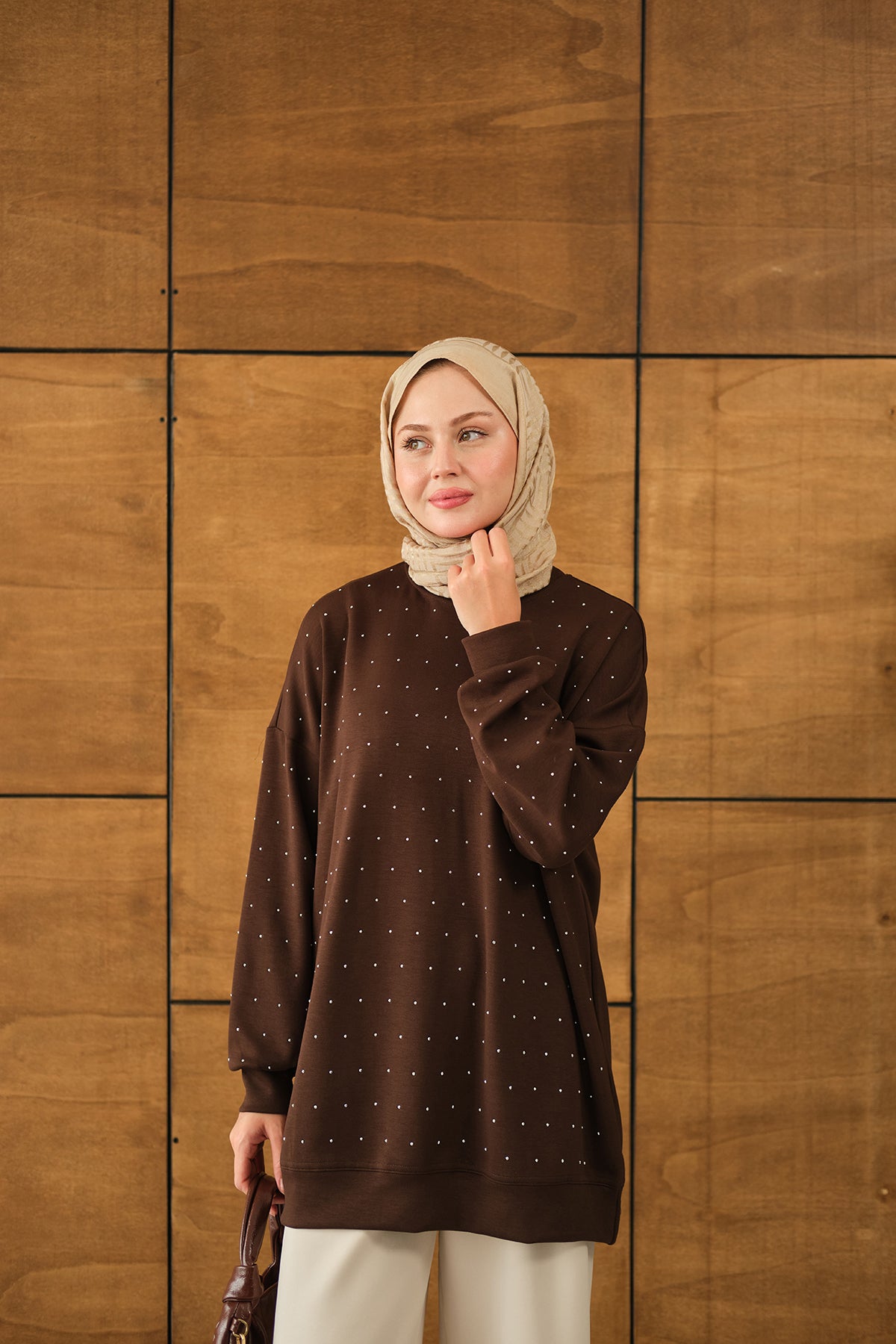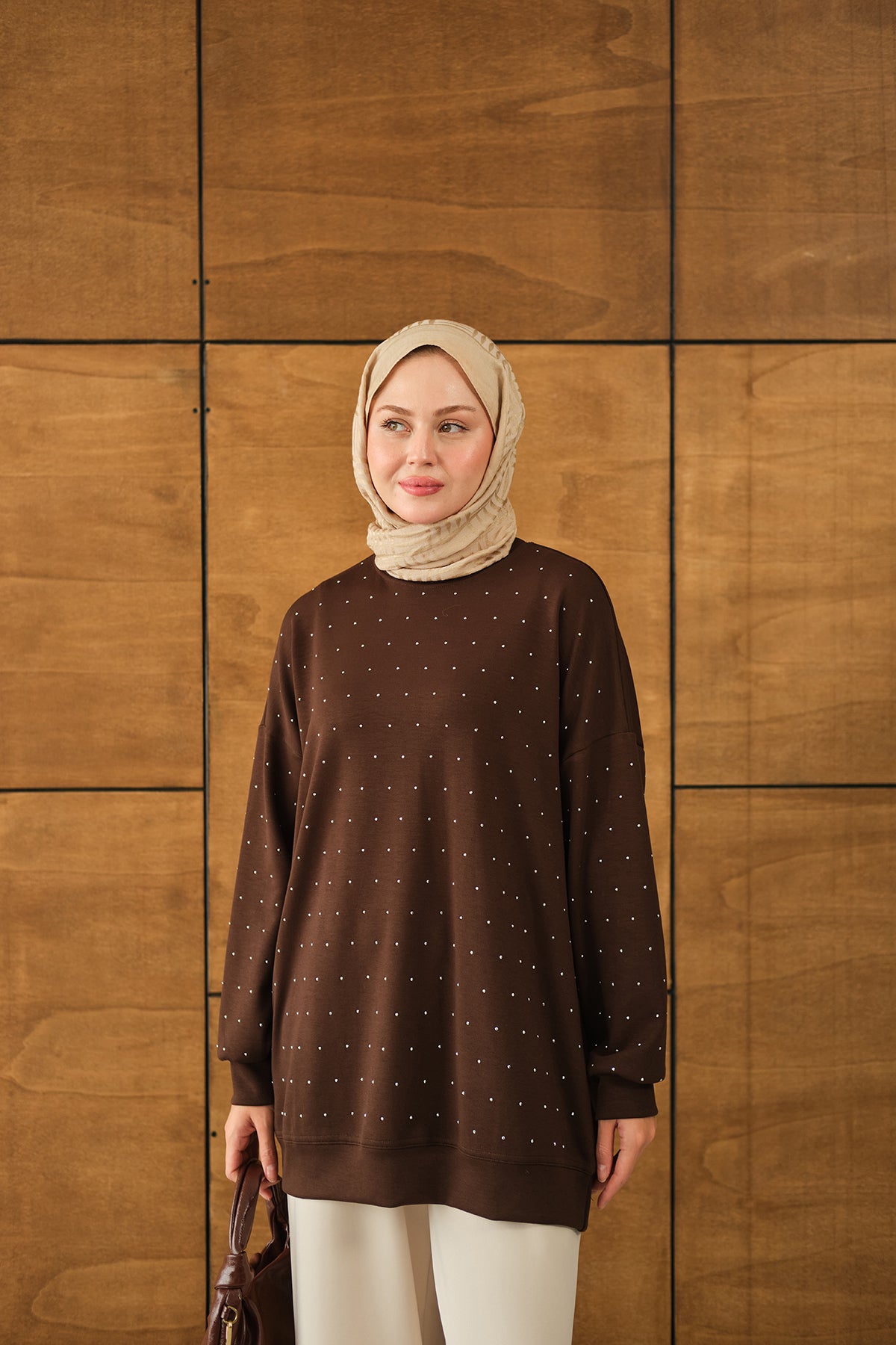 Taşlı Çiçek Düğmeli Hırka Kahverengi