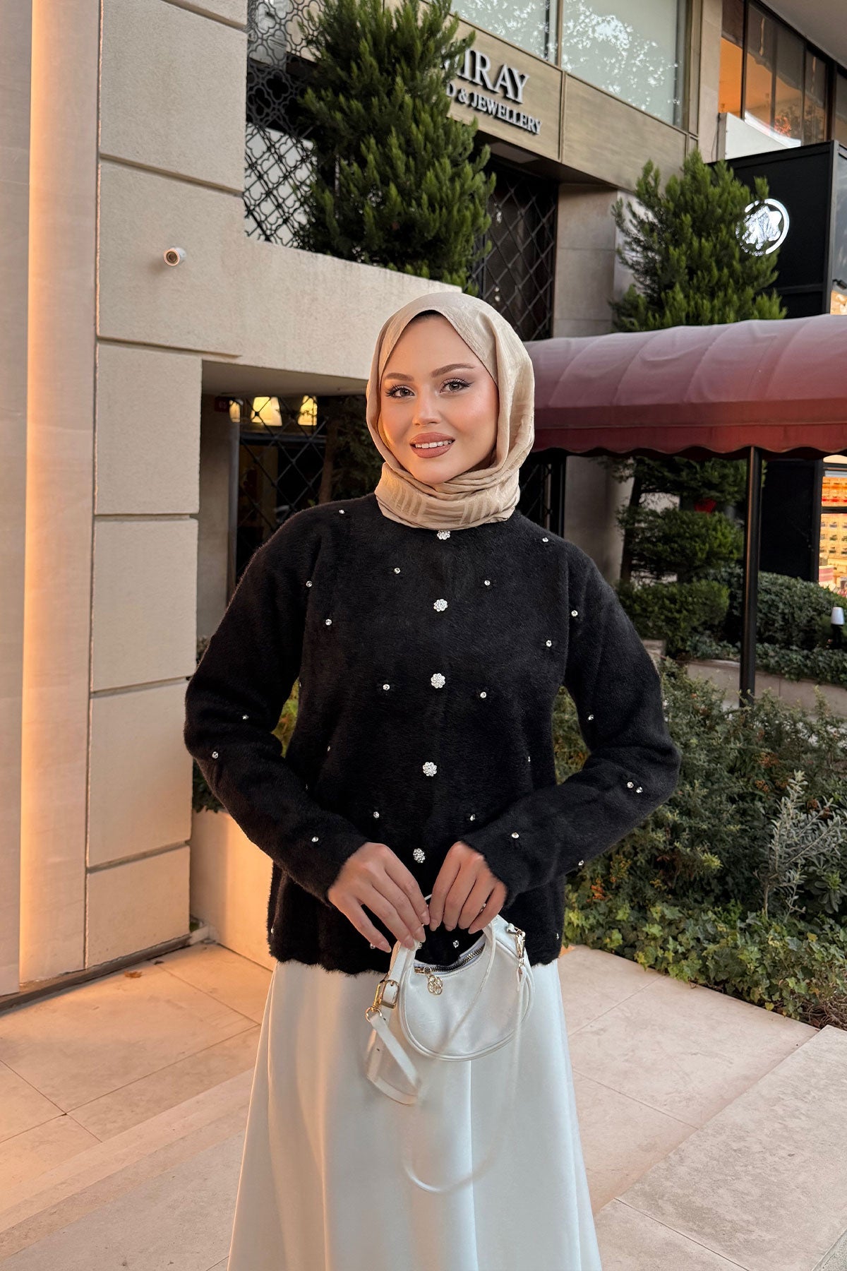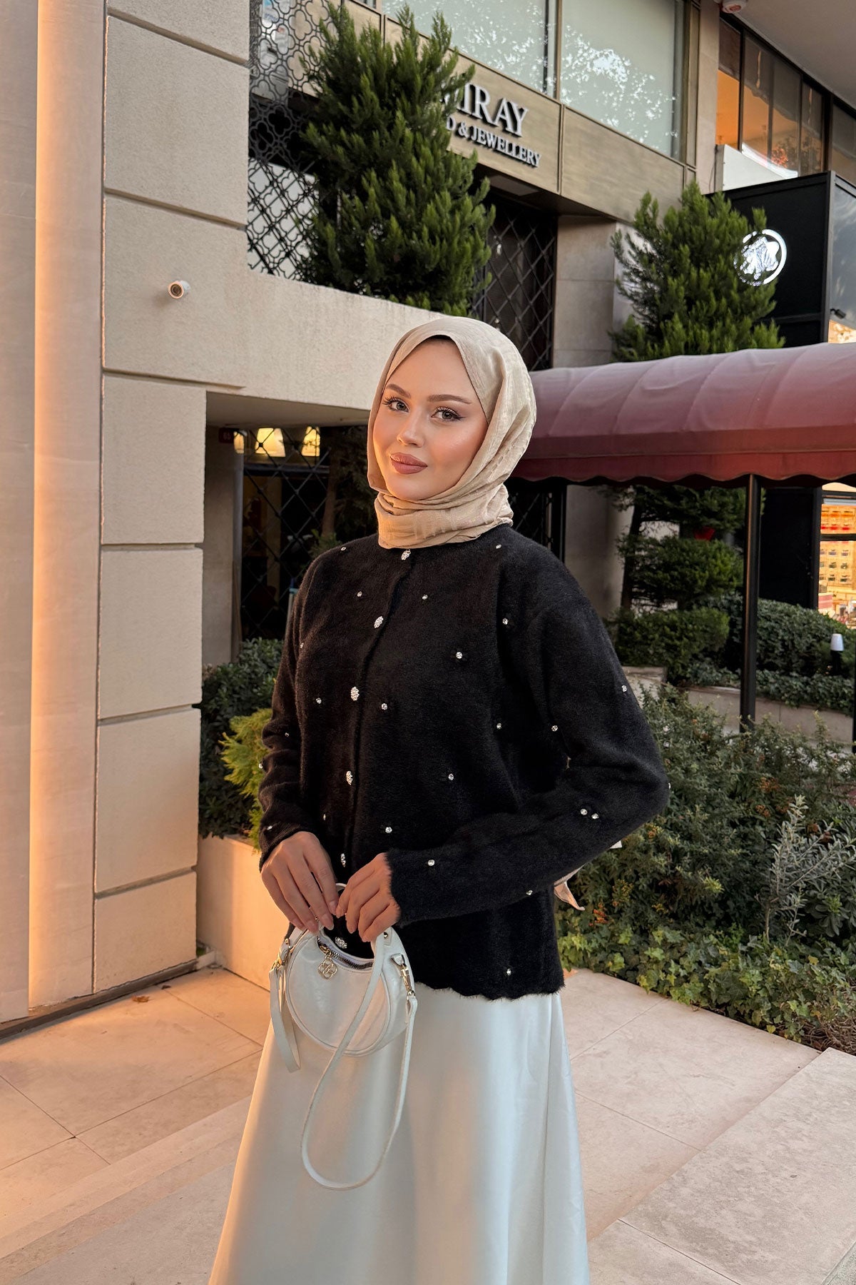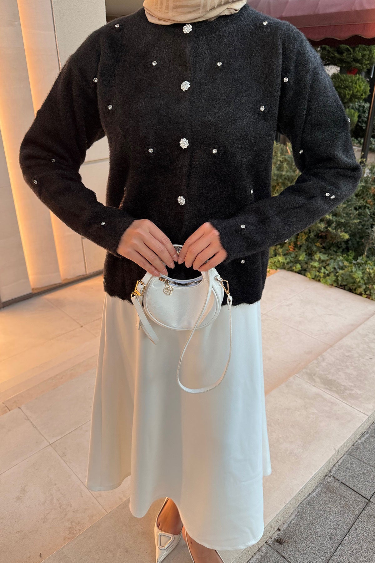 Taşlı Çiçek Düğmeli Hırka Siyah