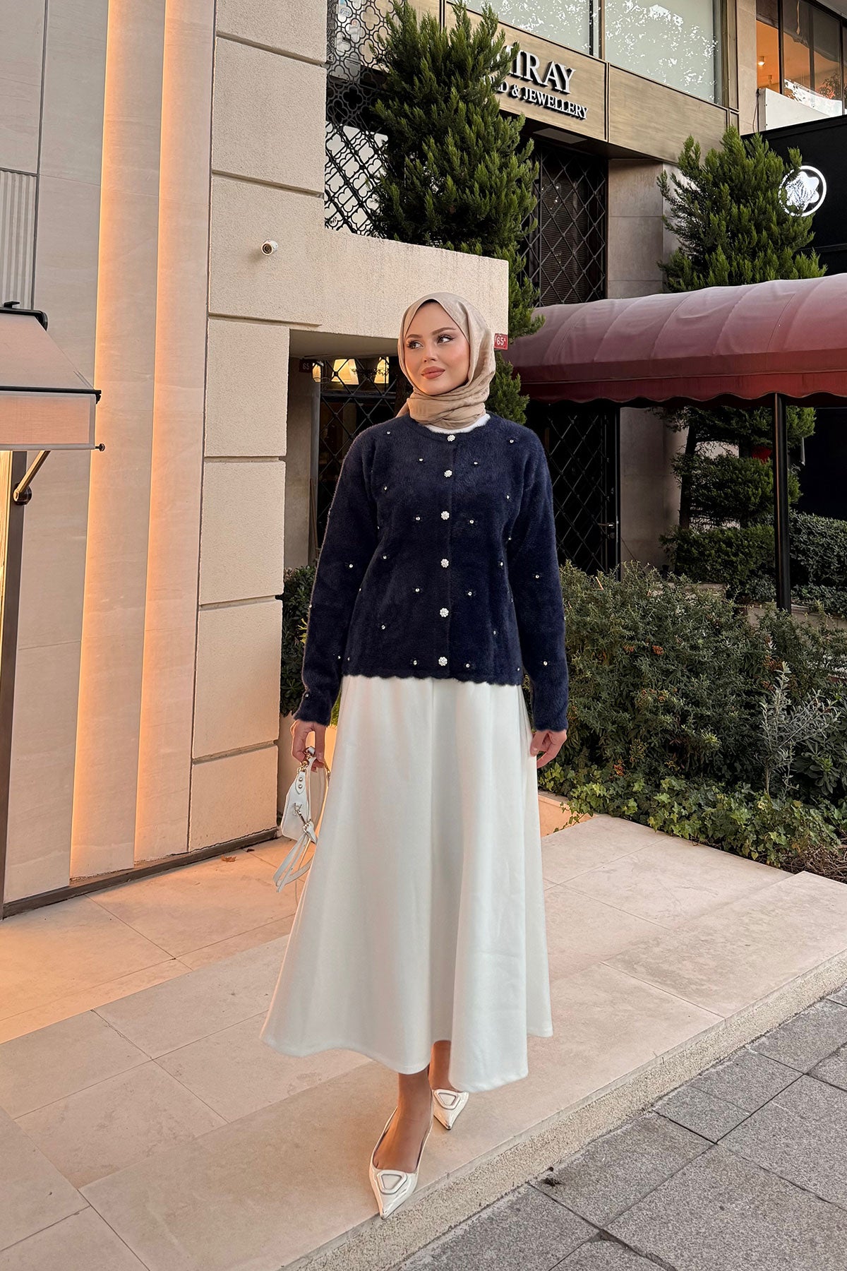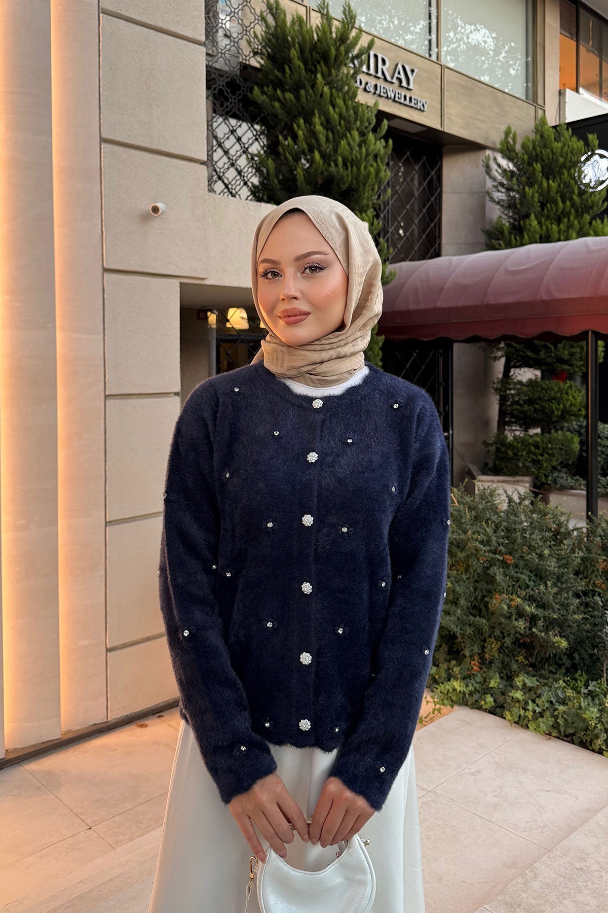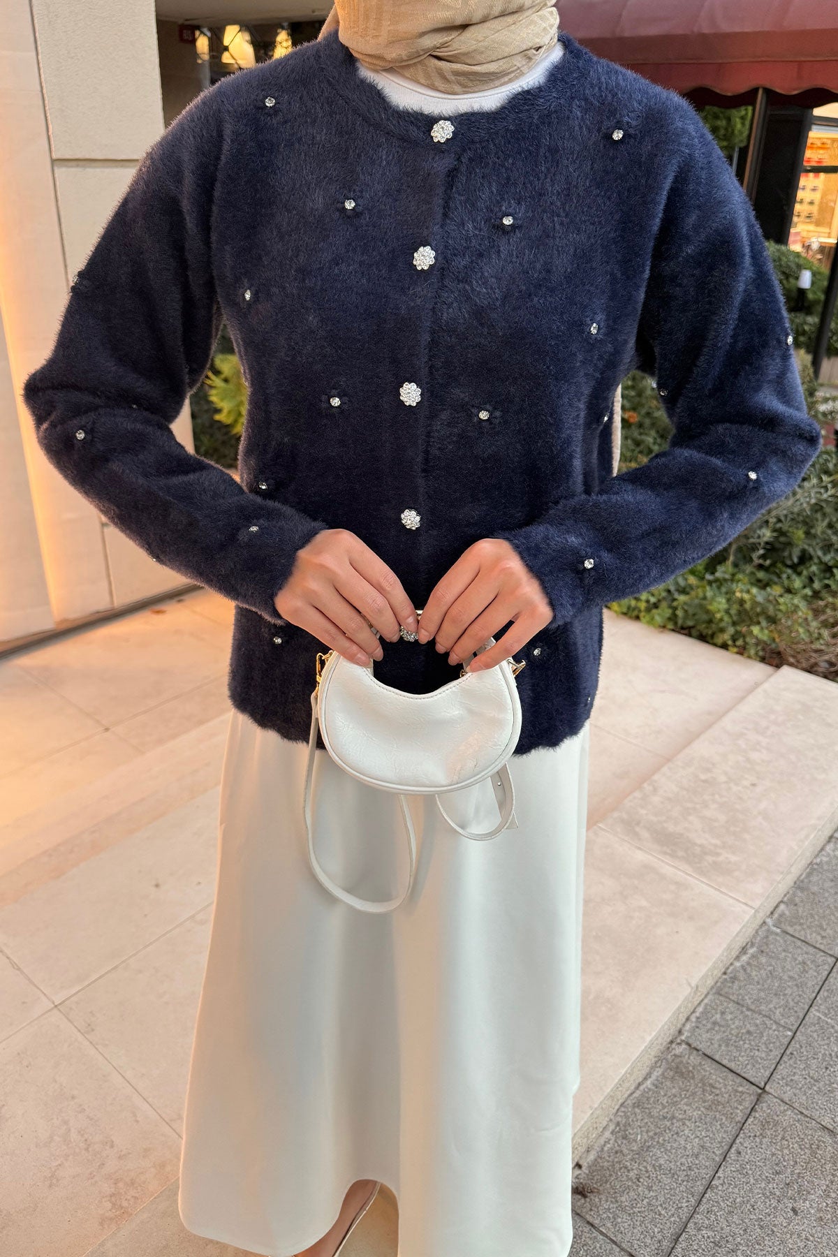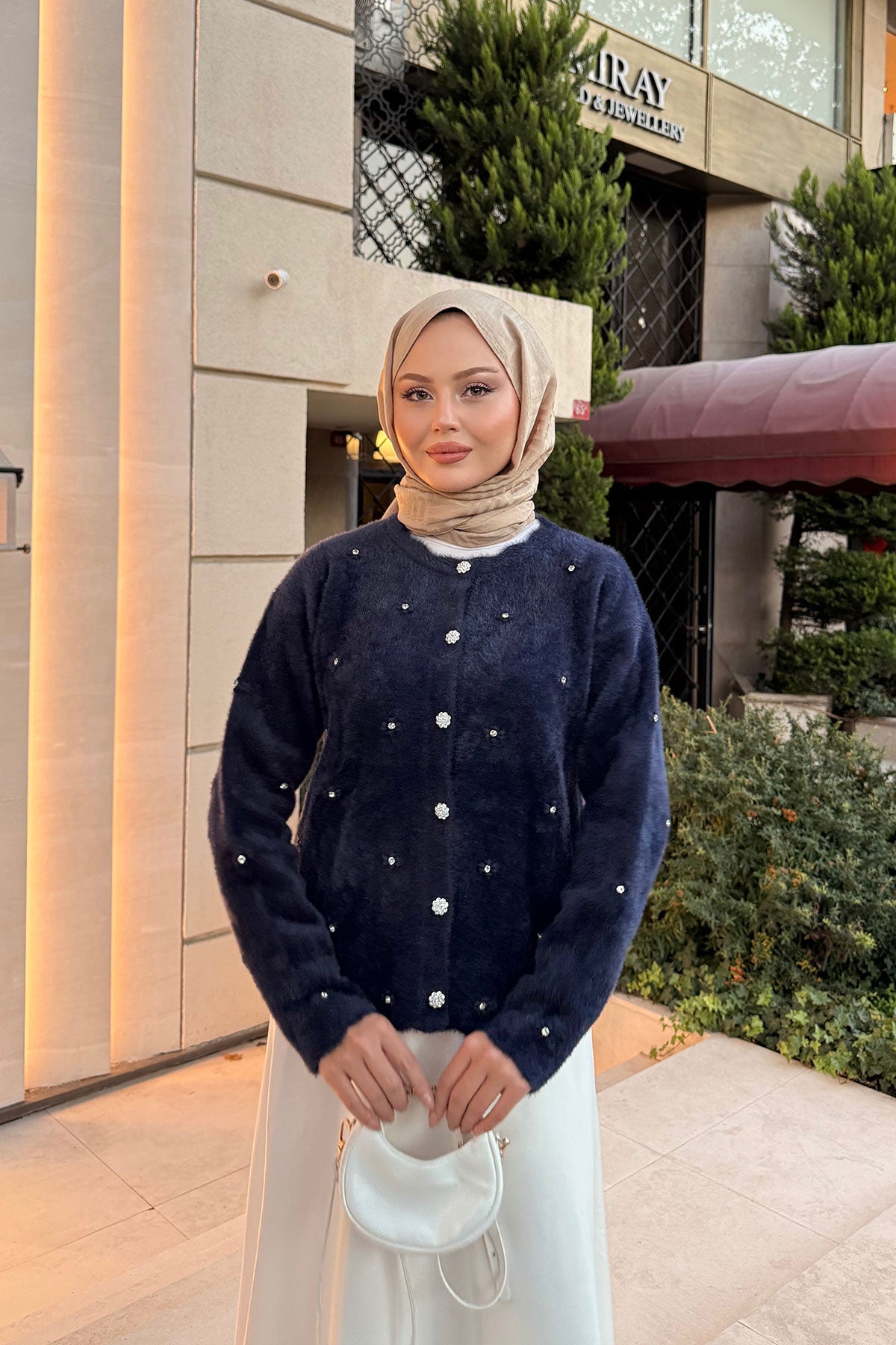 Taşlı Çiçek Düğmeli Hırka Lacivert