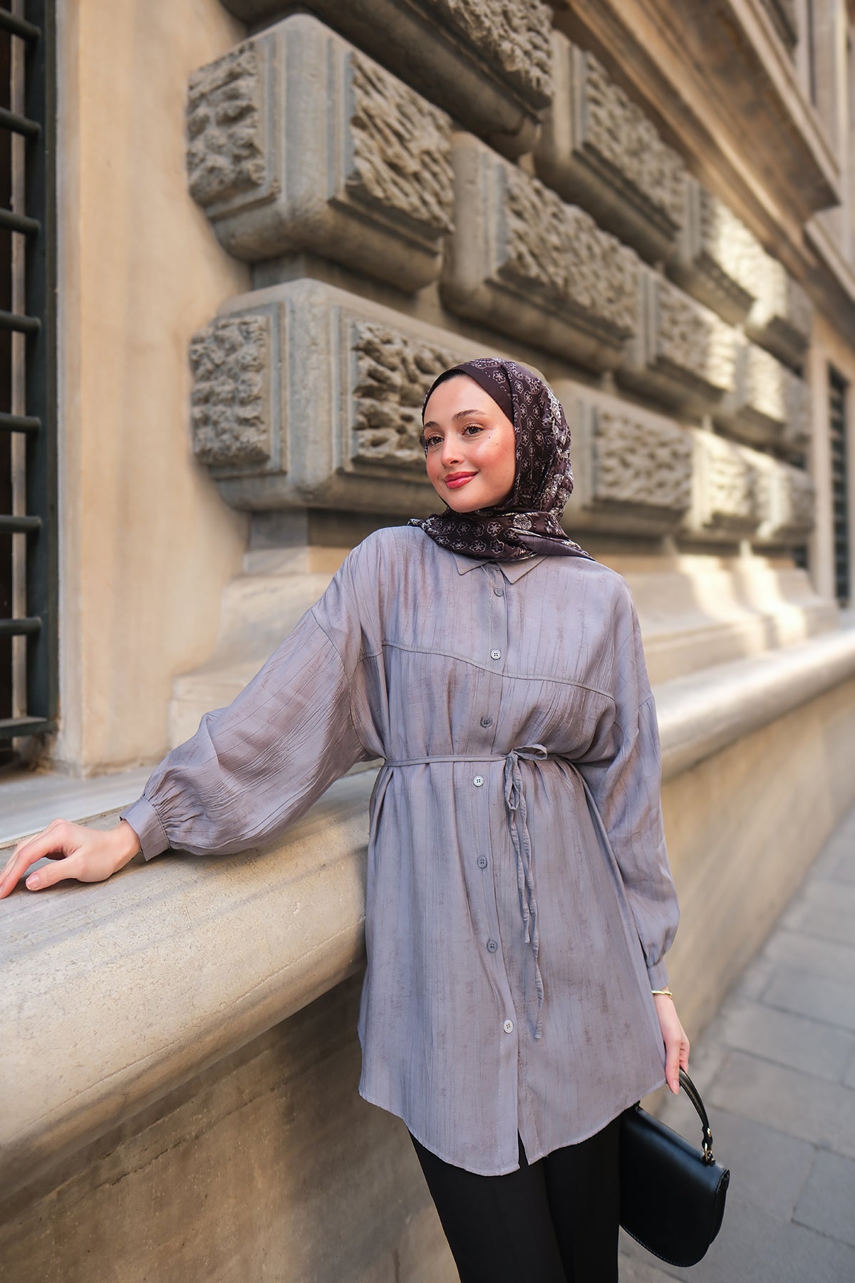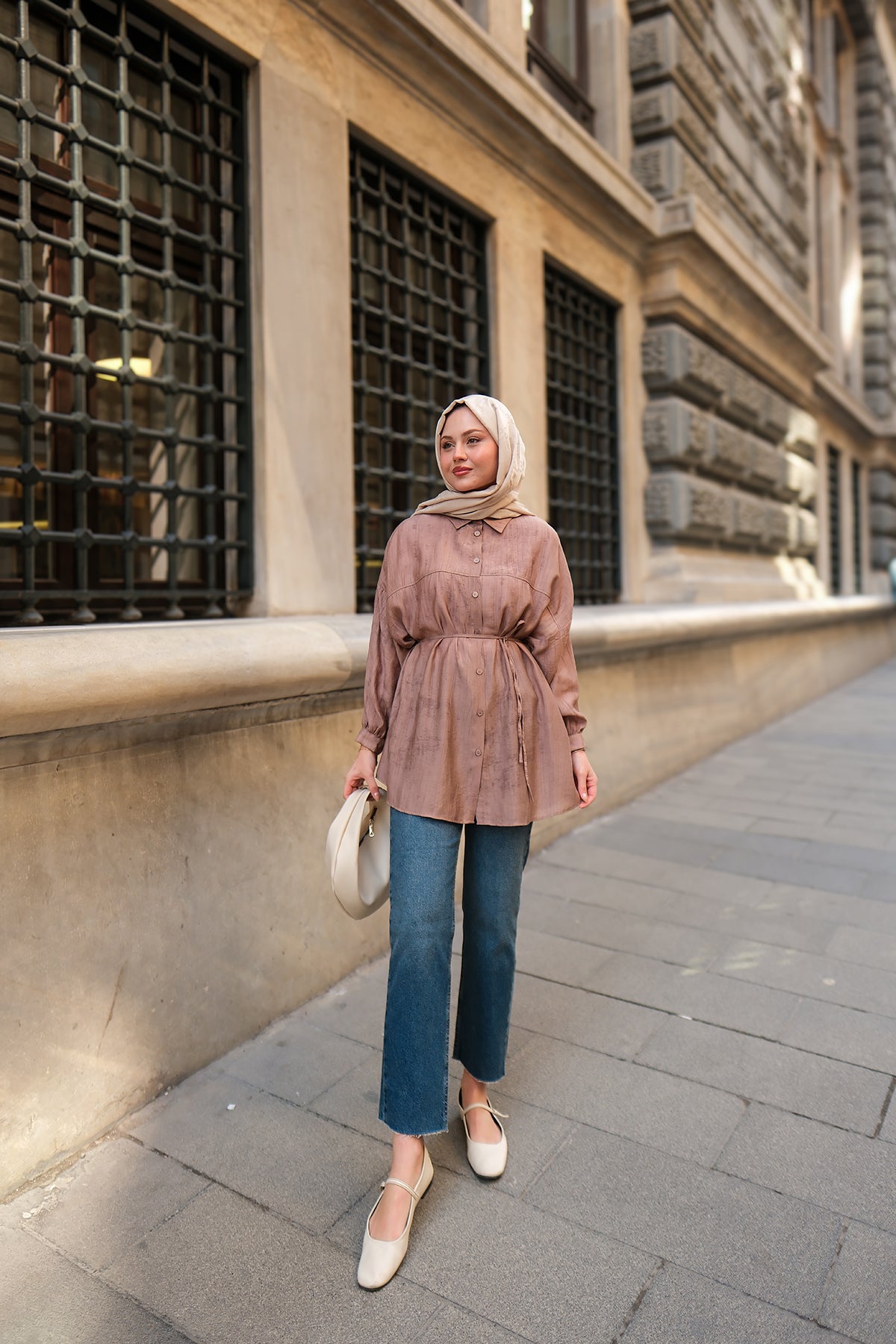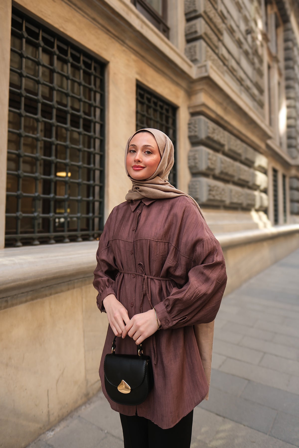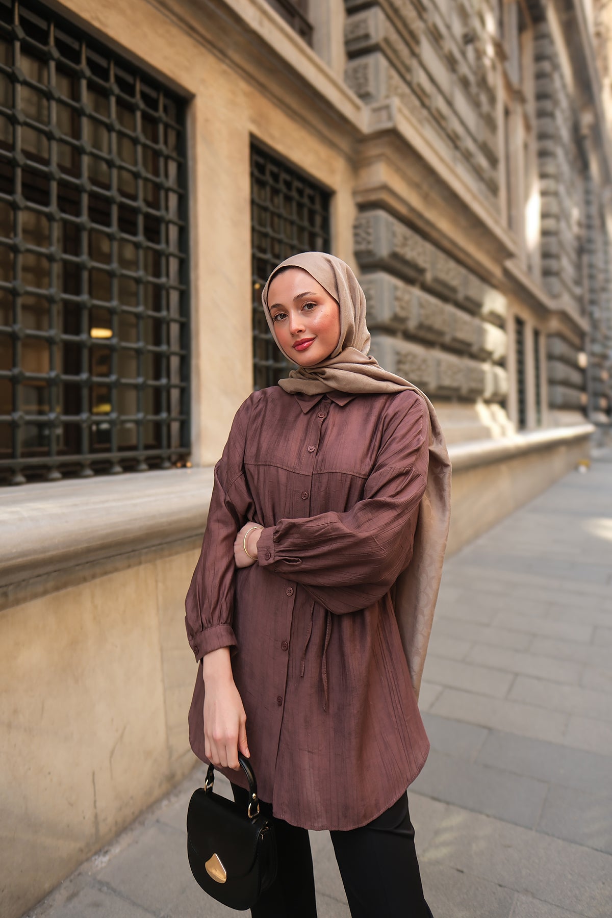 Taupe Shirt with Cape Sleeve and Hidden Buttons