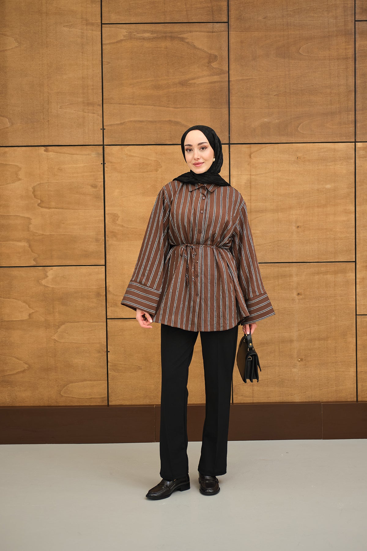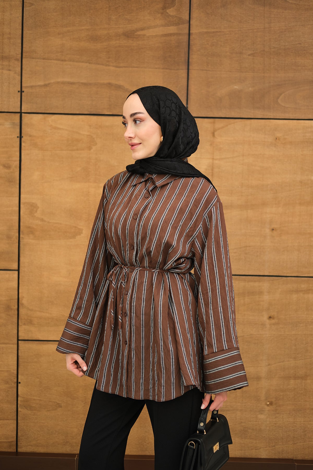 Thick Striped Pattern - Waist-Tied - Chiffon Shirt - Brown