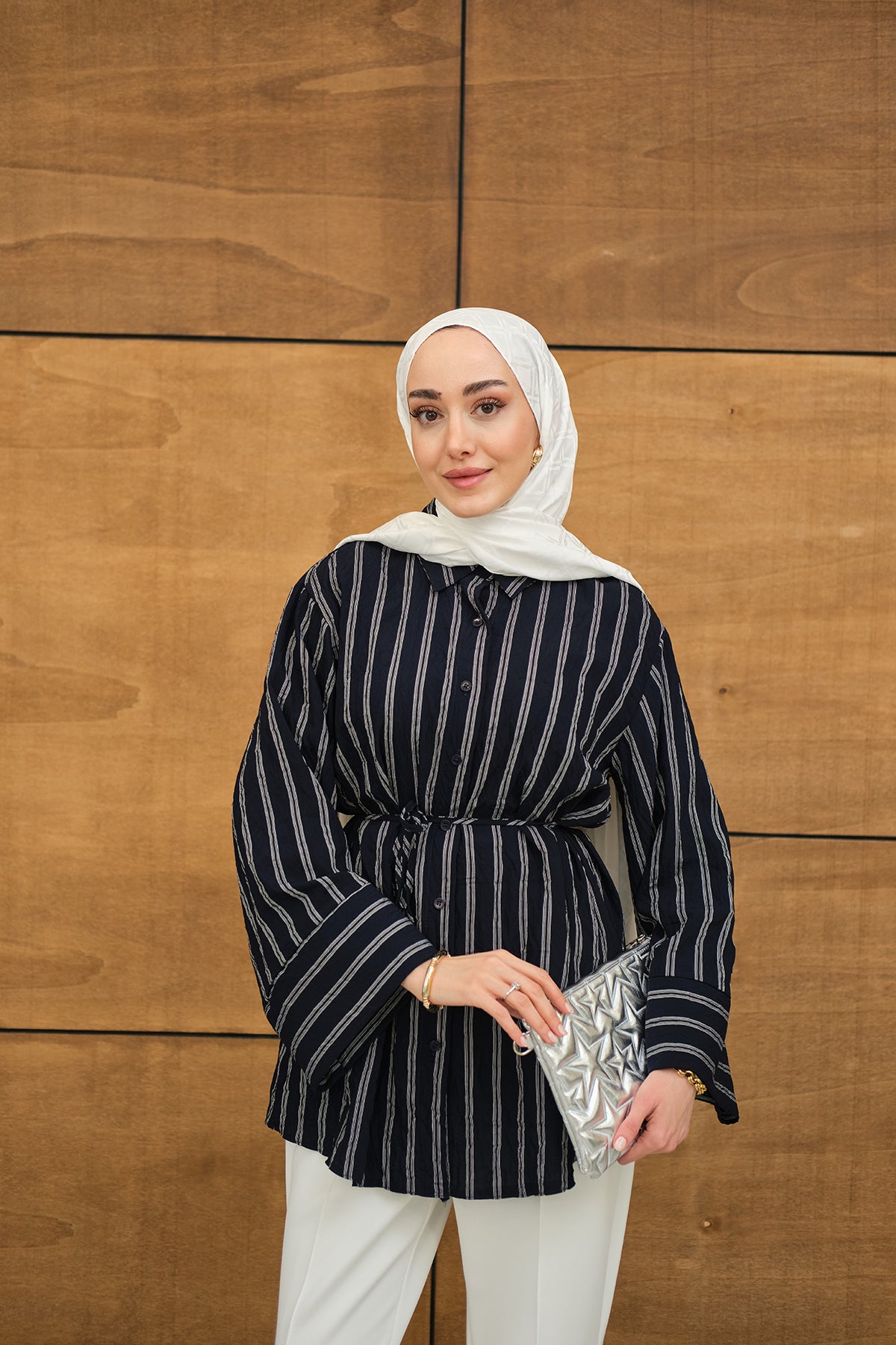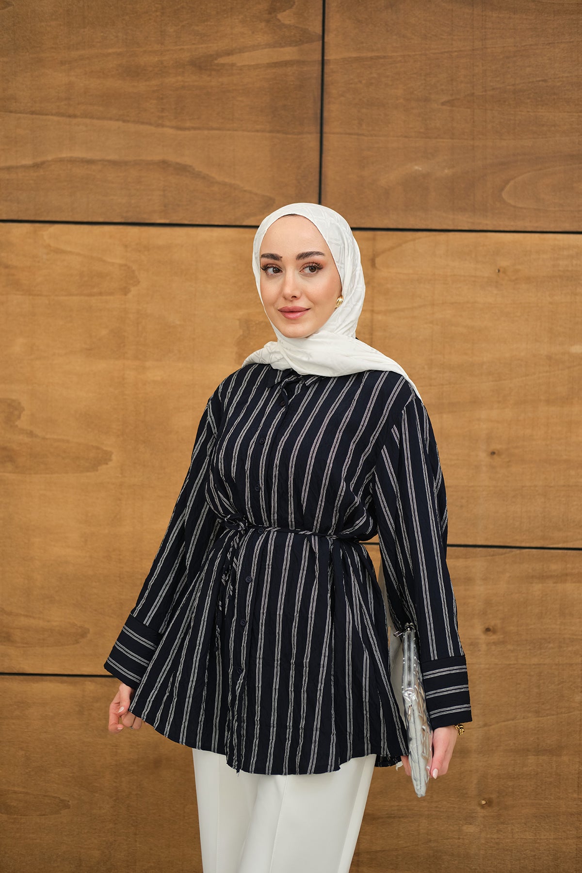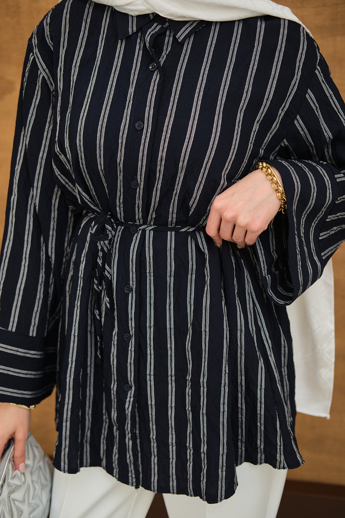 Thick Striped Pattern - Waist-Tied - Chiffon Shirt - Navy Blue