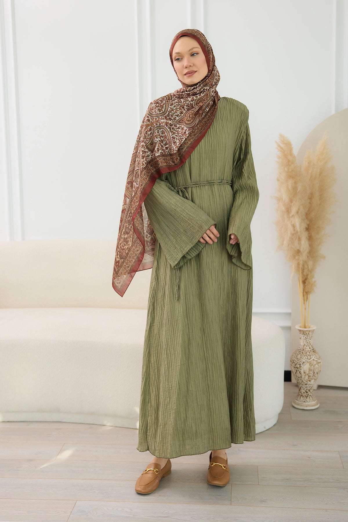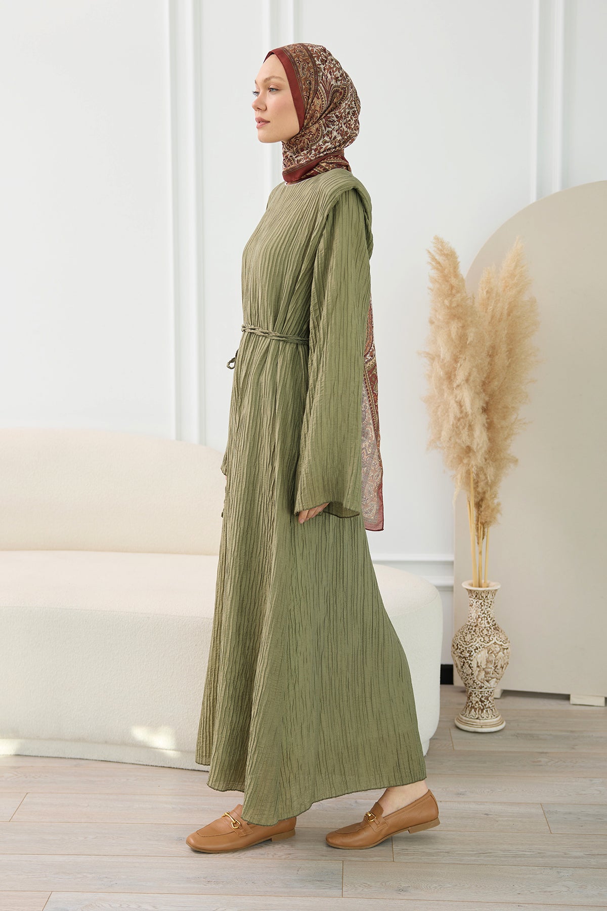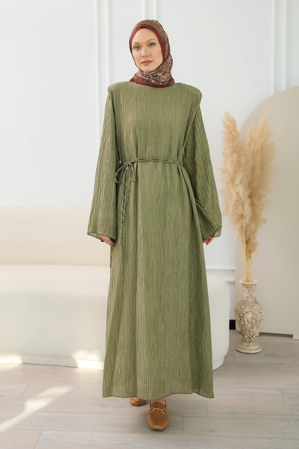 Textured Fabric Padded Shoulder Dress in Khaki Green