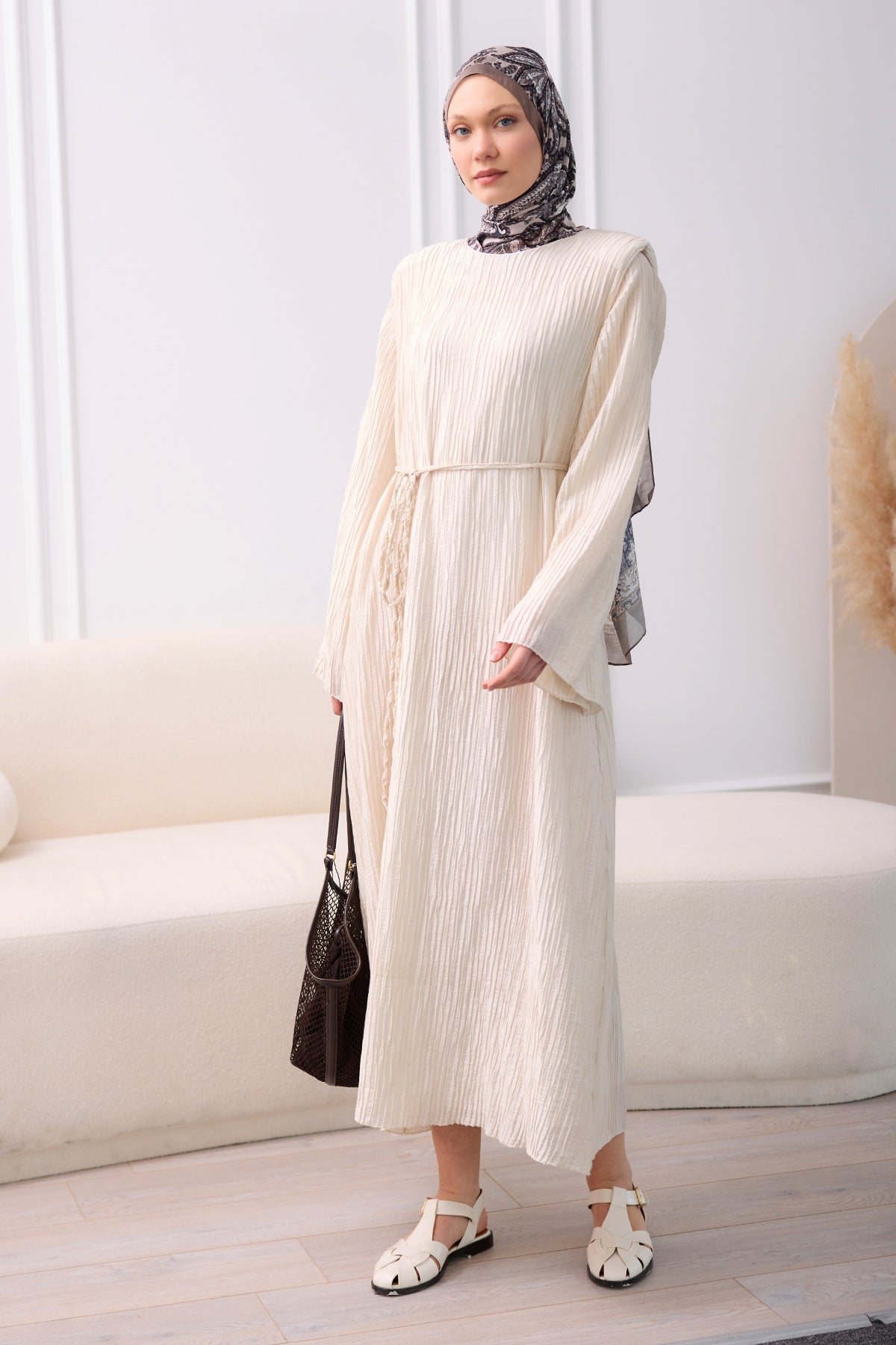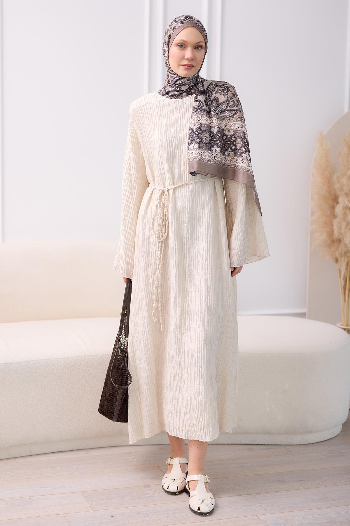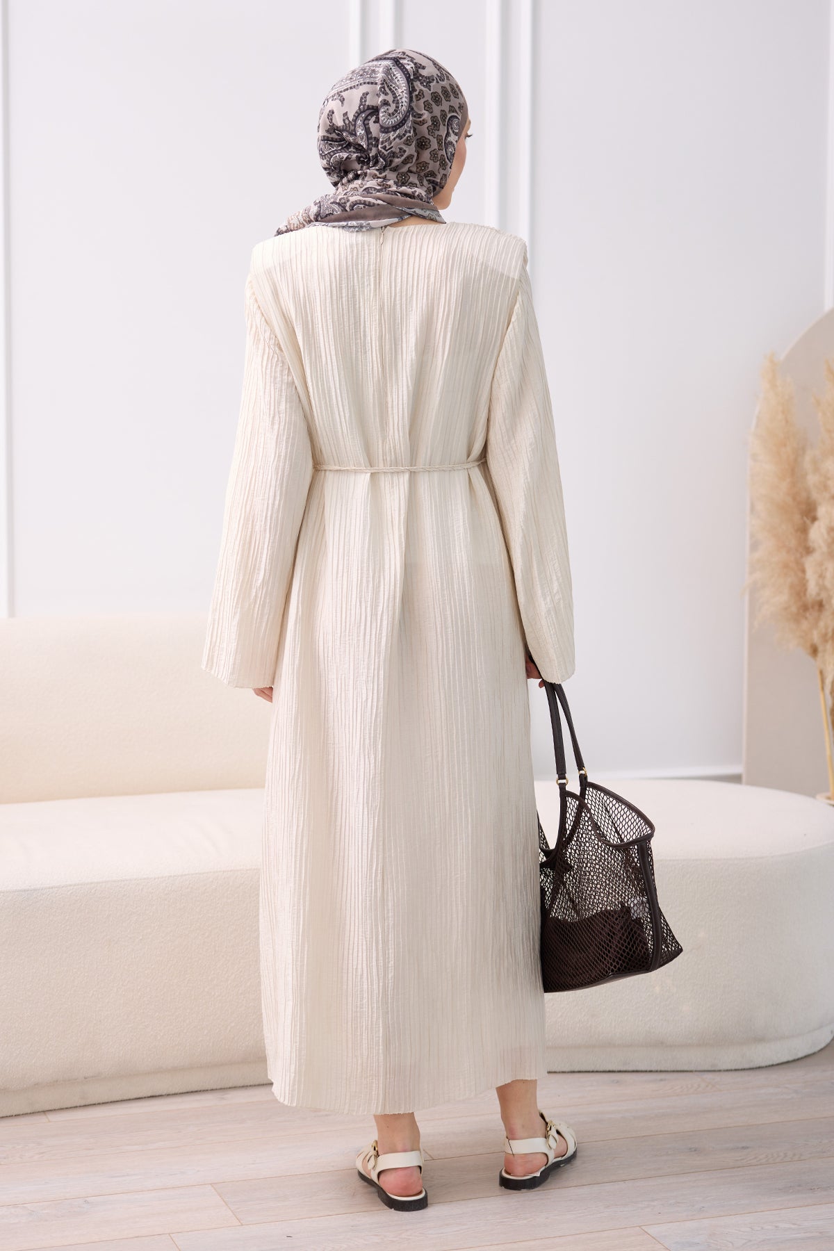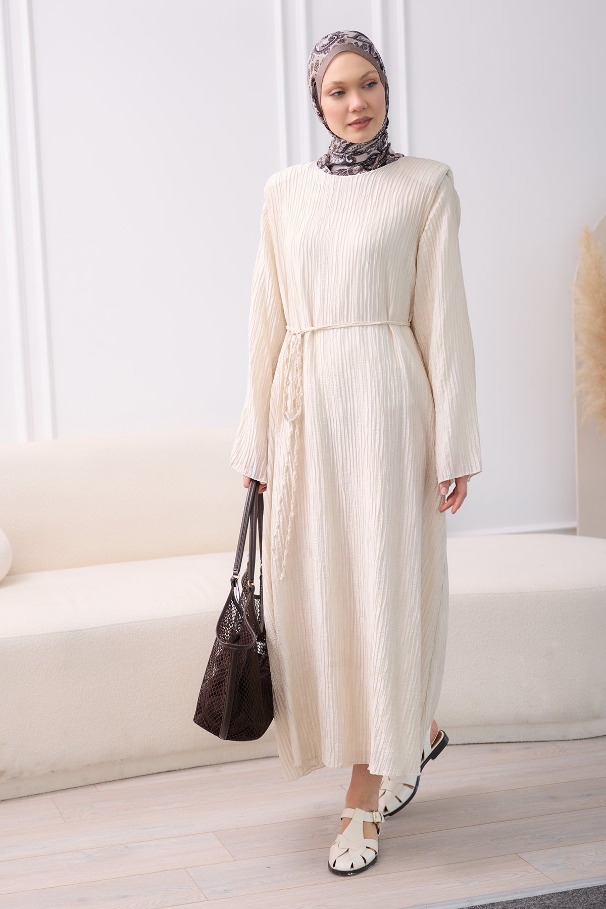 Textured Fabric Padded Shoulder Dress in Cream