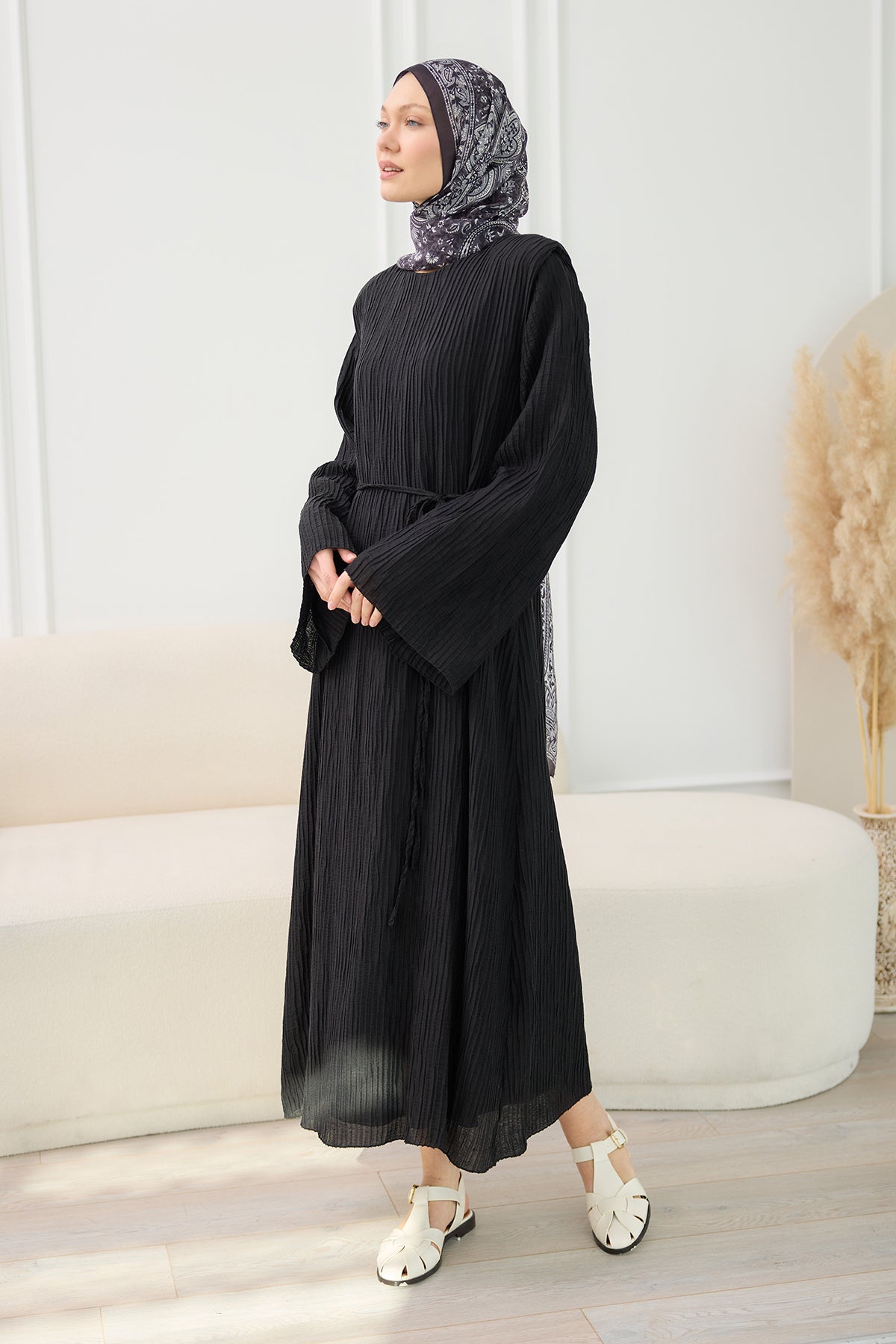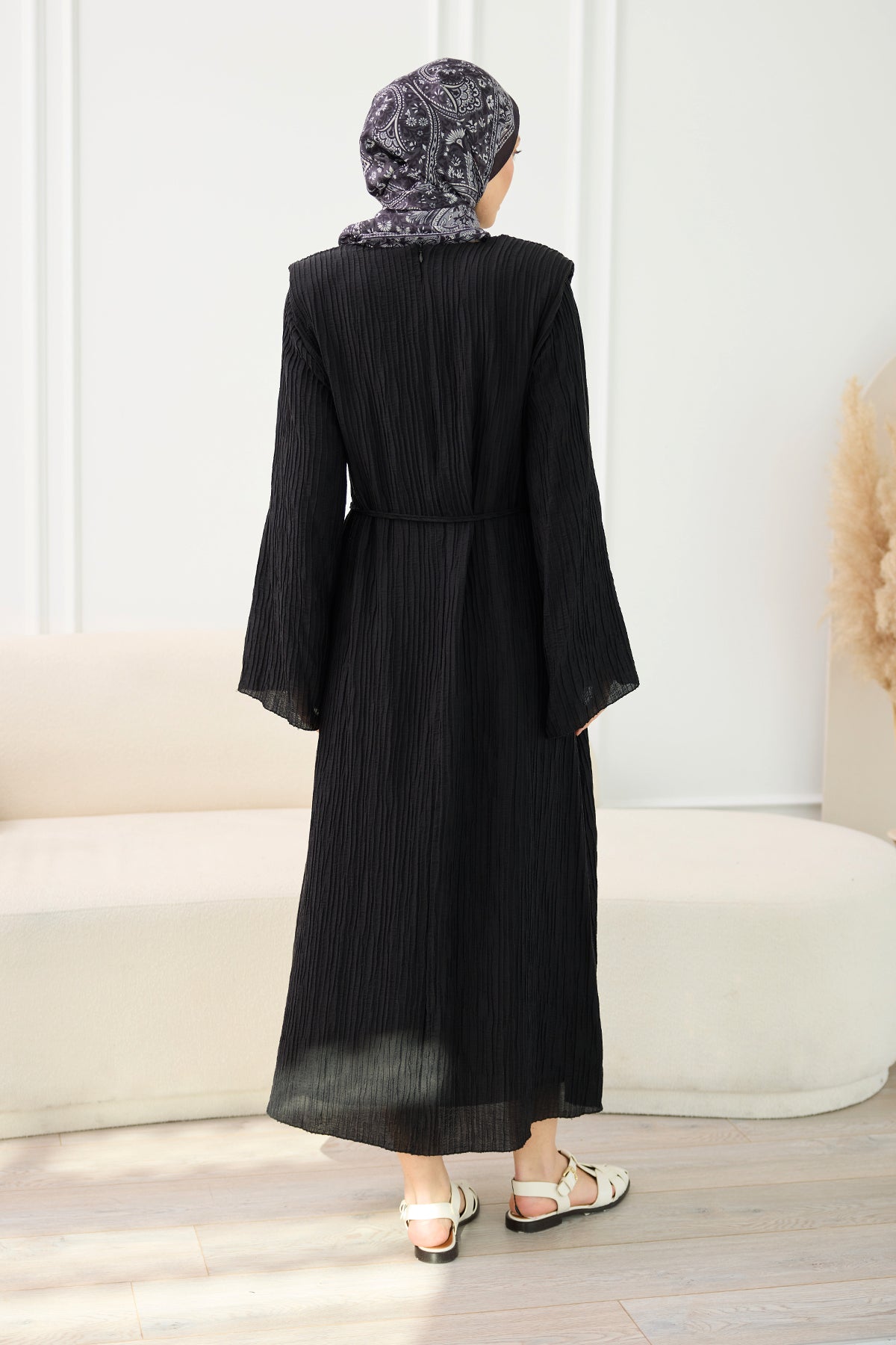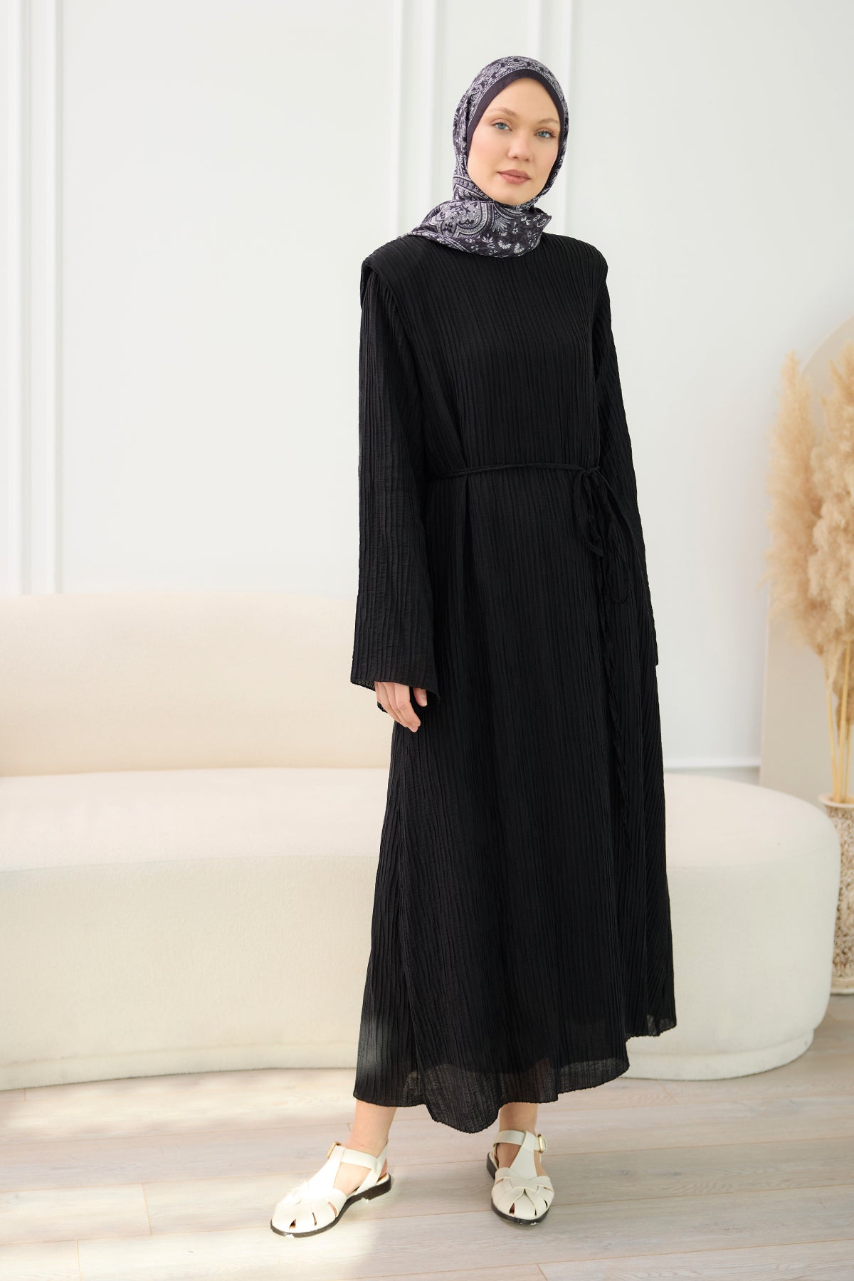 Textured Fabric Padded Shoulder Dress in Black