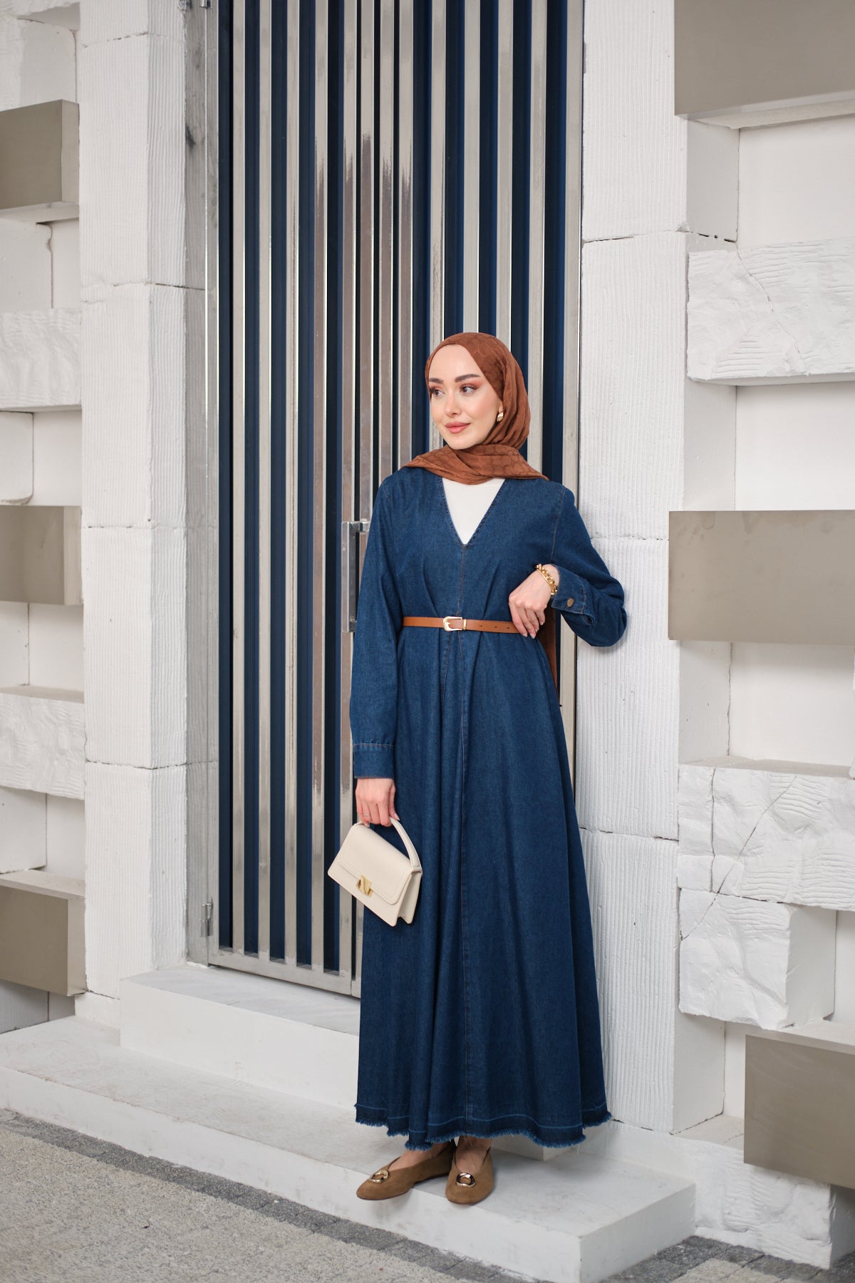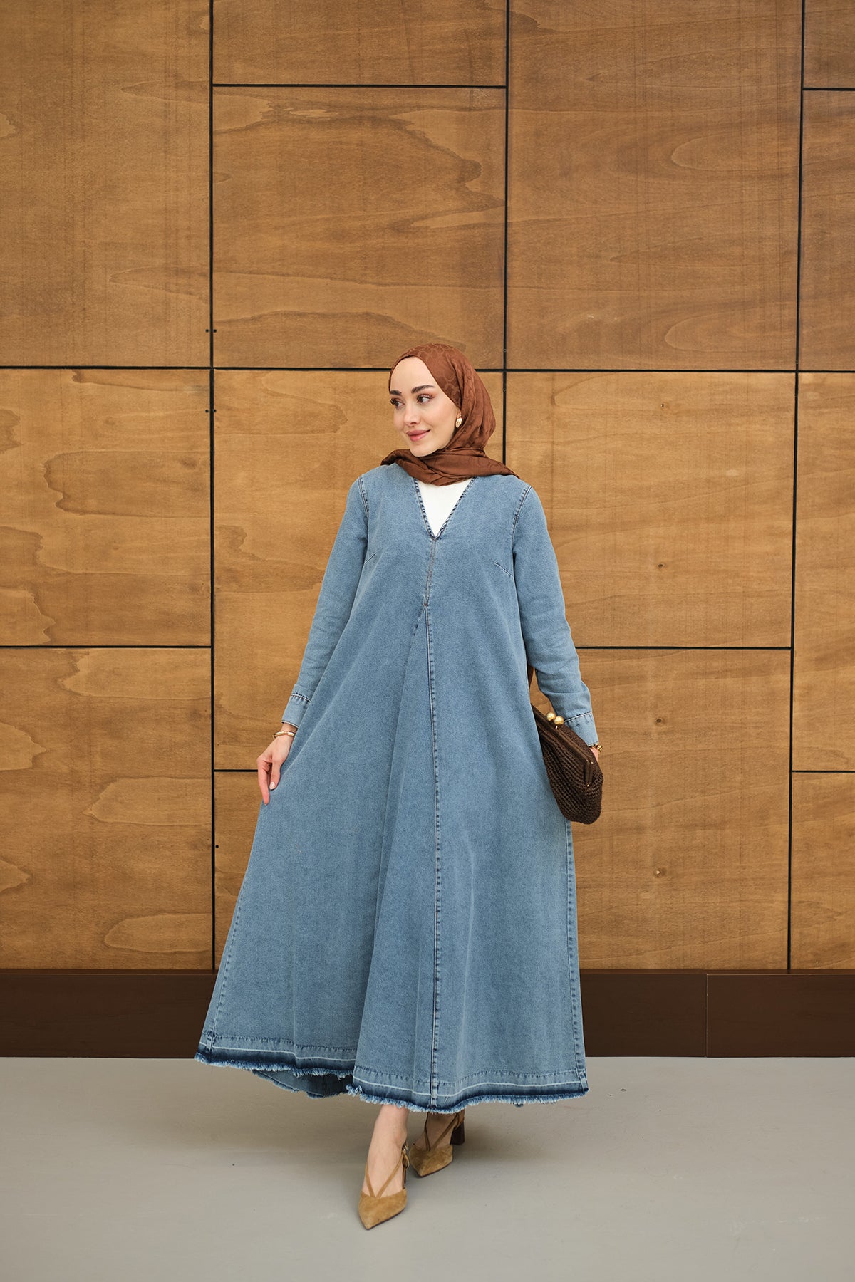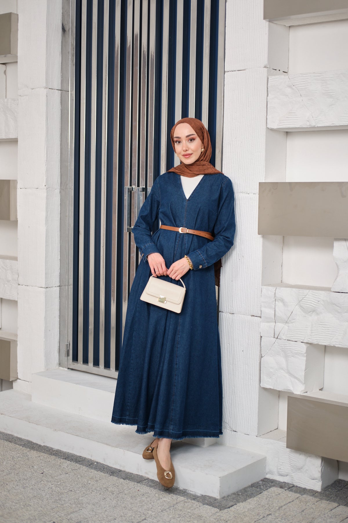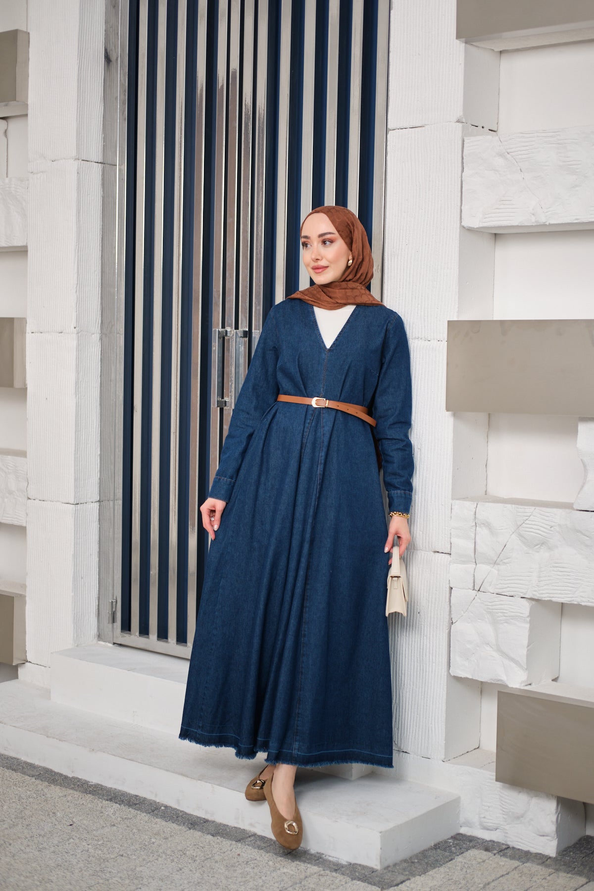 V Neck Denim Dress Dark Blue