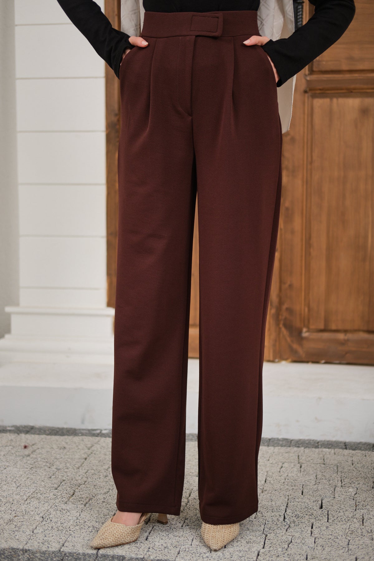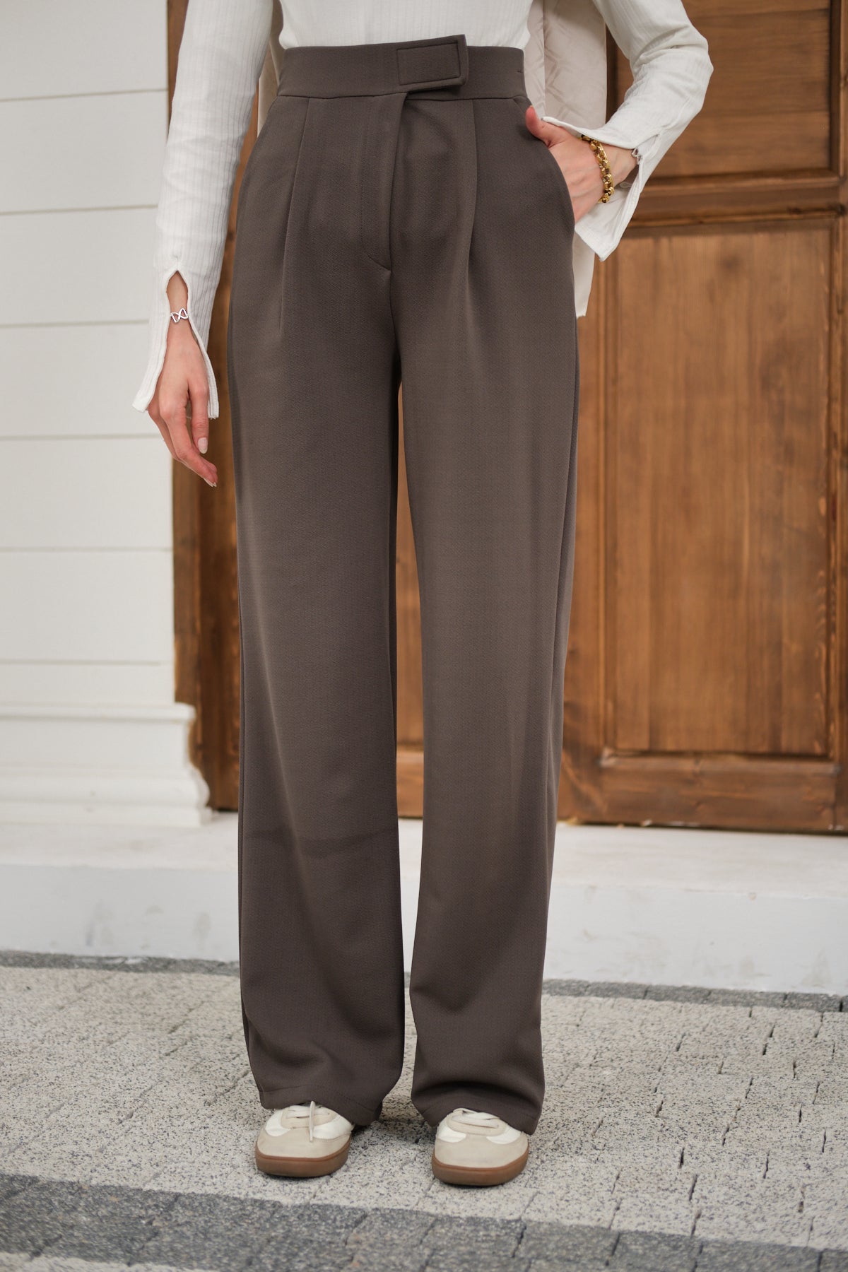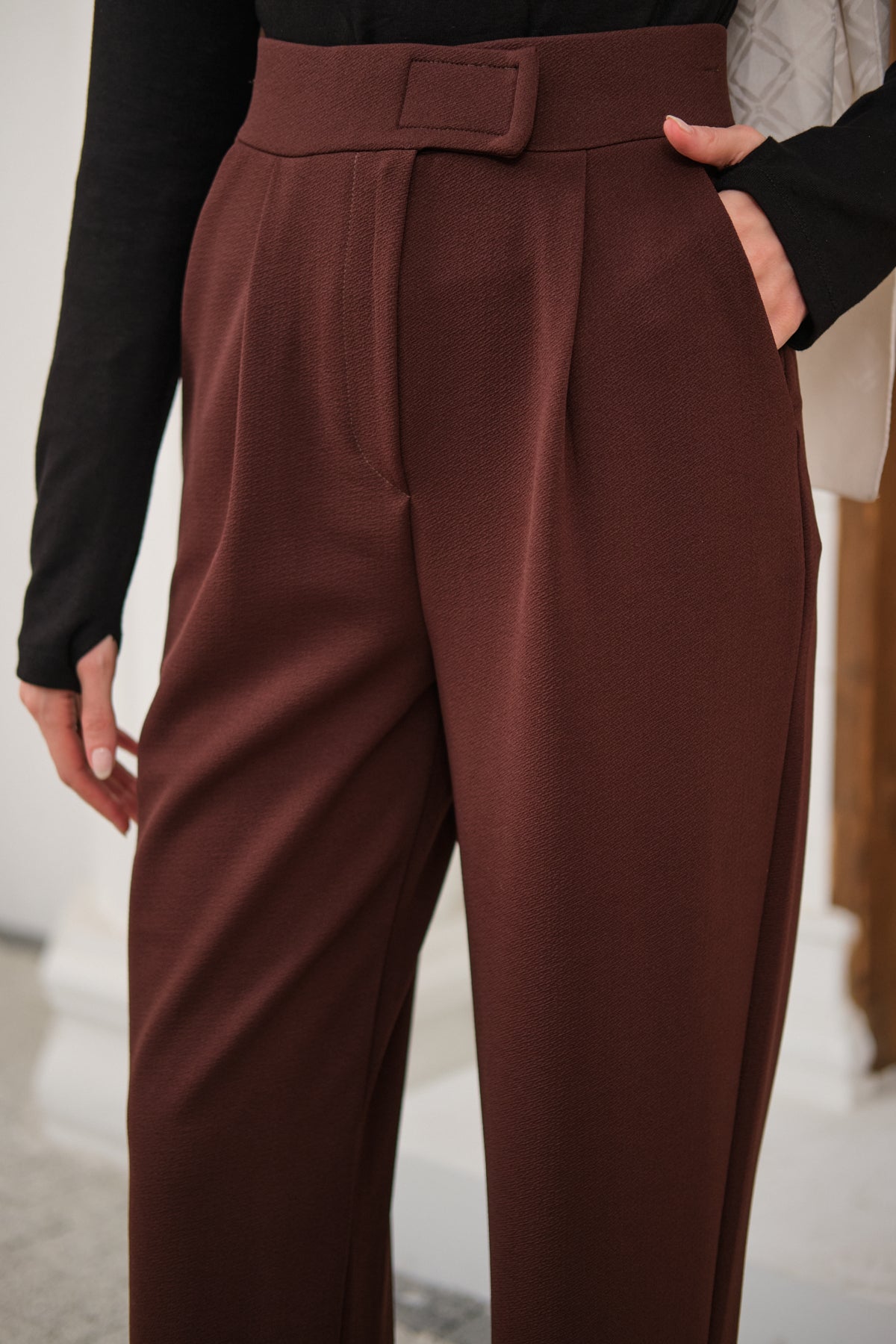 Velcro Detail Fabric Pants - Dark Brown