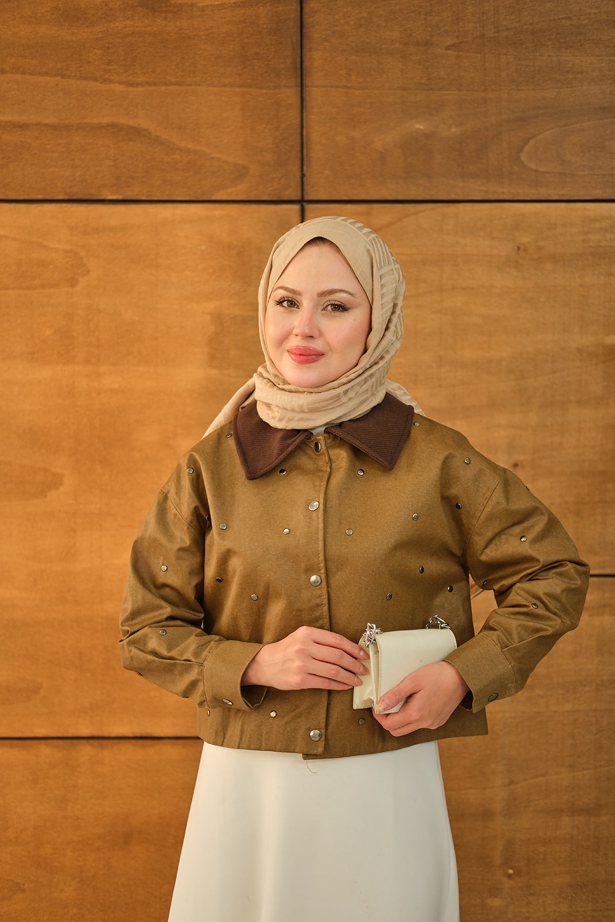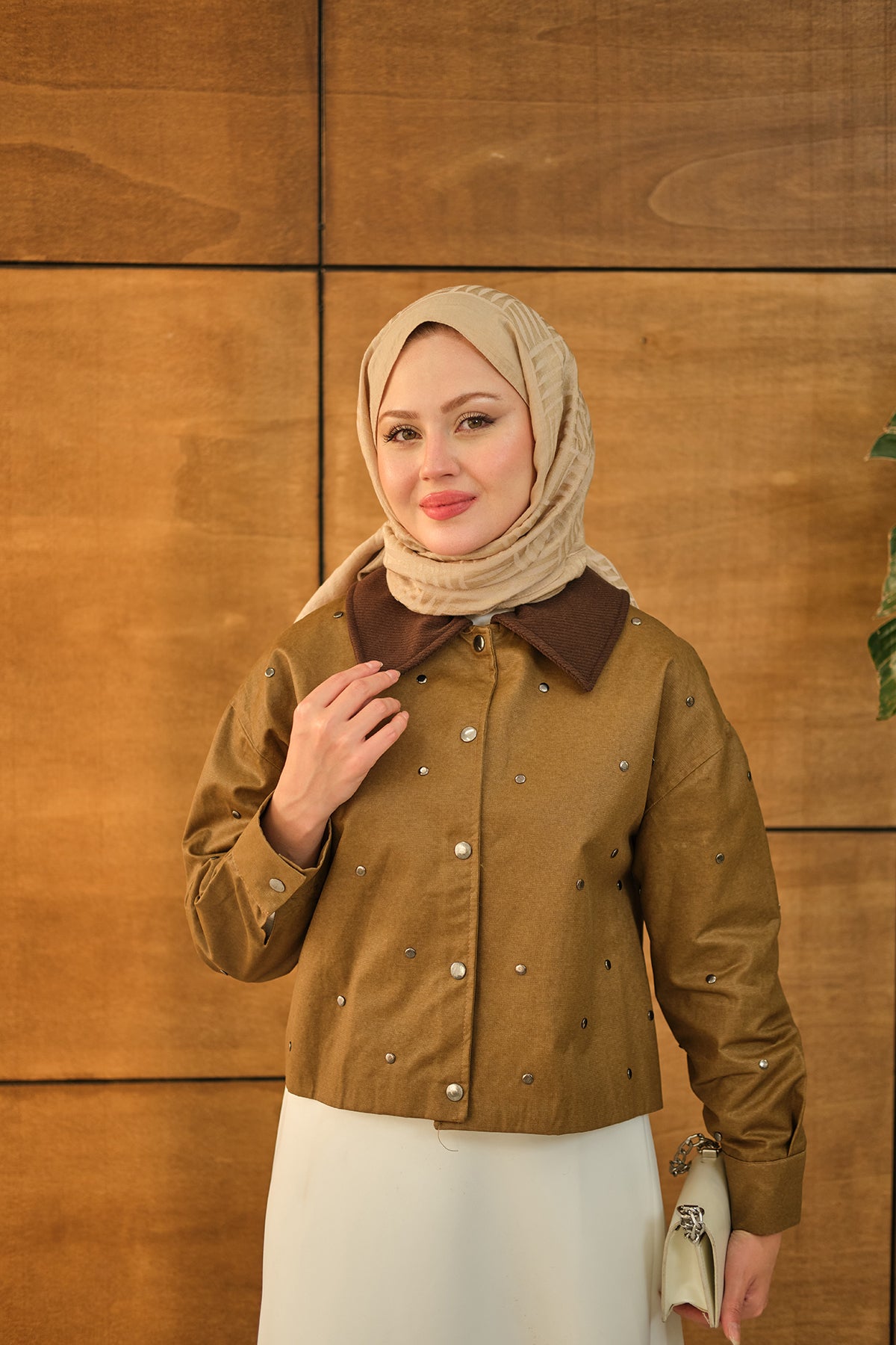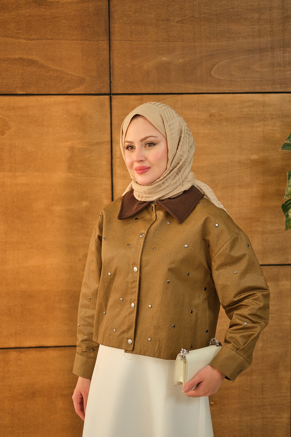 Velvet-Collar Detail Short Jacket - Mink Beige