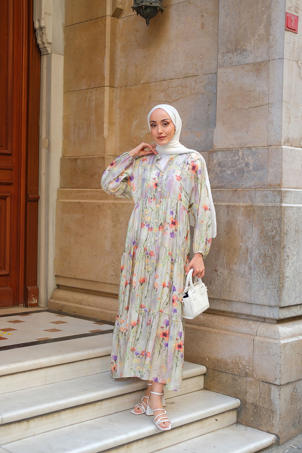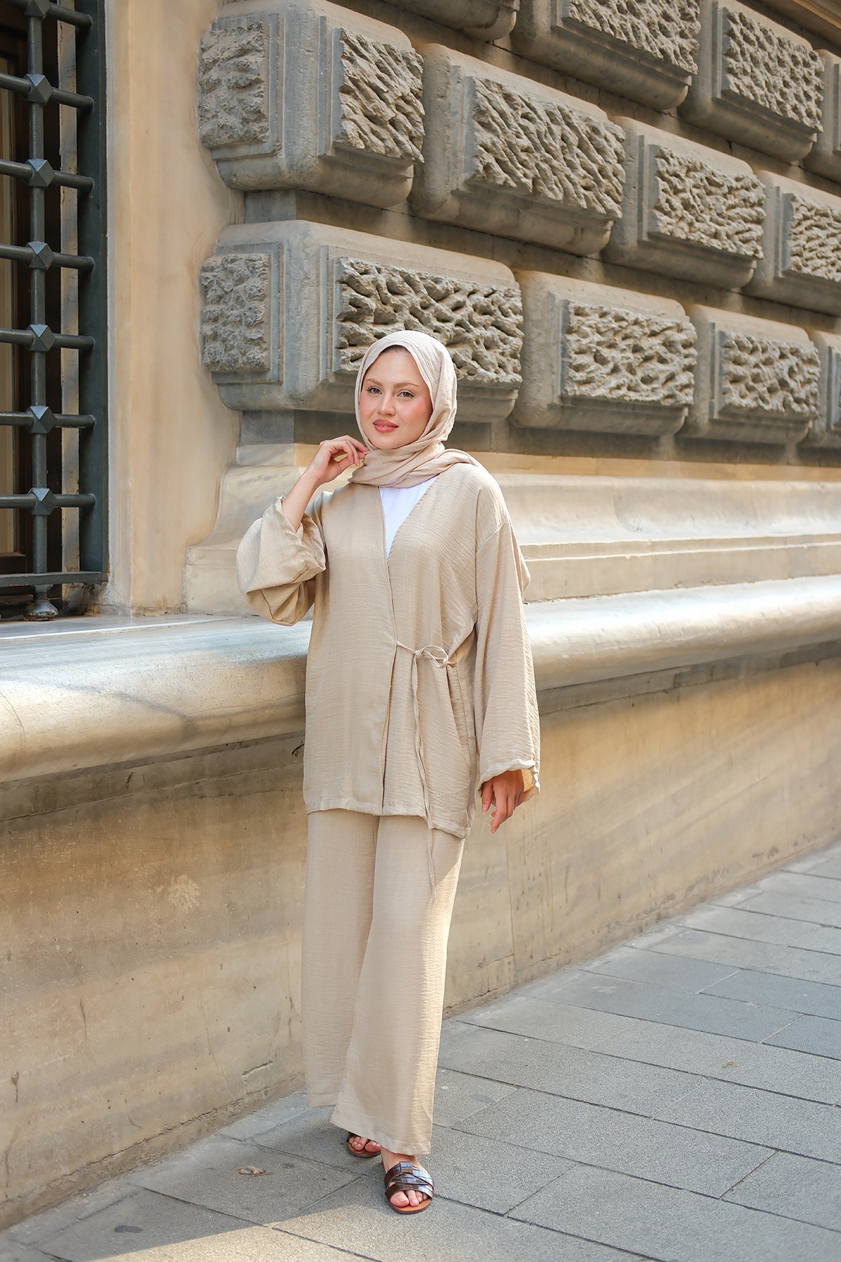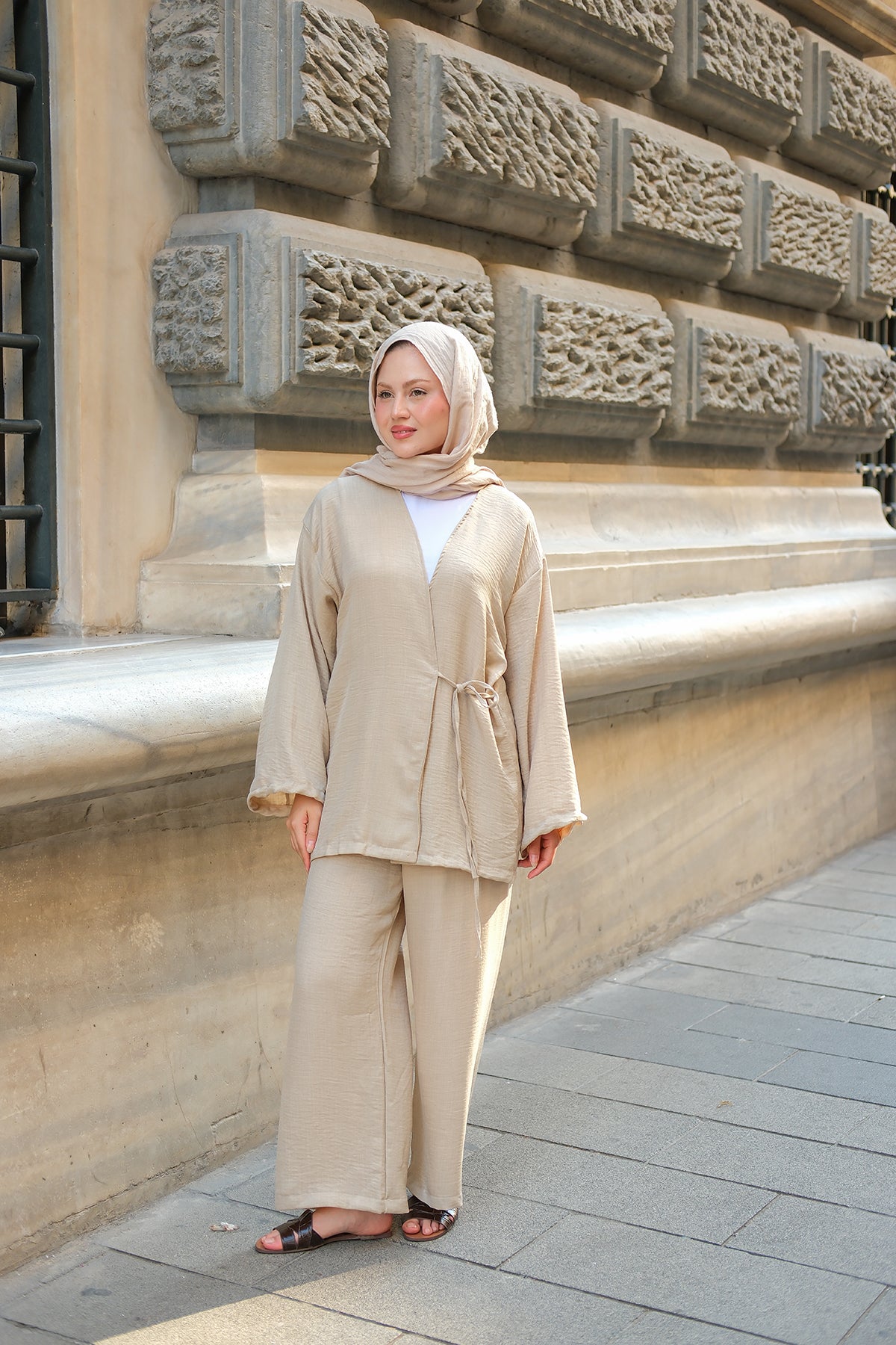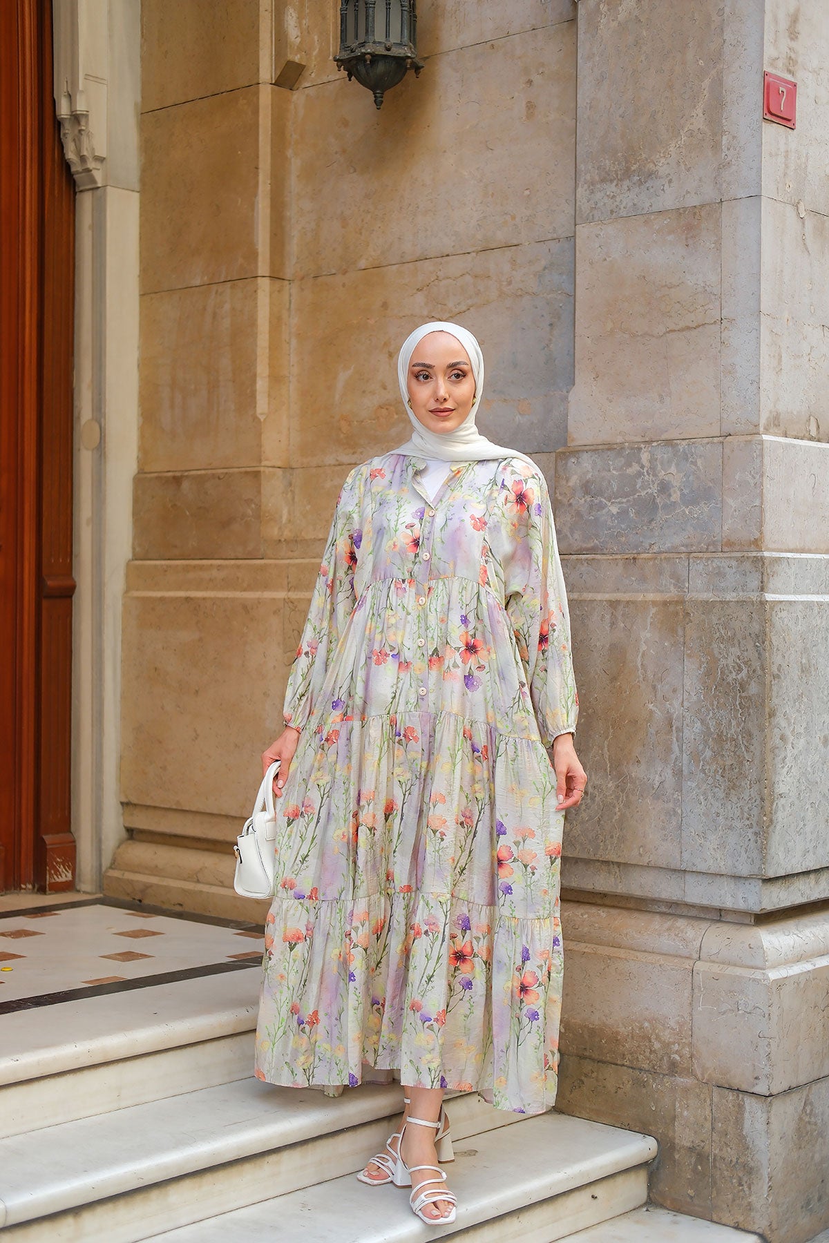 Women's Front-Lace Lined Linen Modest Dress - Stone