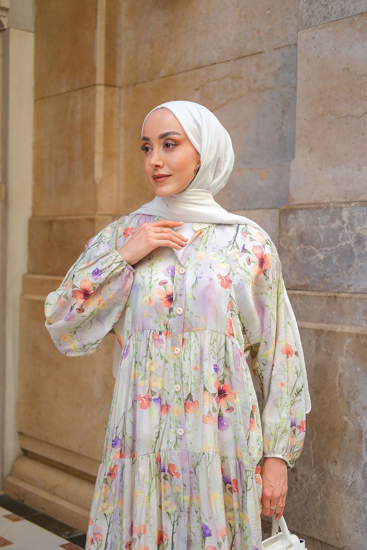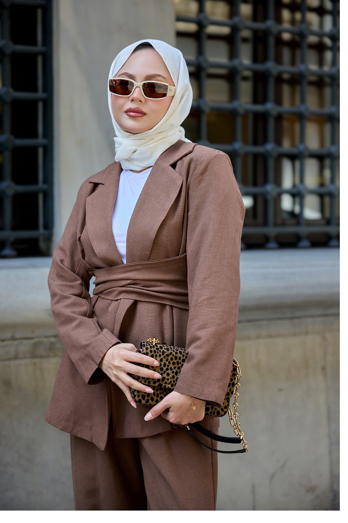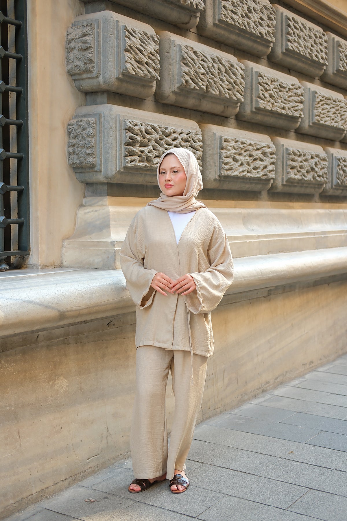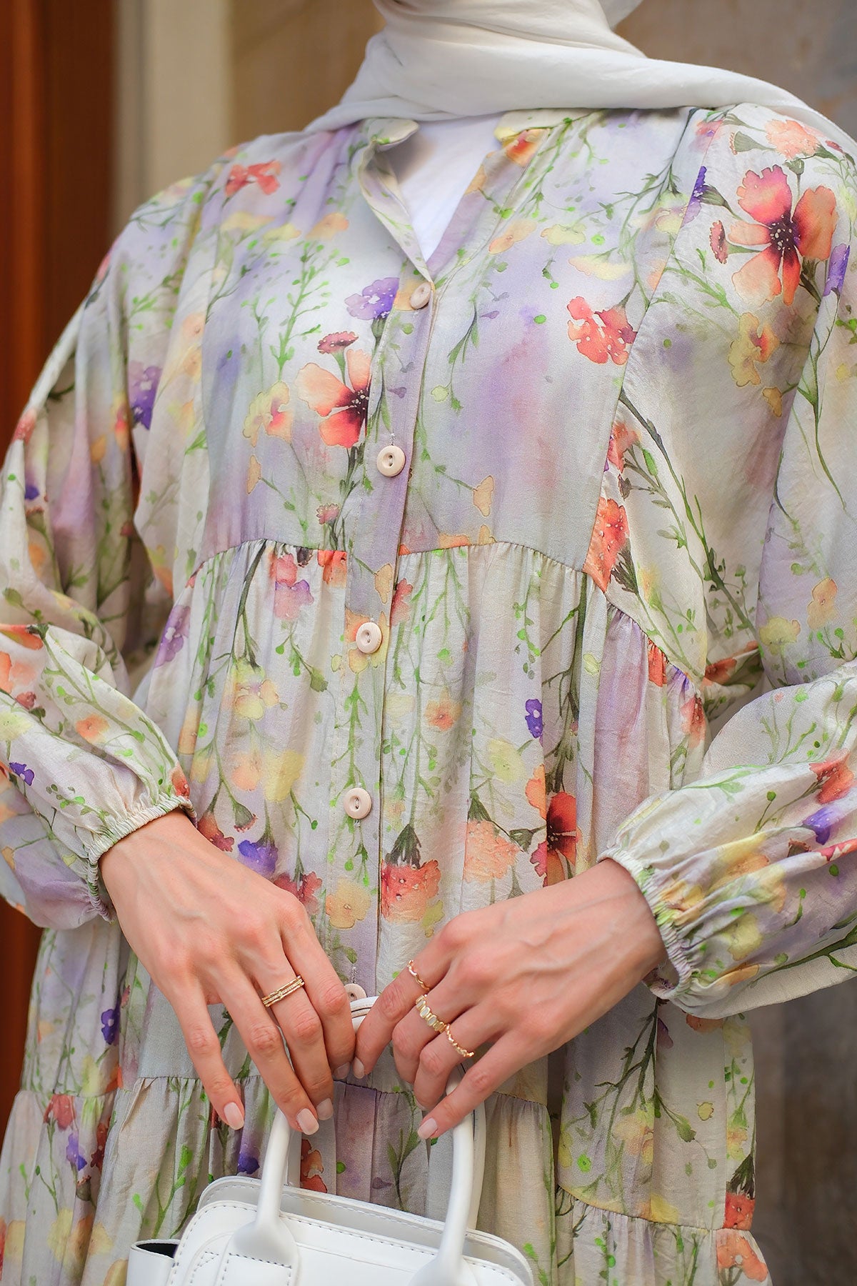 Women's Front-Lace Lined Linen Modest Dress - Stone