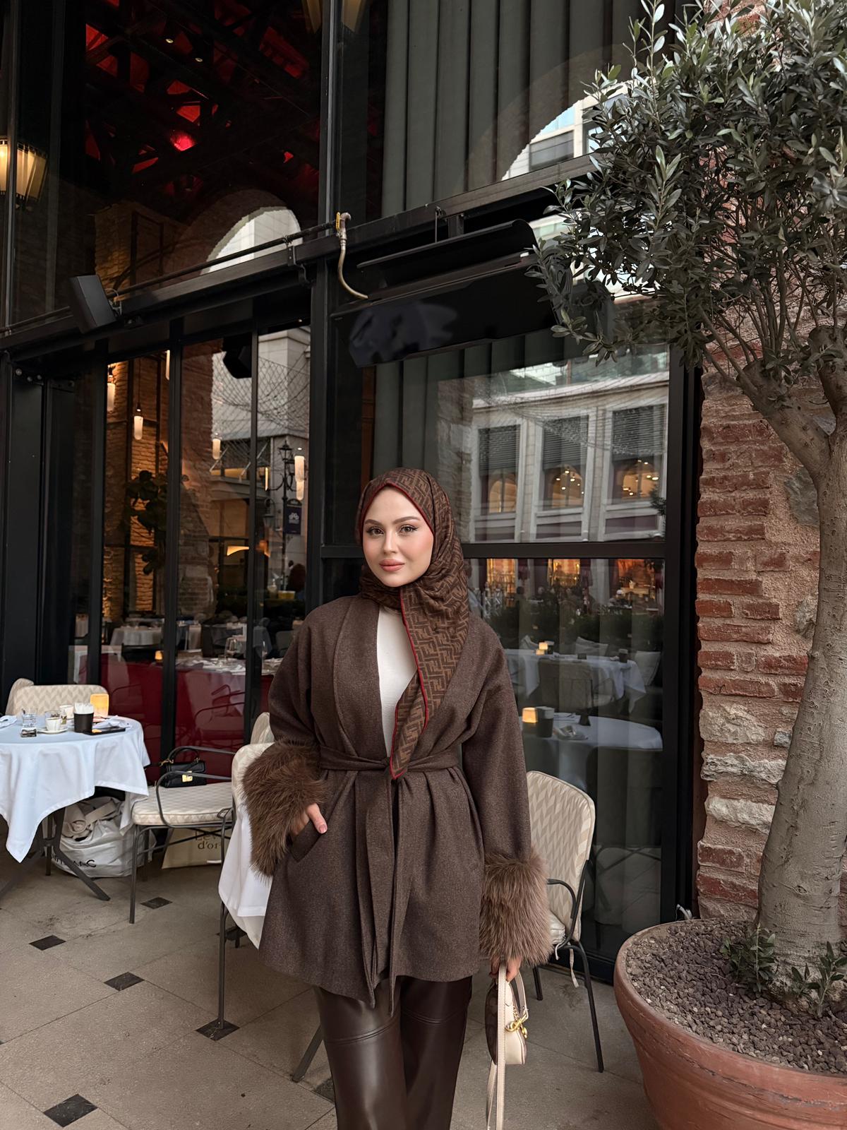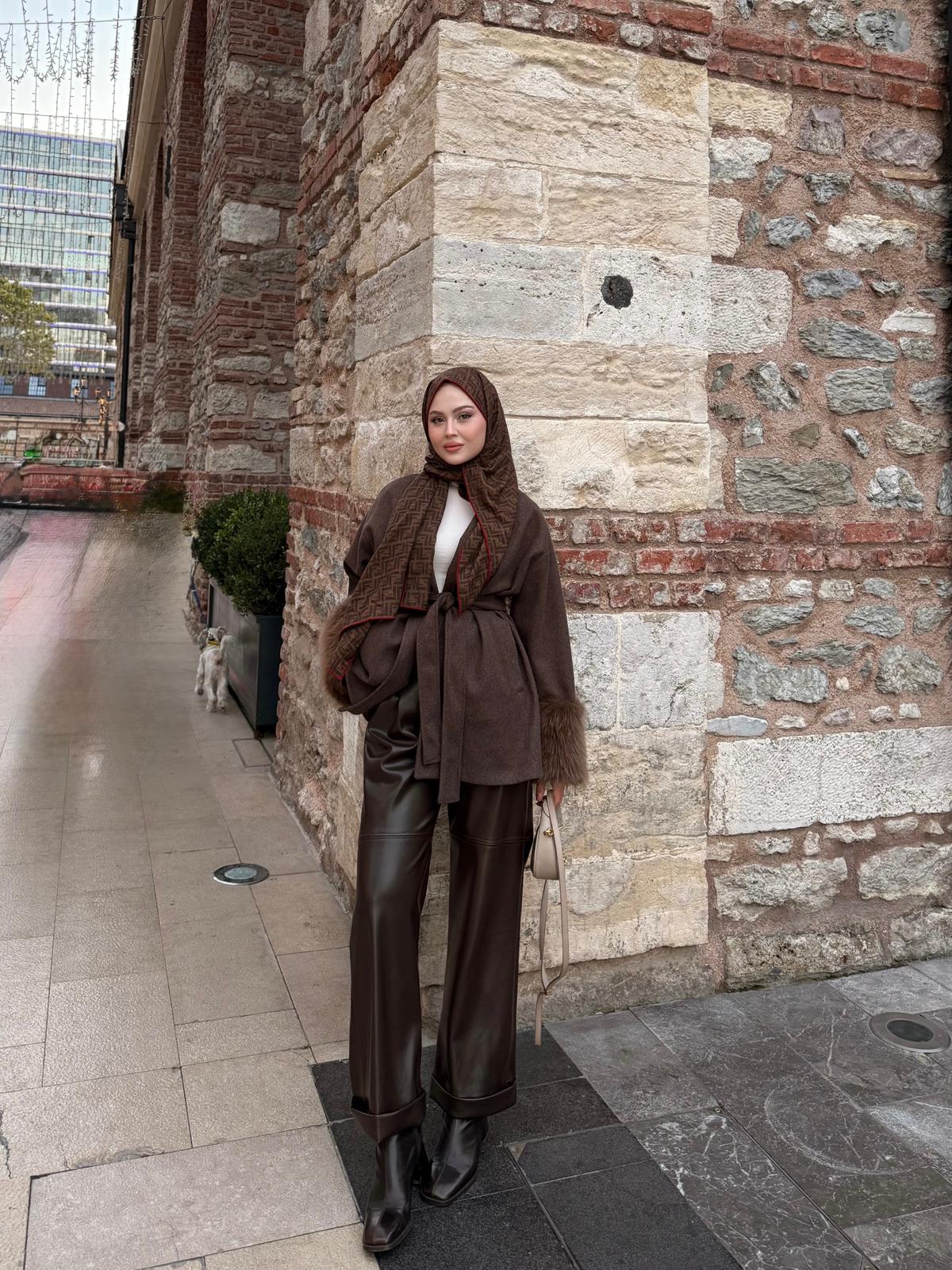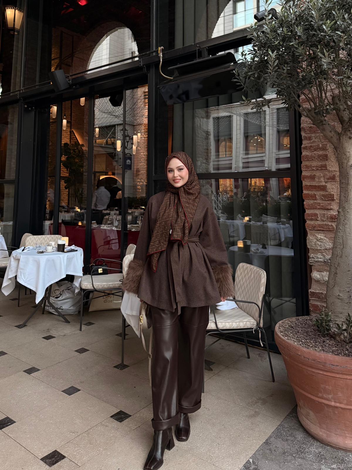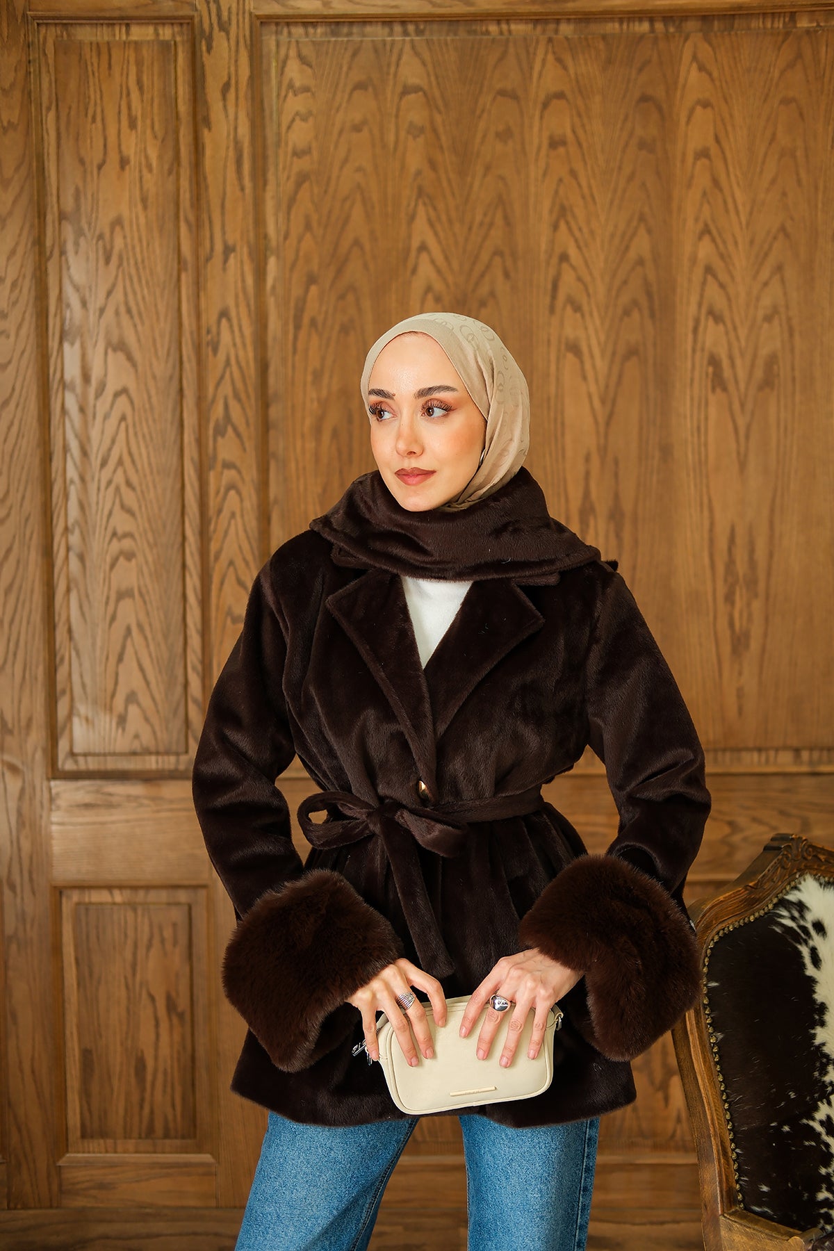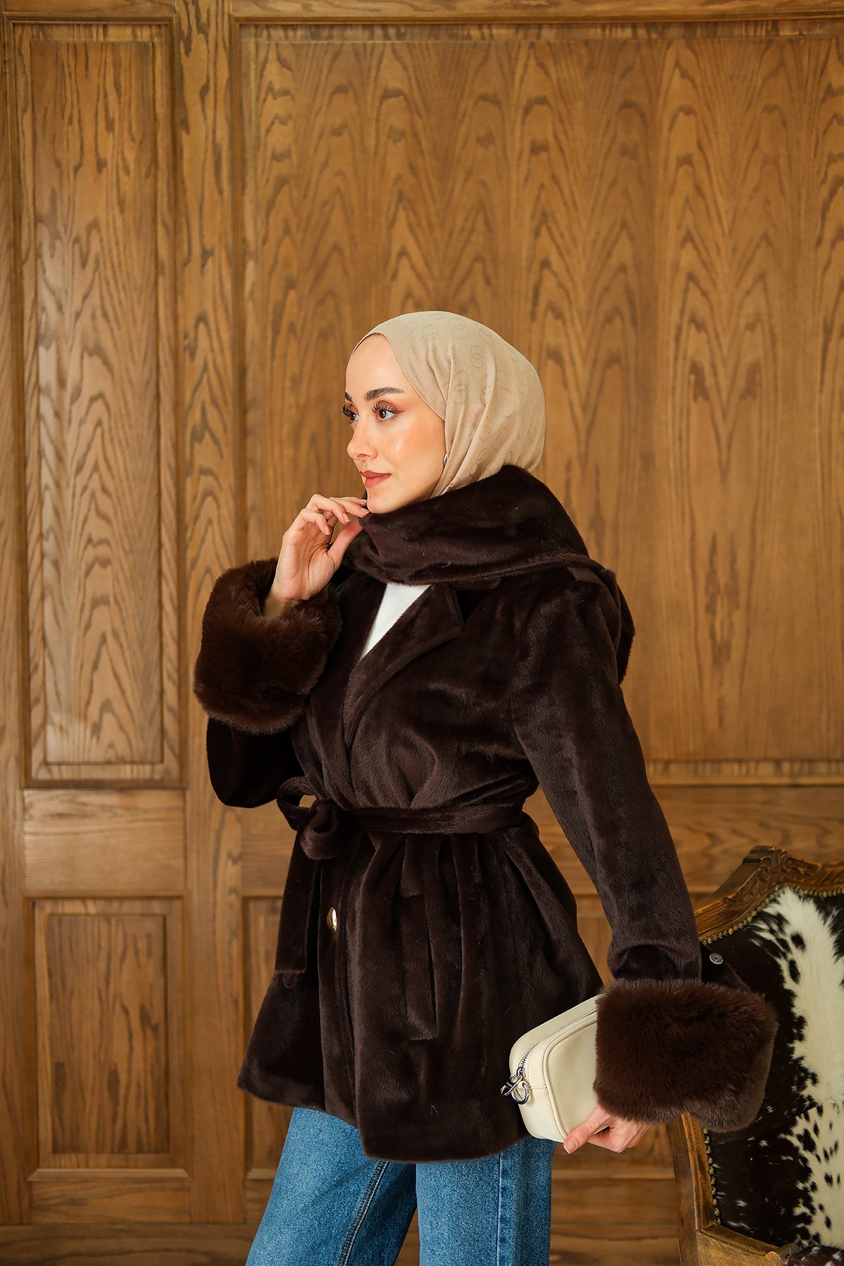 Wool Coat with Fur Trim and Bow Collar - Brown