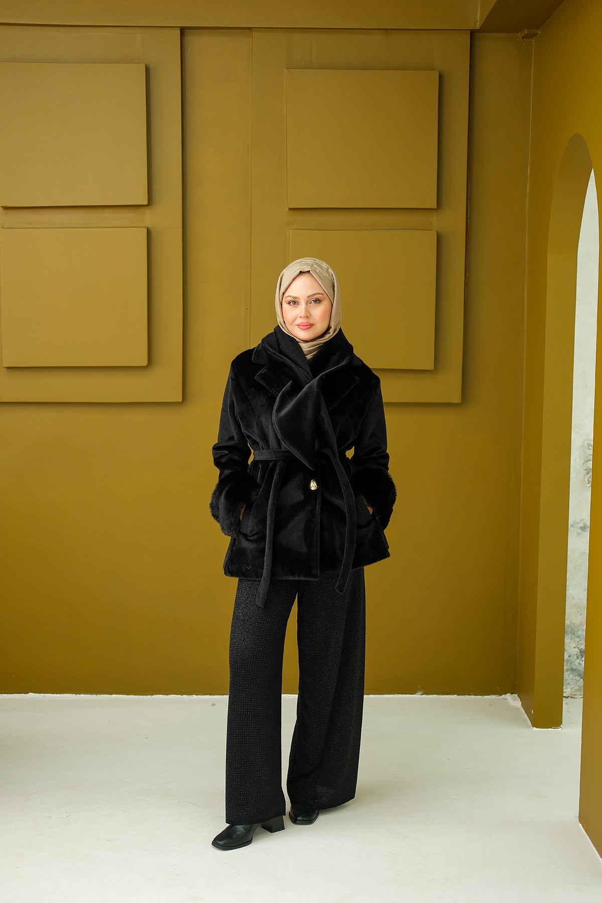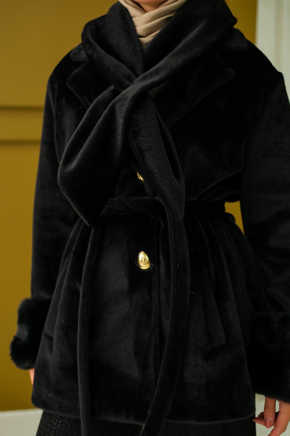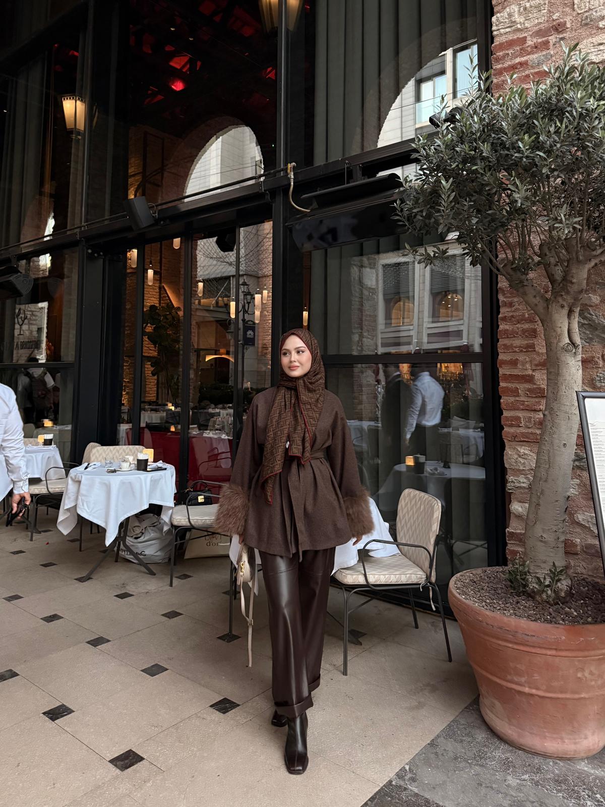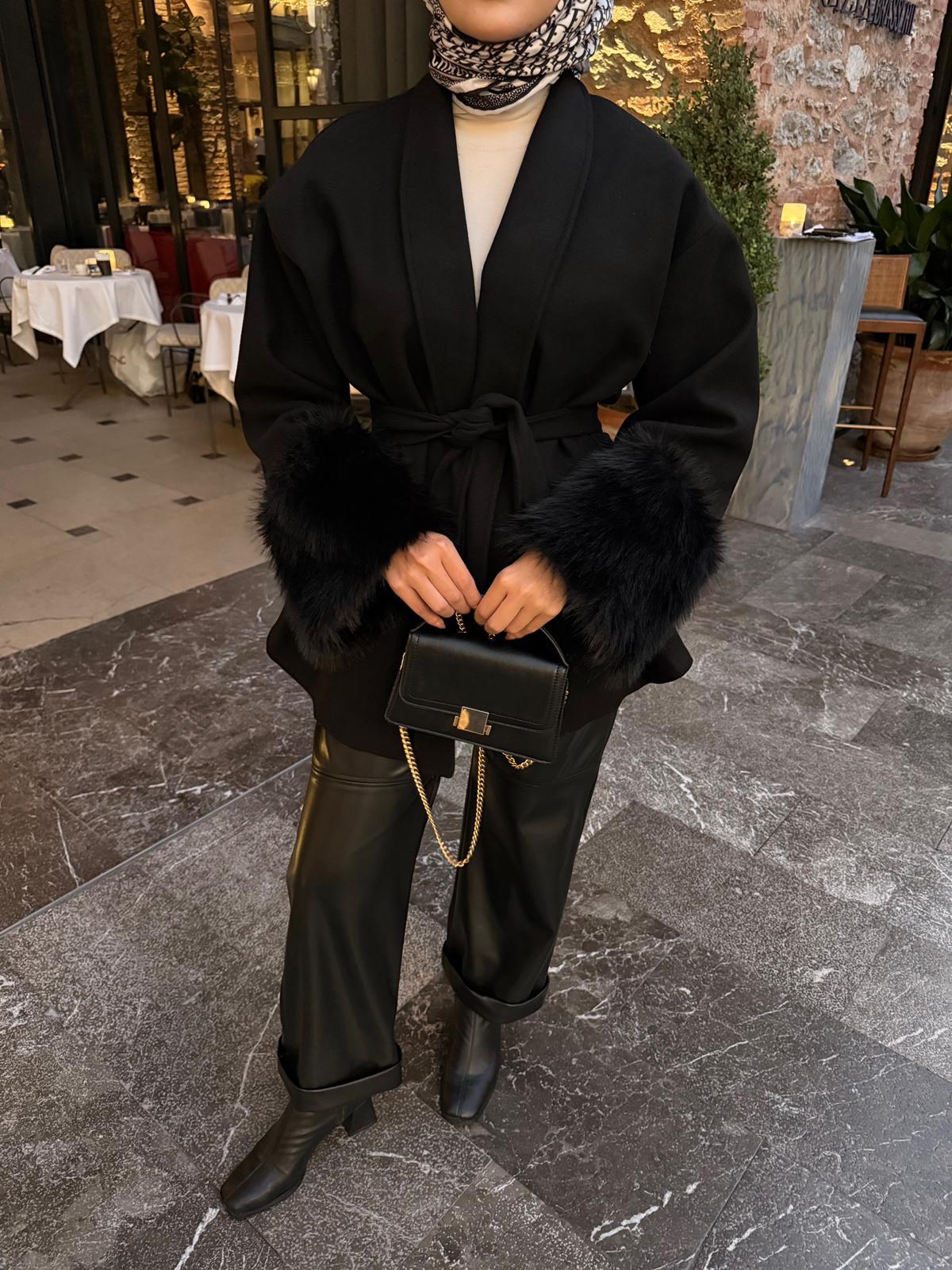 Wool Coat with Fur Trim and Bow Collar - Brown