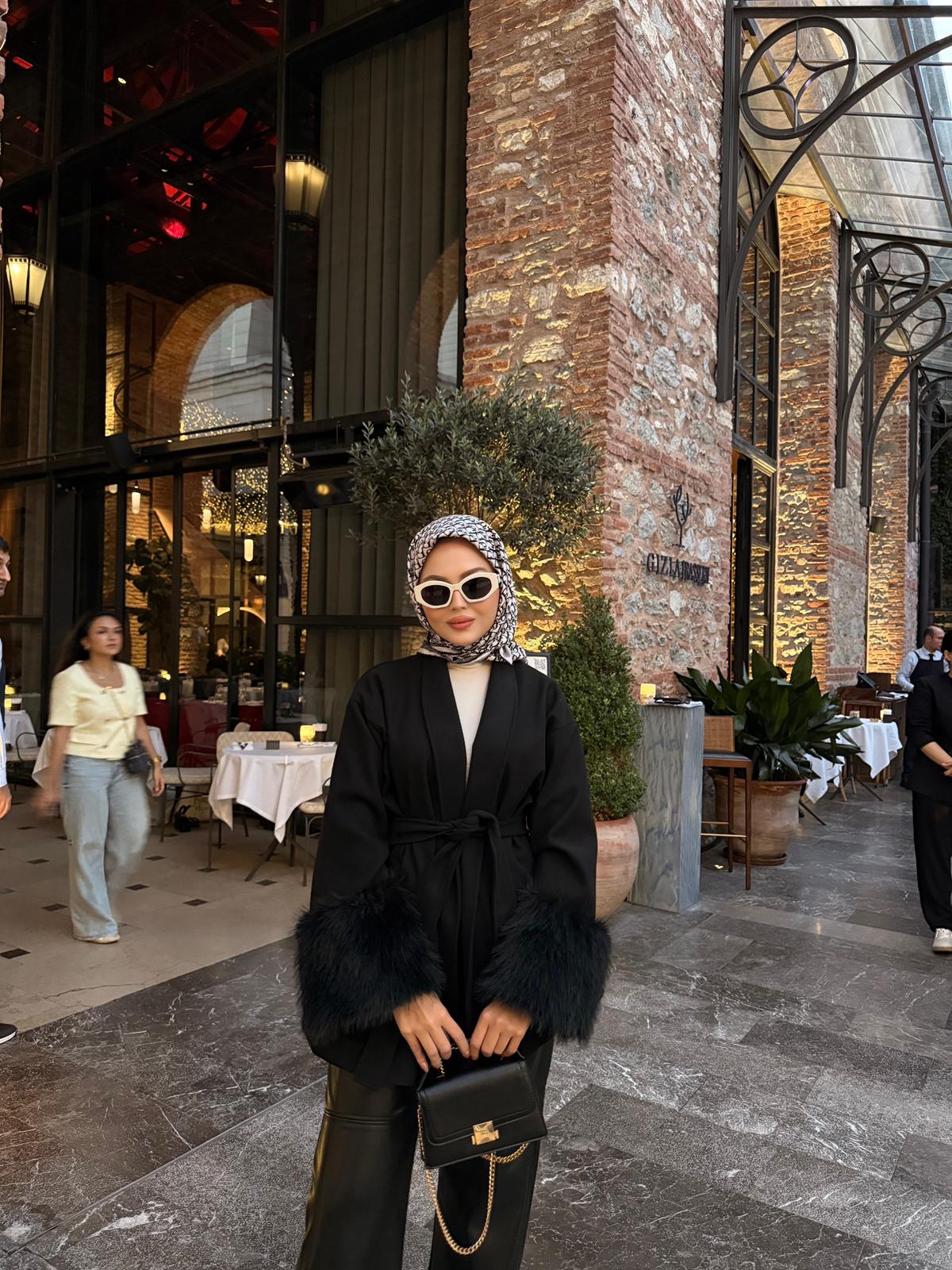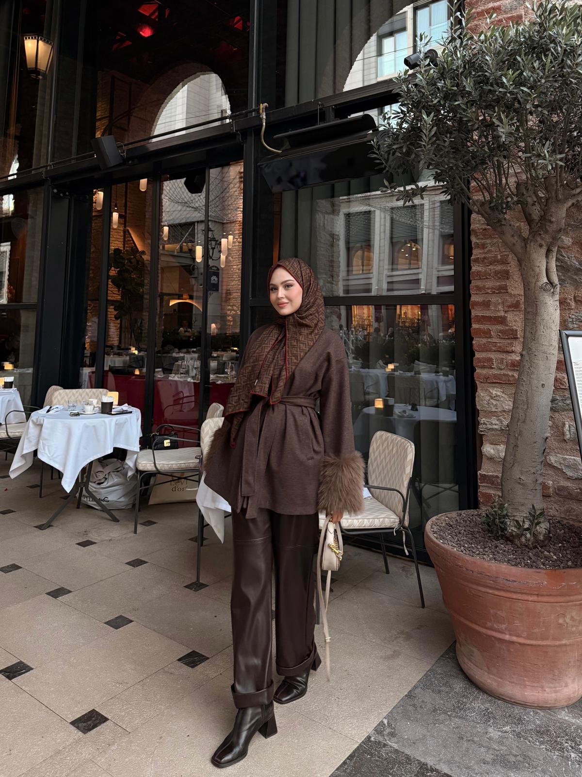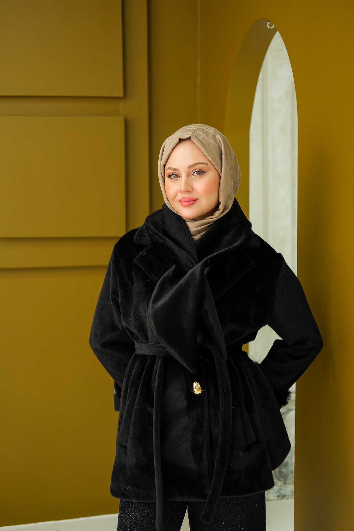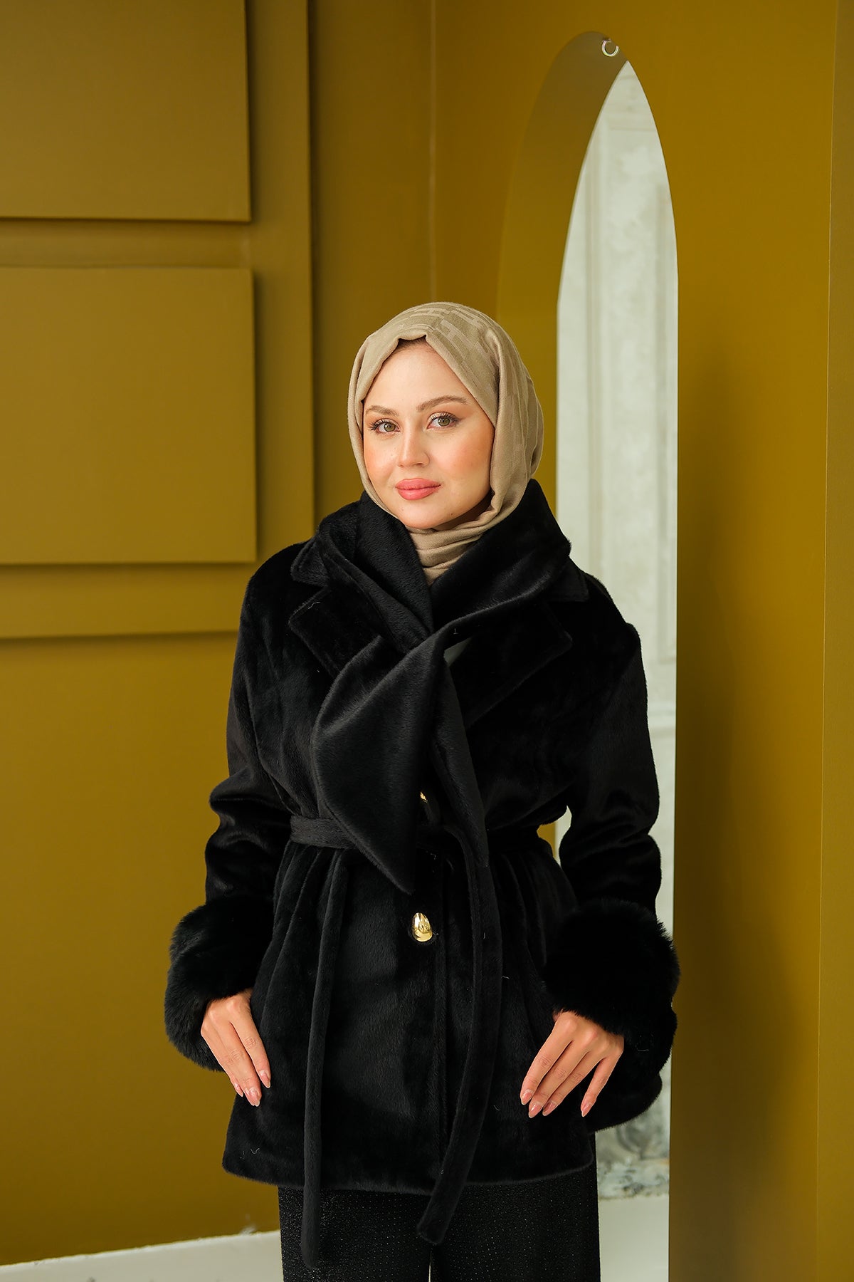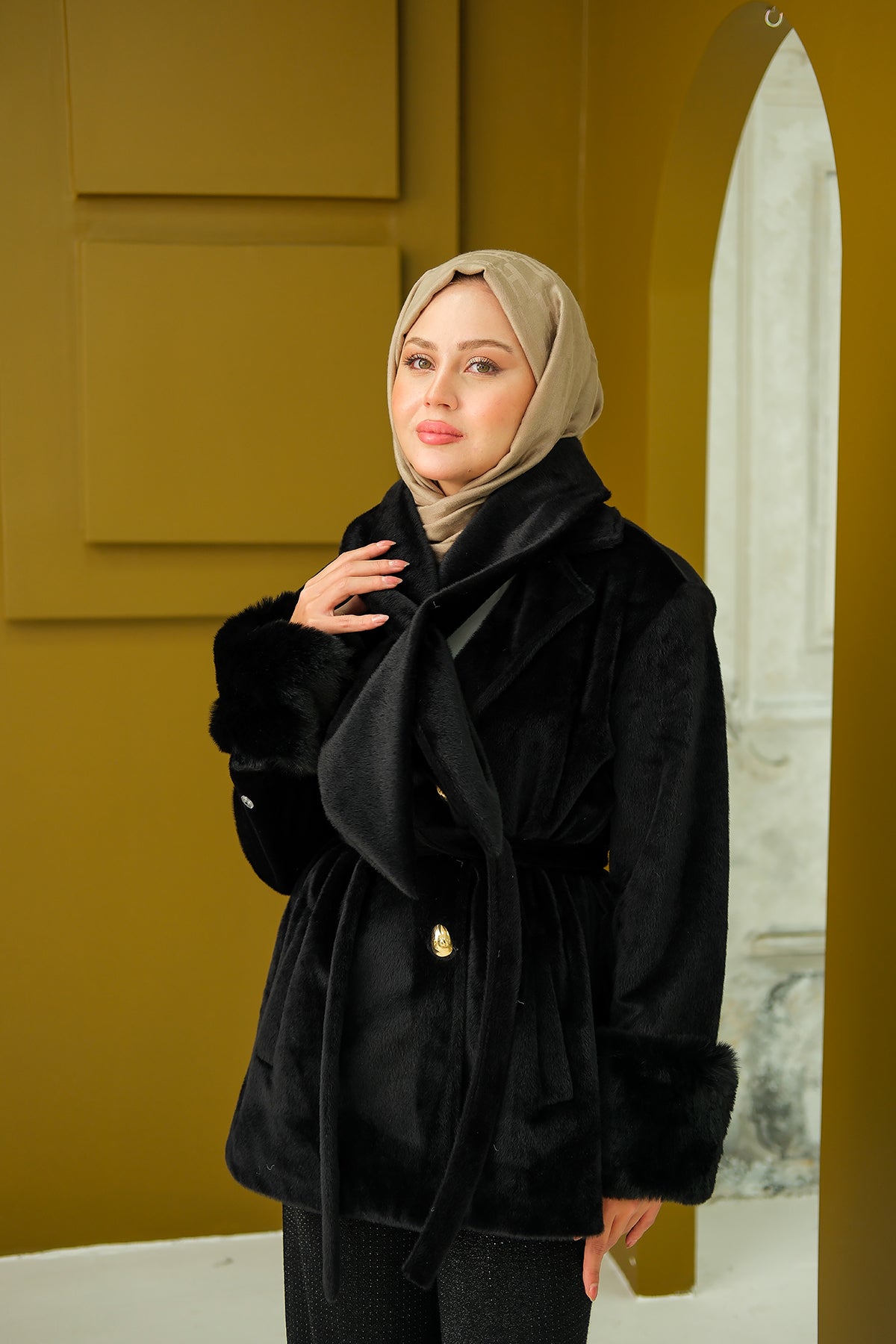 Wool Coat with Fur Trim and Bow Collar - Brown