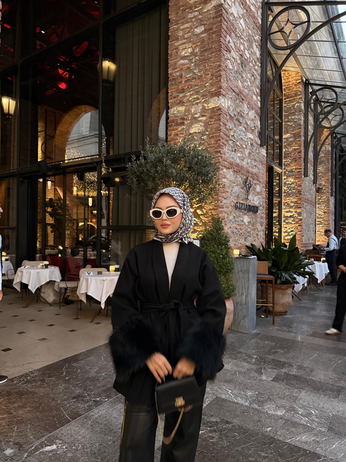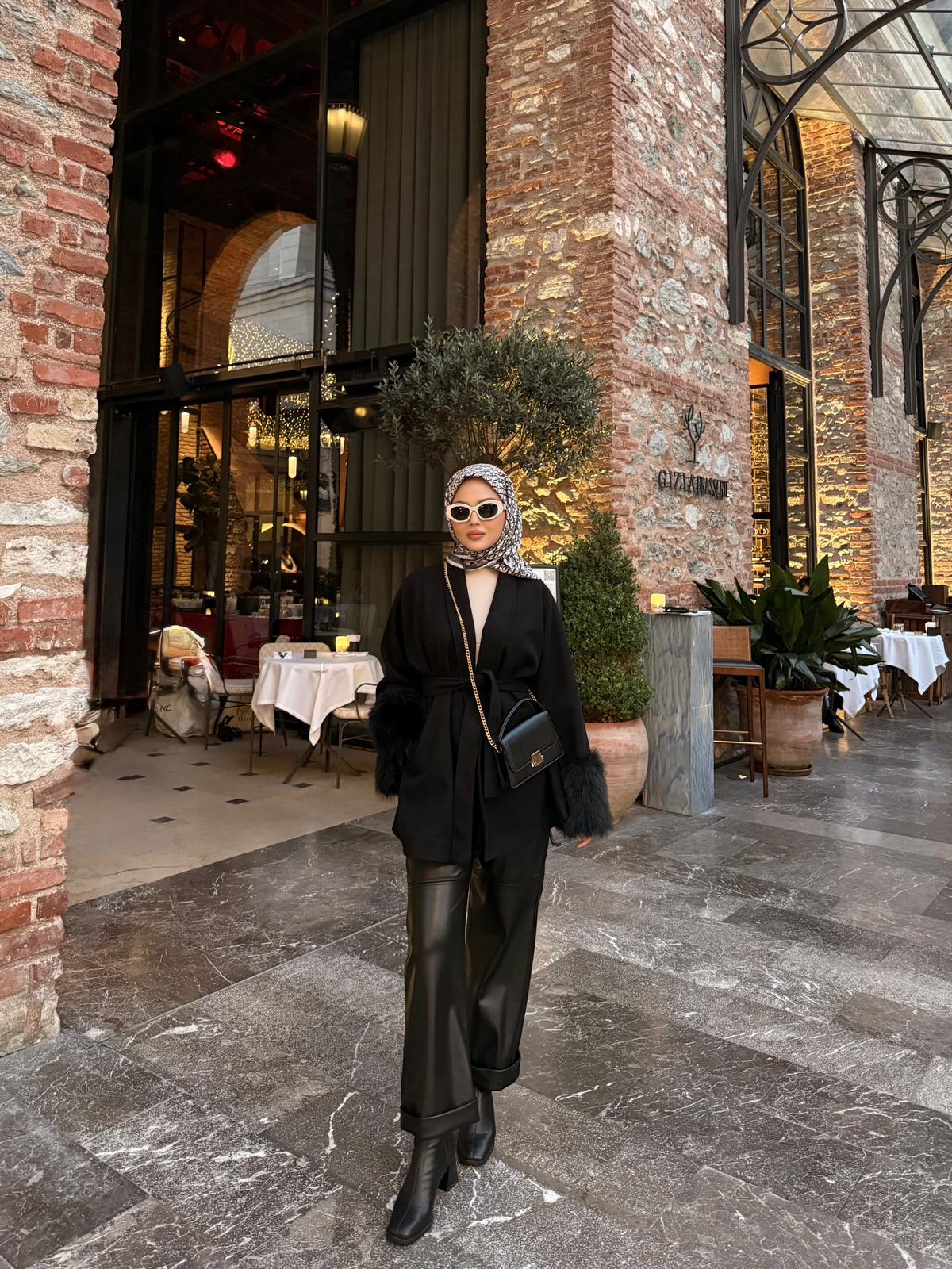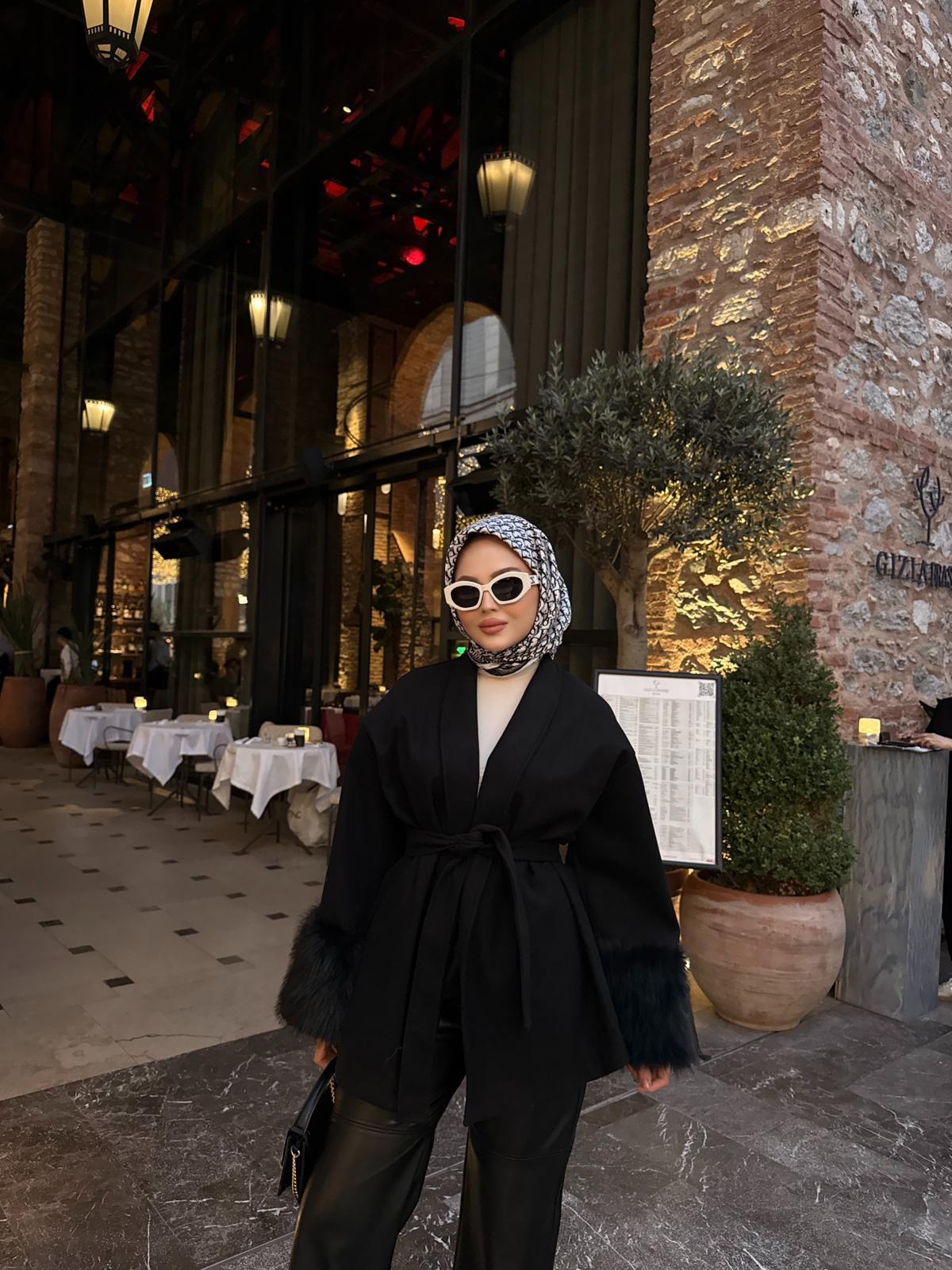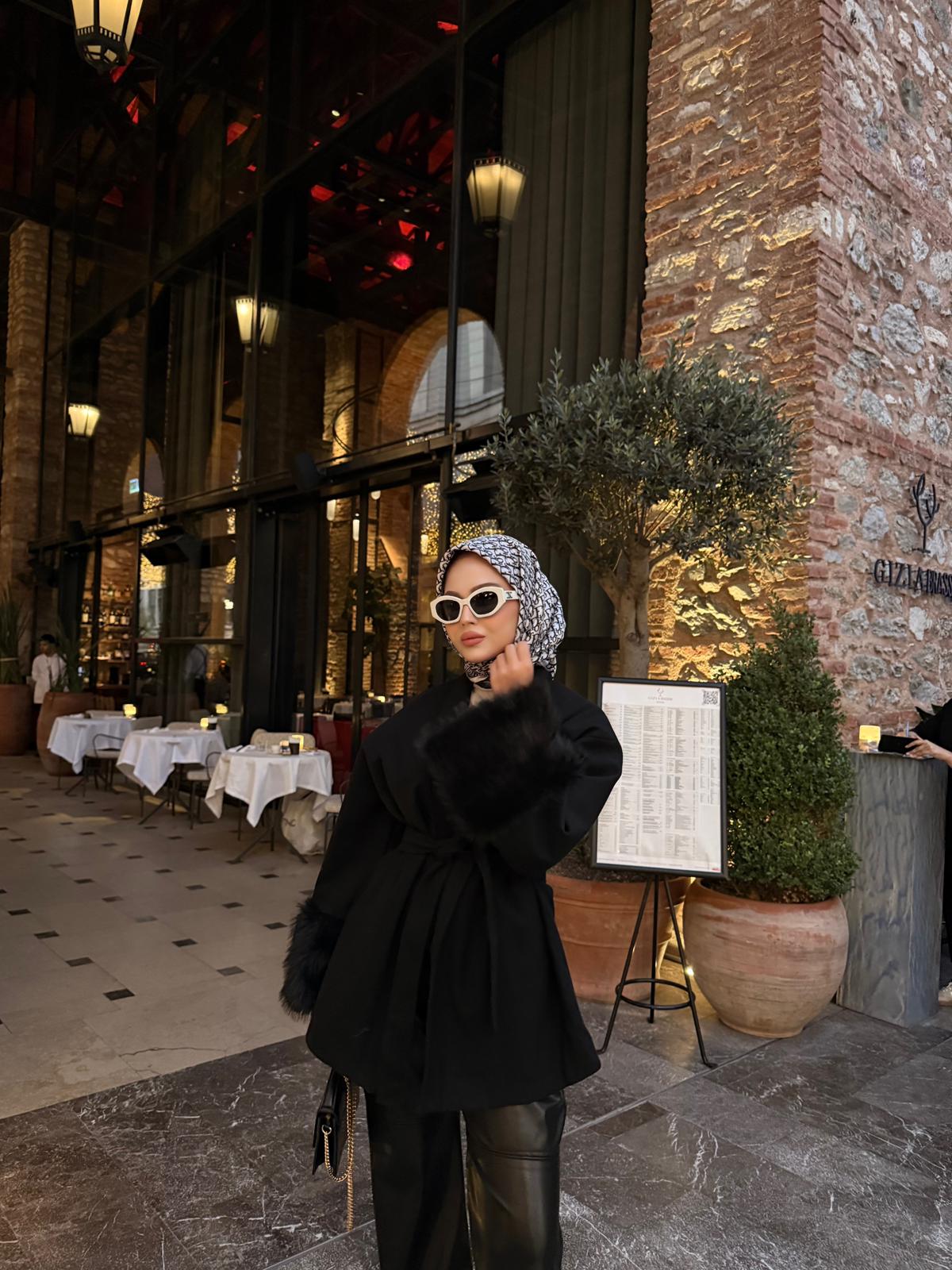 Wool Coat with Fur Trim and Bow Collar - Brown