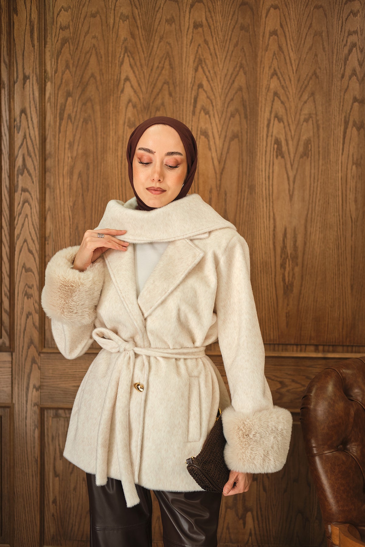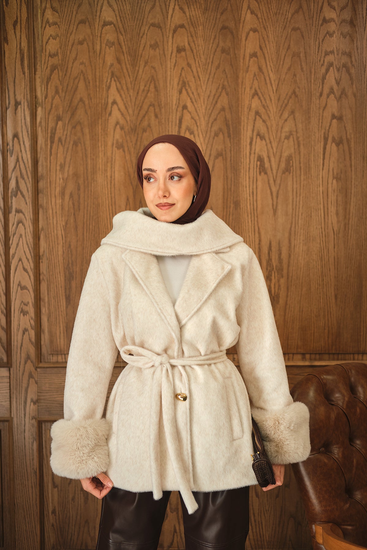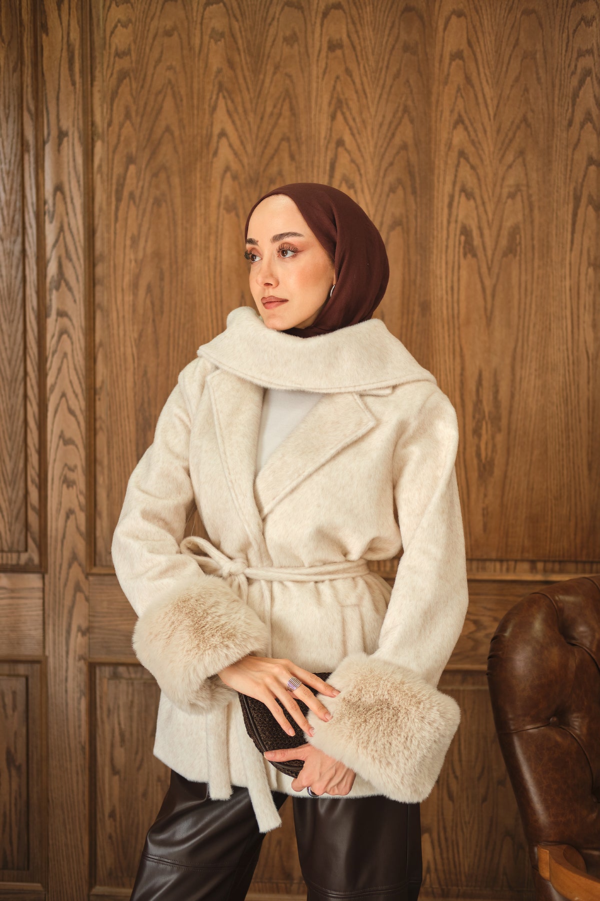 Wool Coat with Fur Trim and Bow Collar - Cream