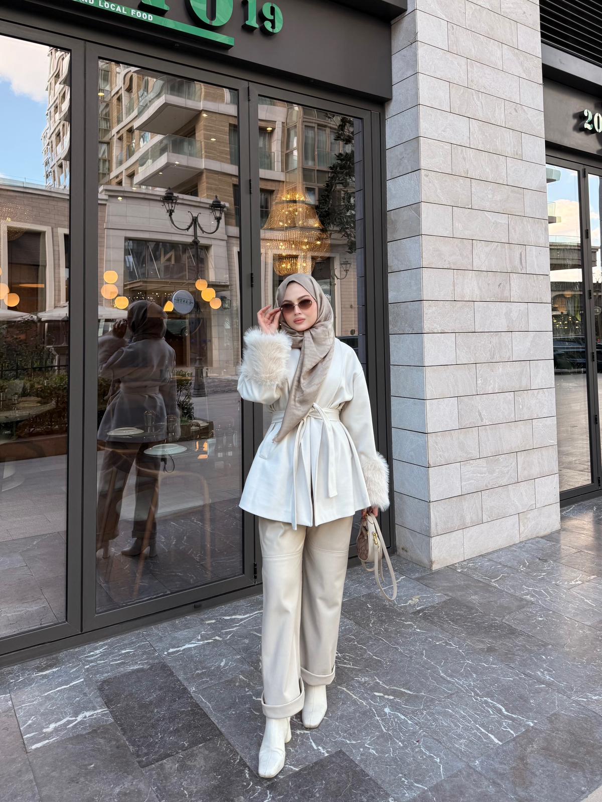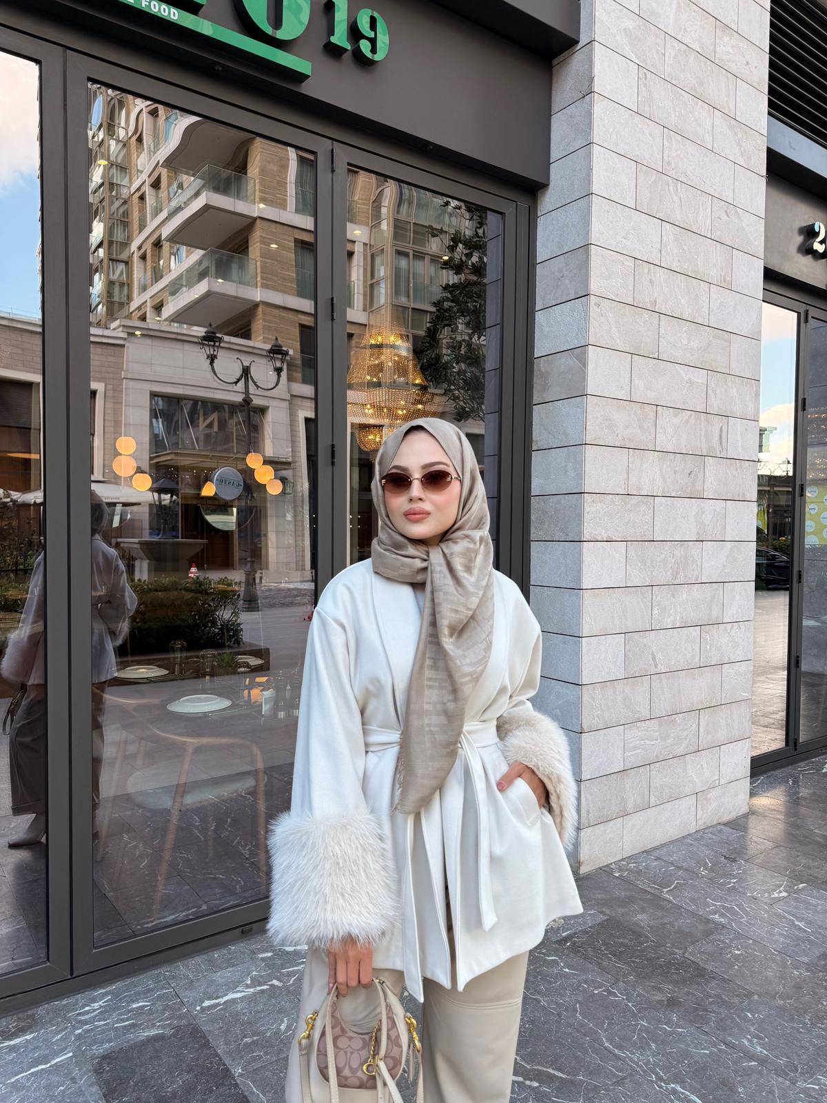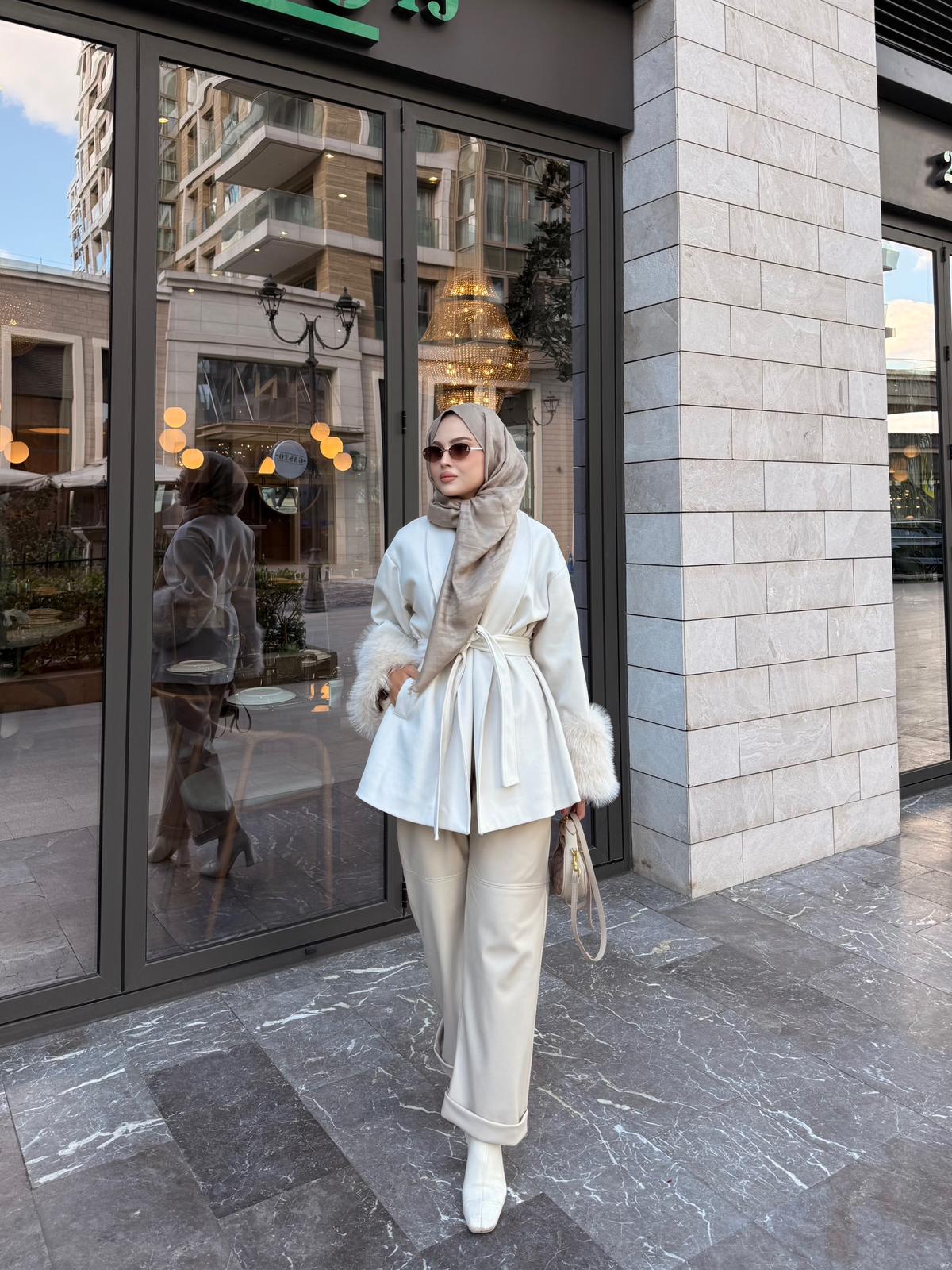 Wool Coat with Fur Trim and Bow Collar - Cream