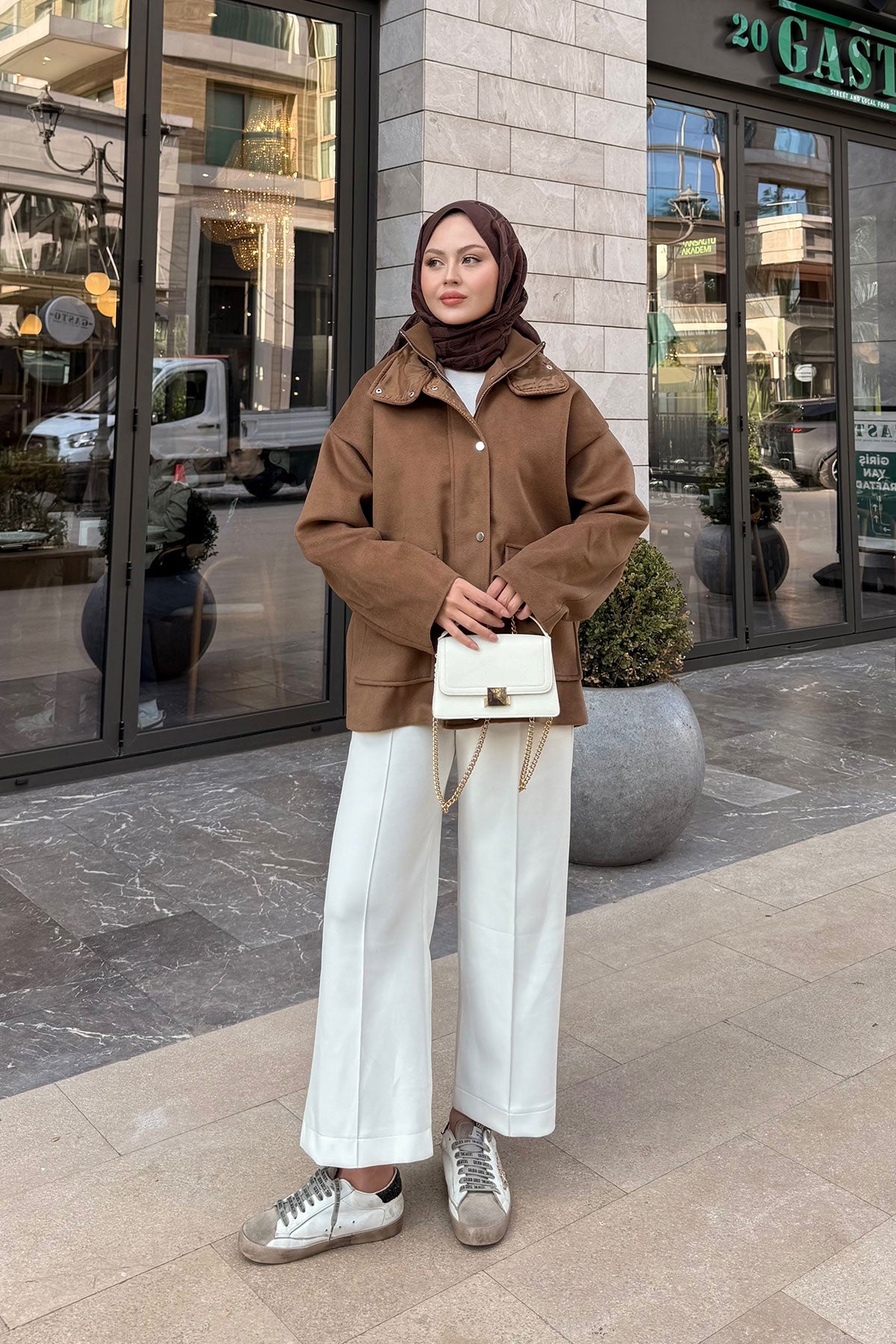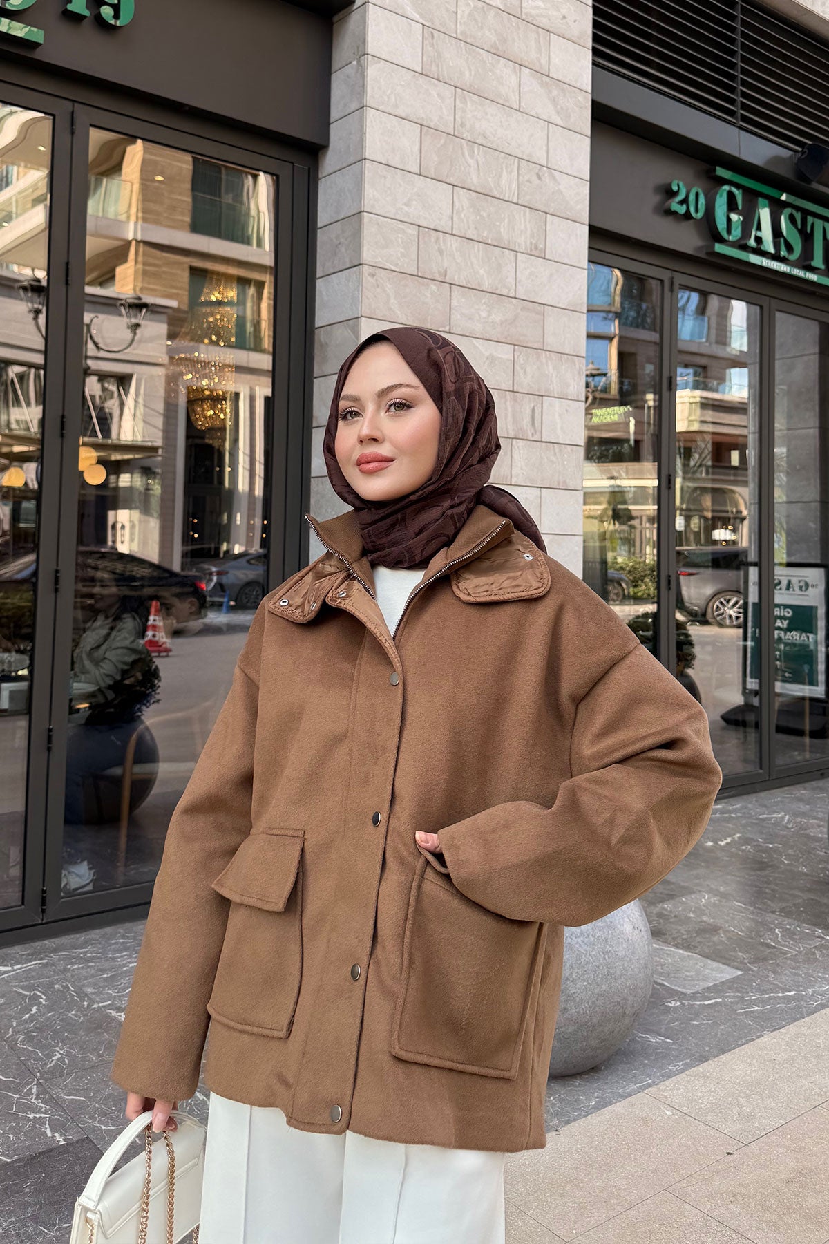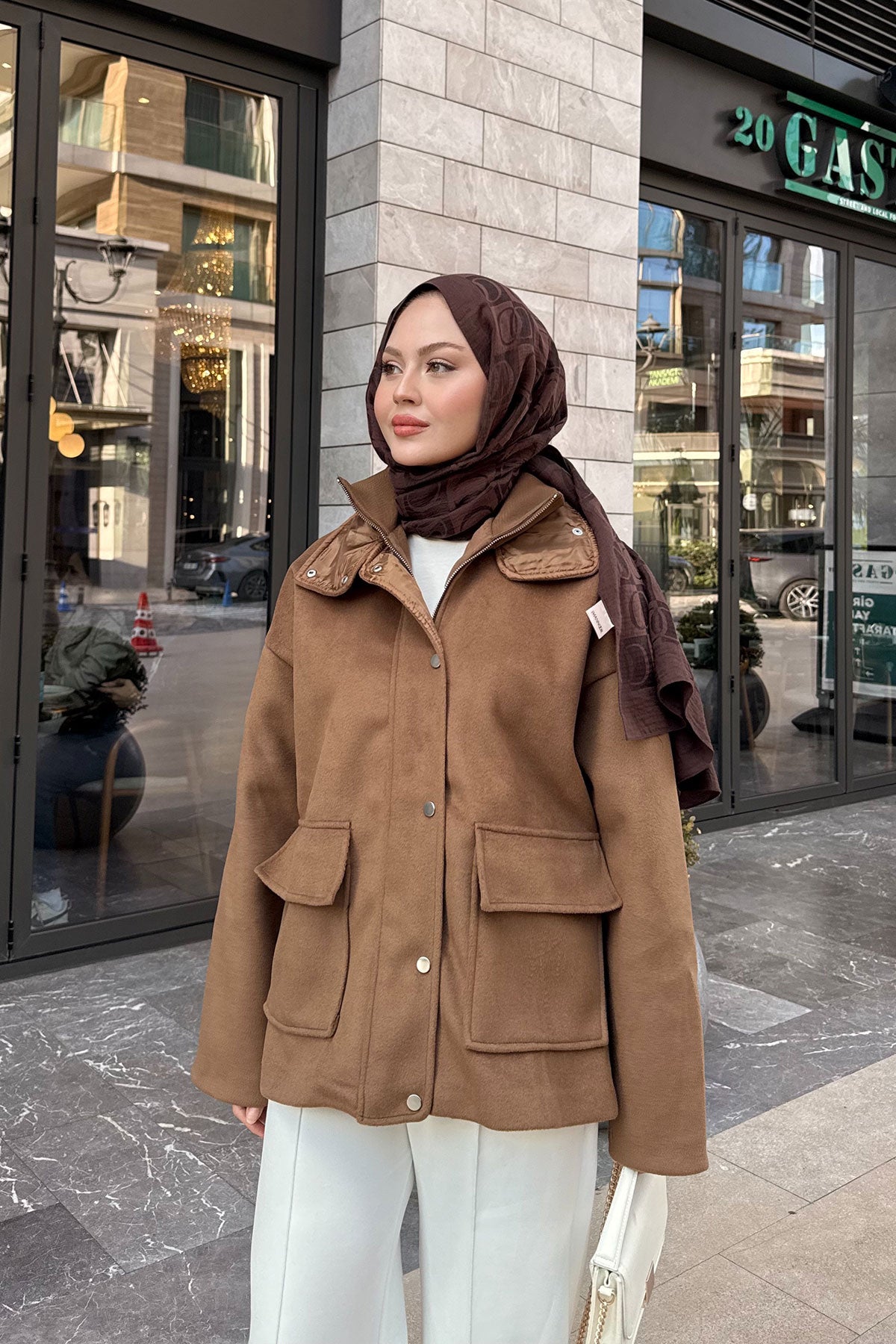 Yakası Lastik Detaylı Ceket Taba