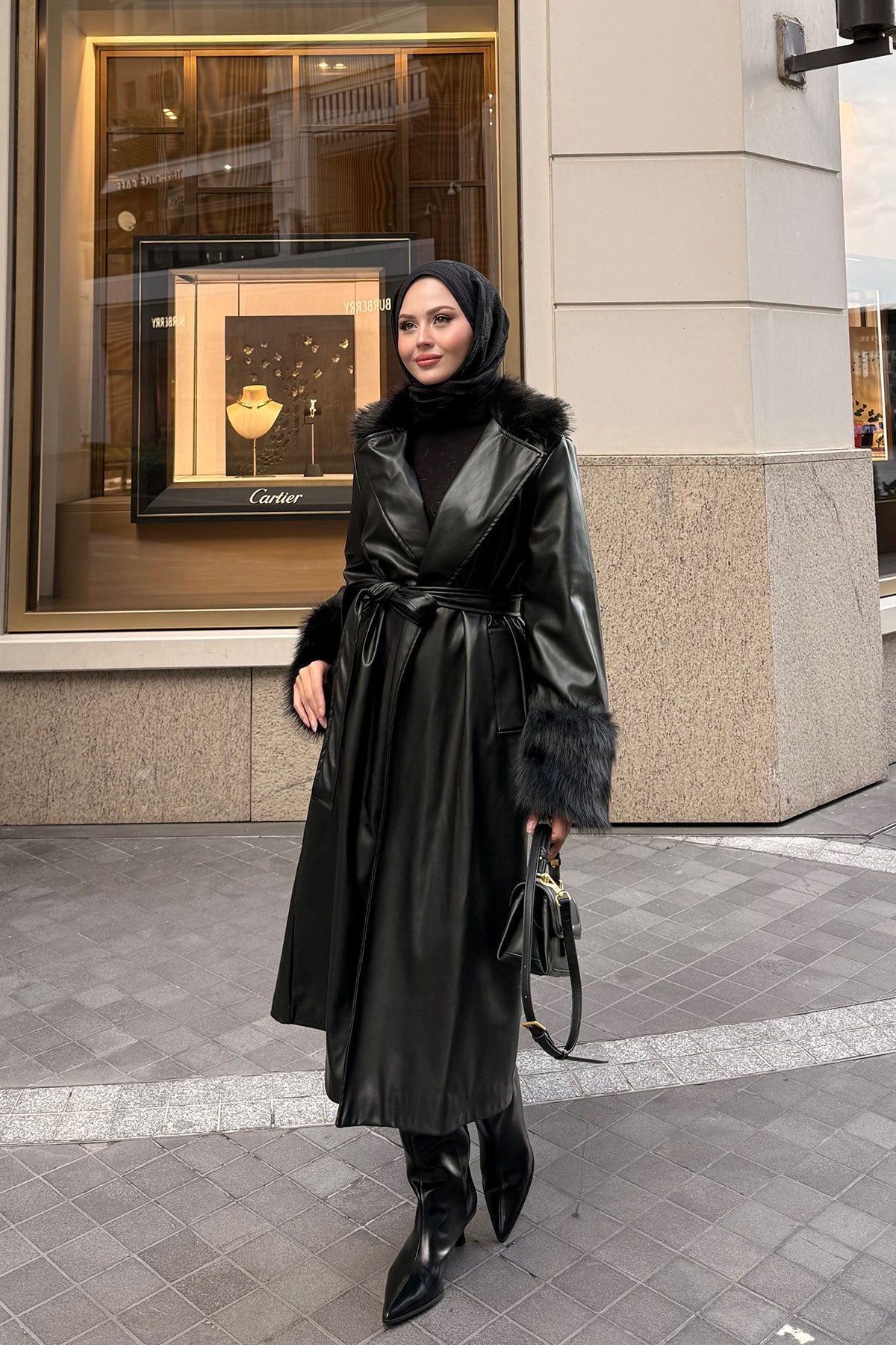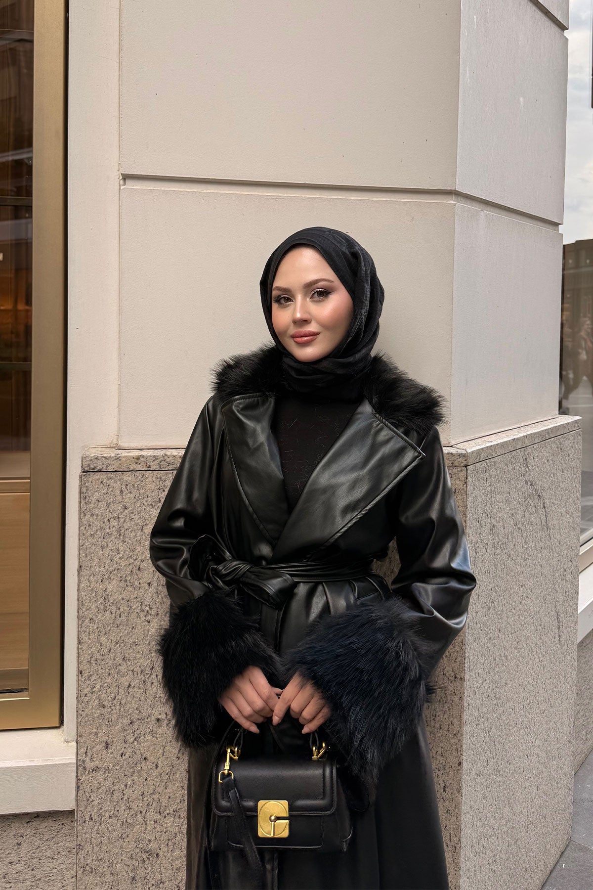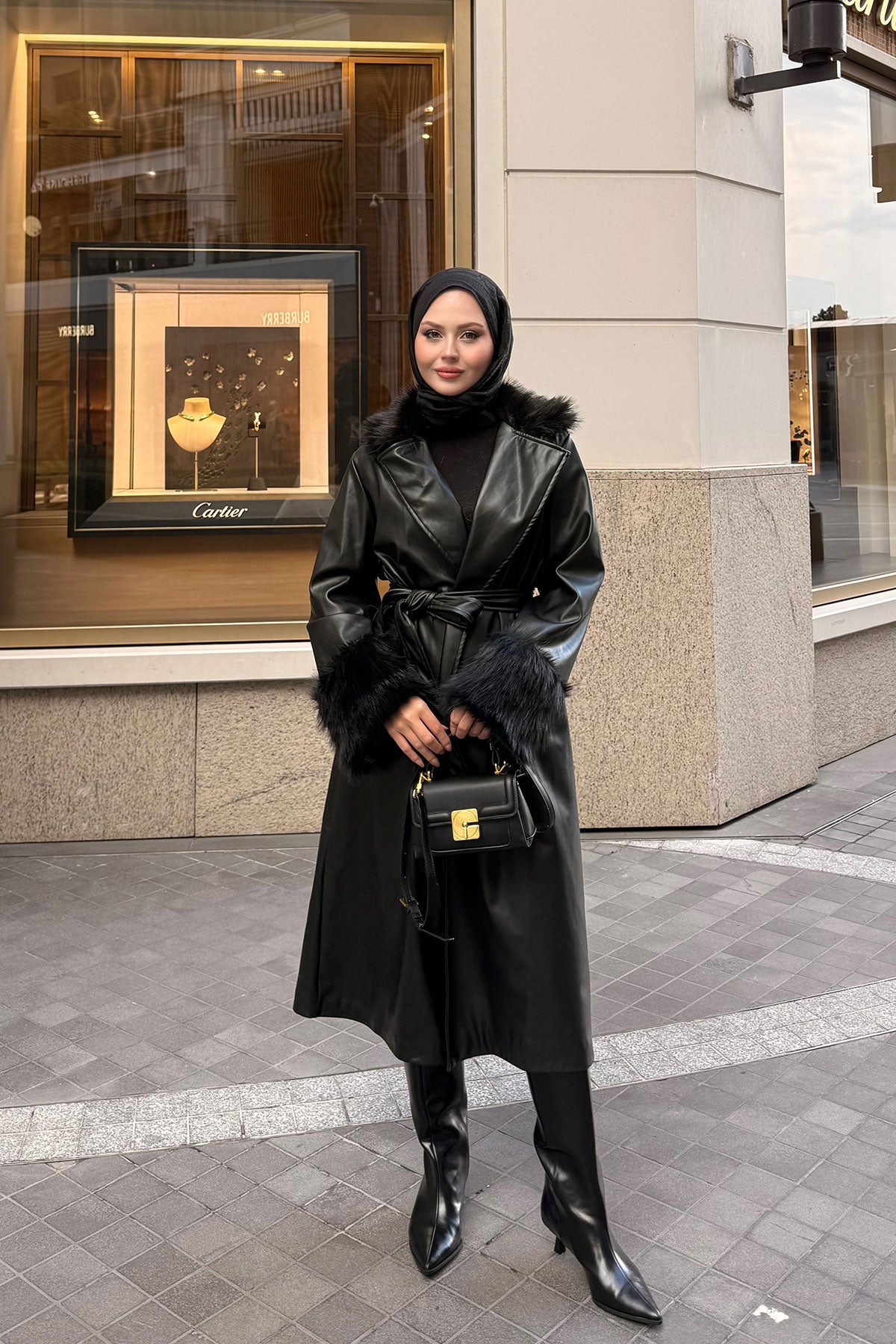 Yaka Kürk Detay Deri Trenç Siyah