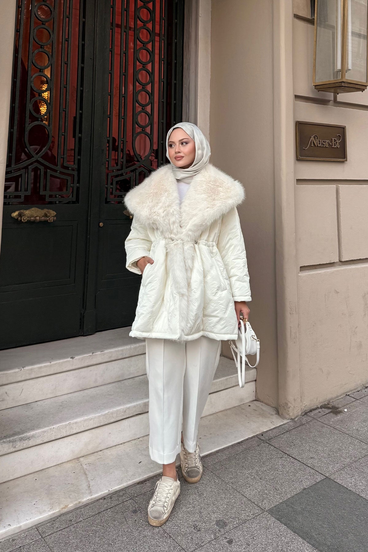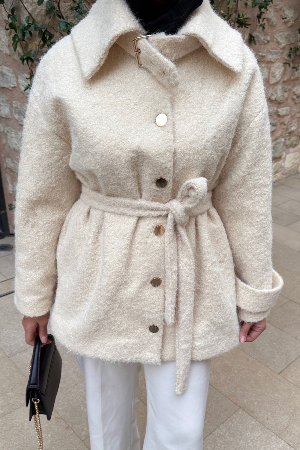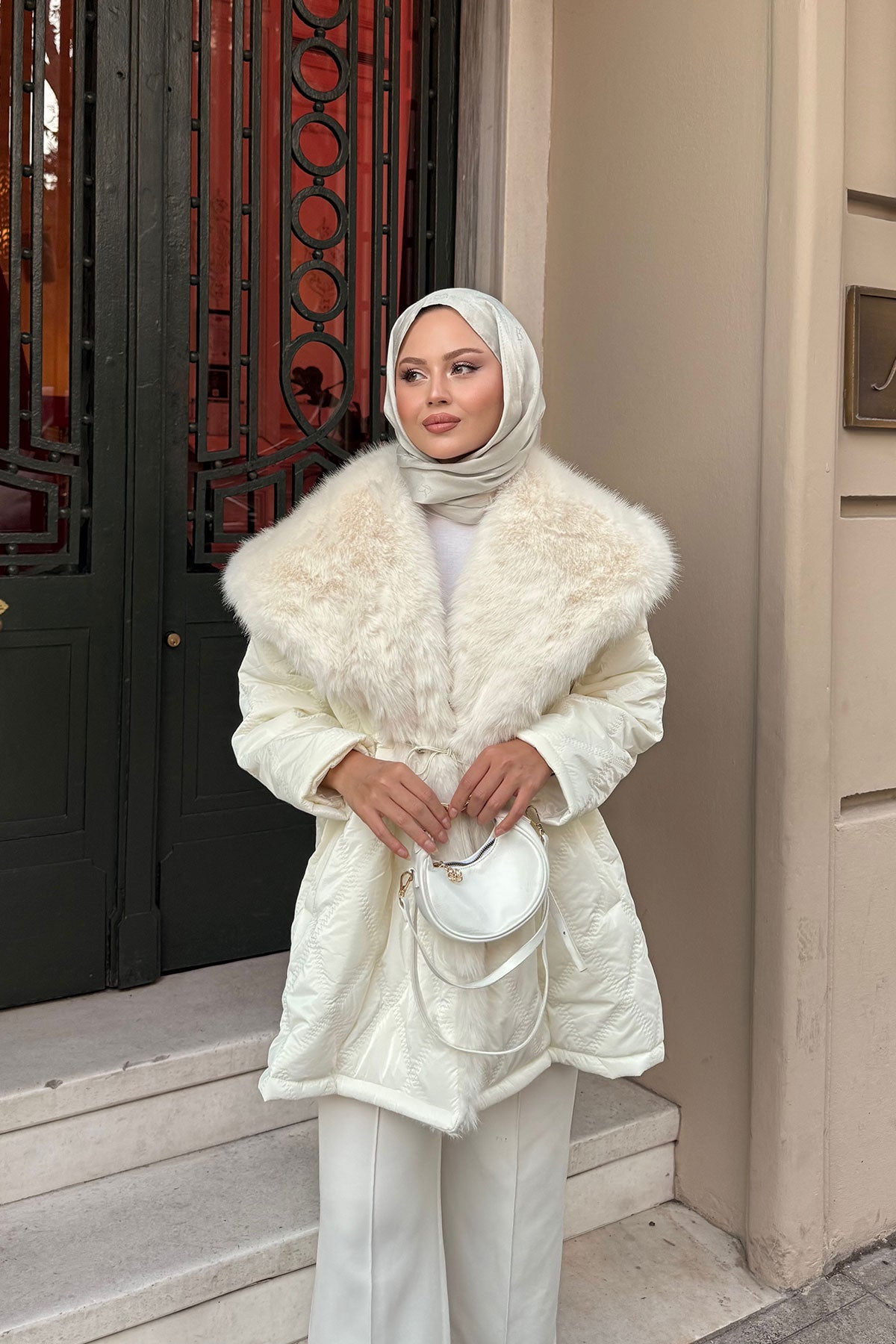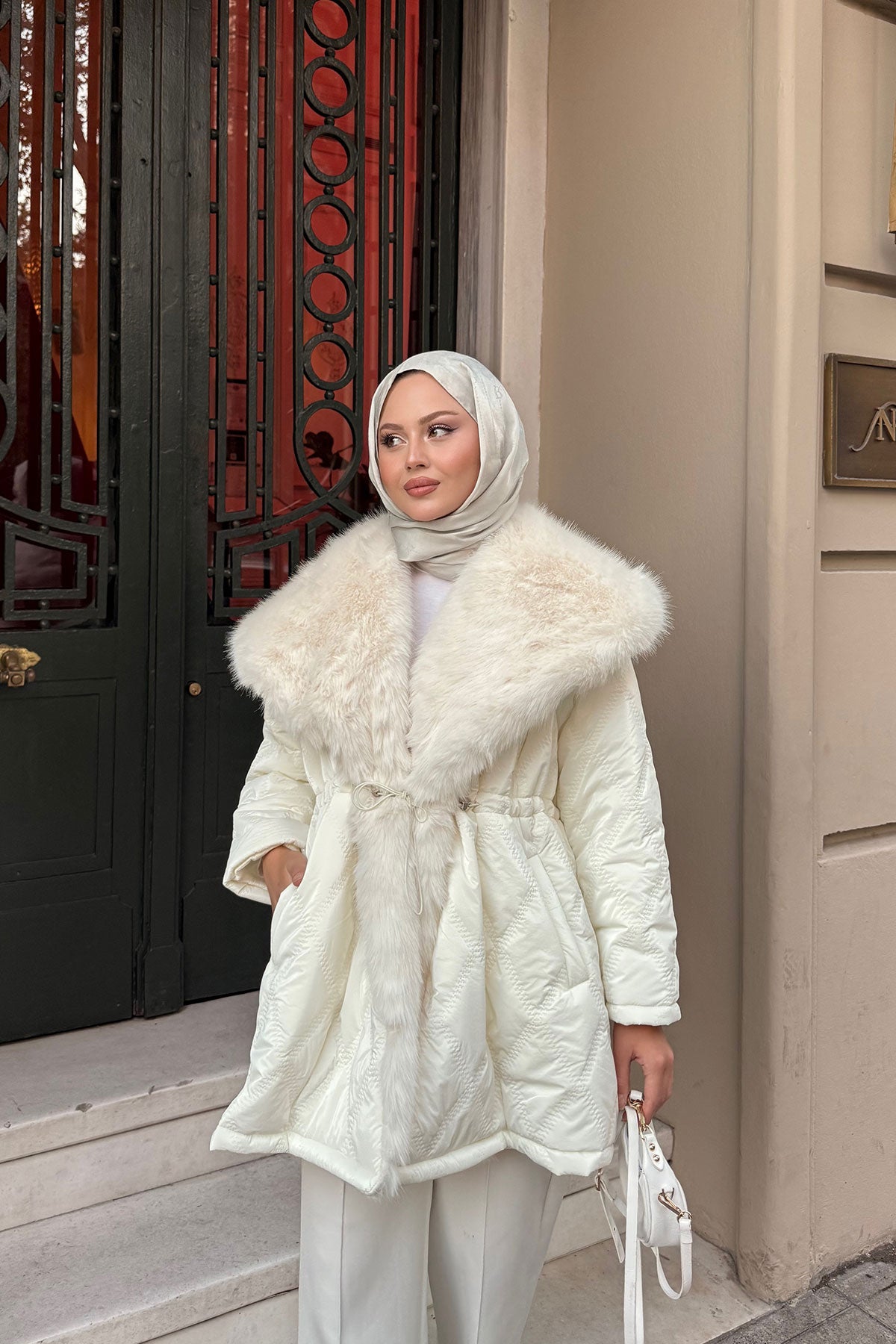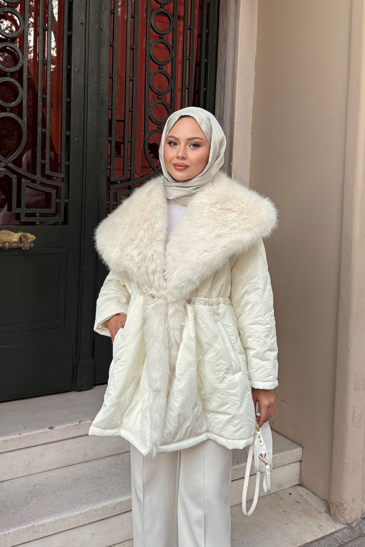 Yaka Kürk Detay Bel Bağlamalı Ceket Krem