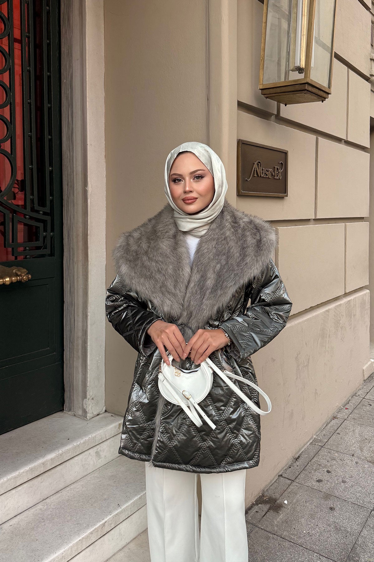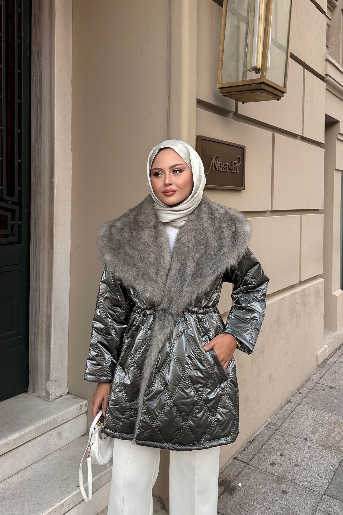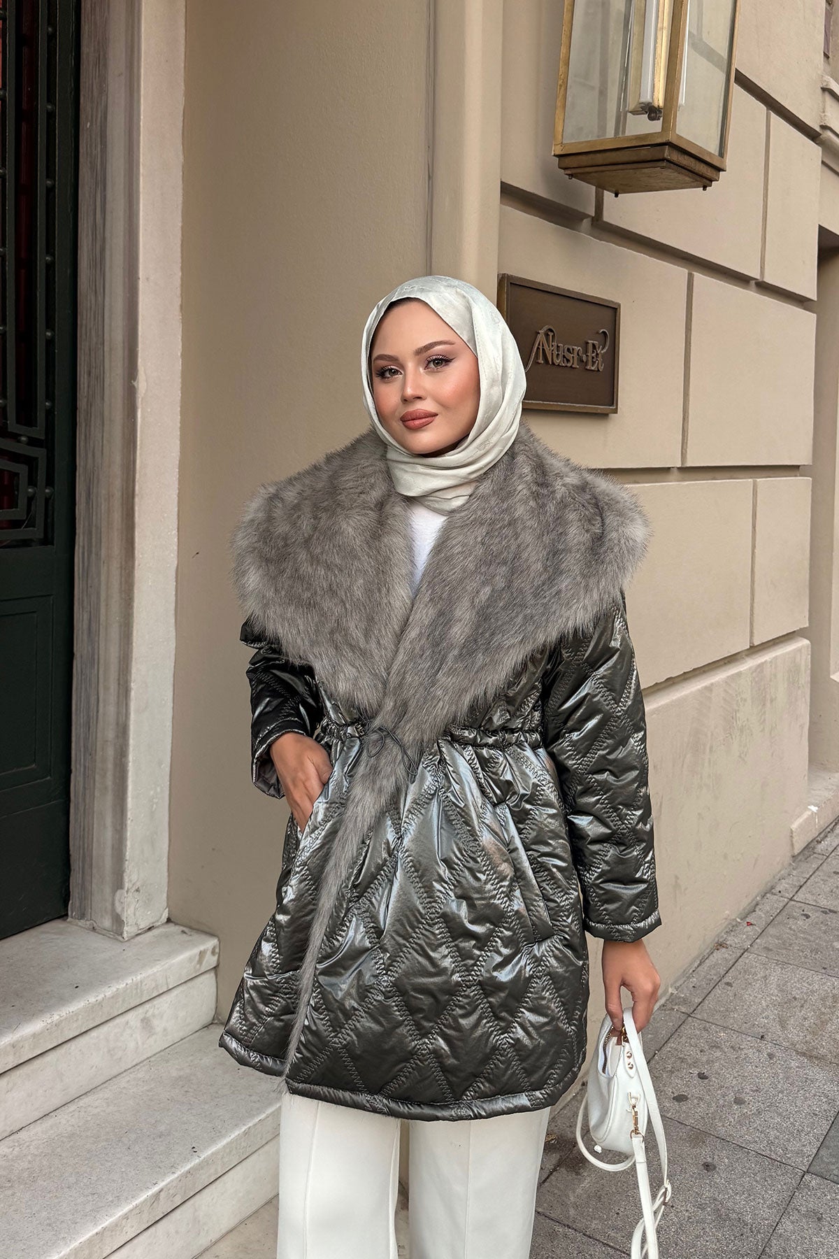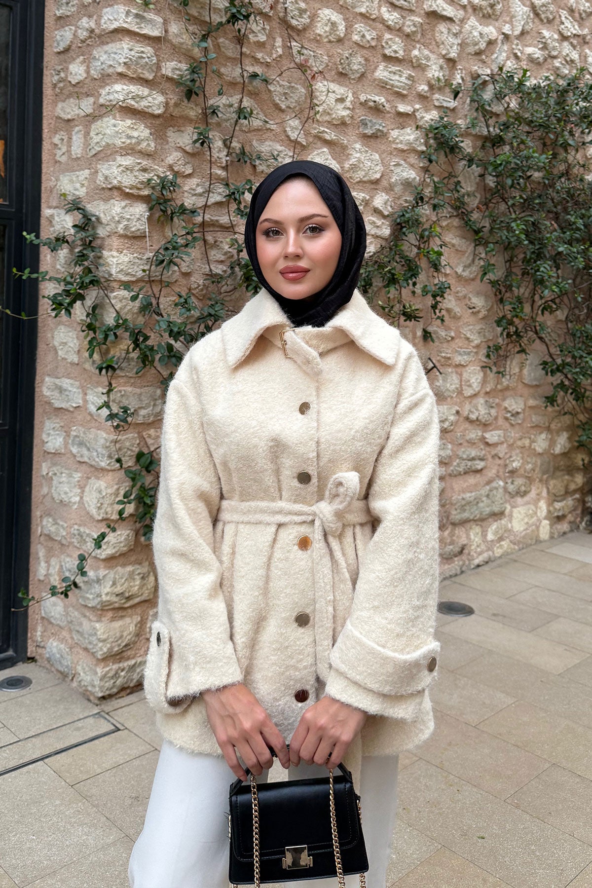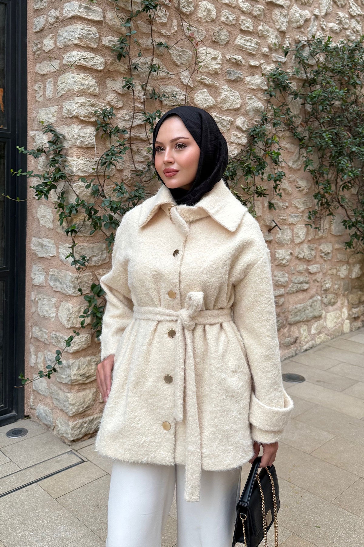 Yaka Kürk Detay Bel Bağlamalı Ceket Krem