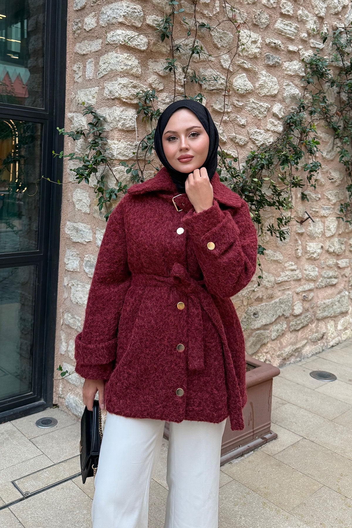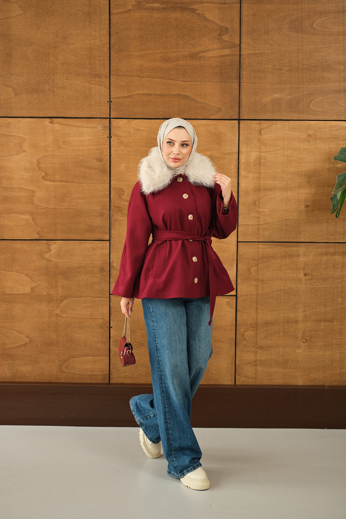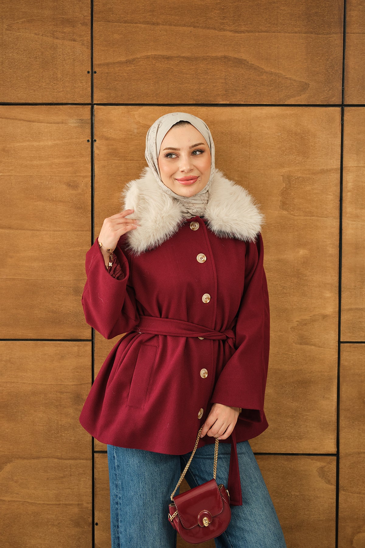 Yaka Kürk Detay Bel Bağlamalı Ceket Bordo