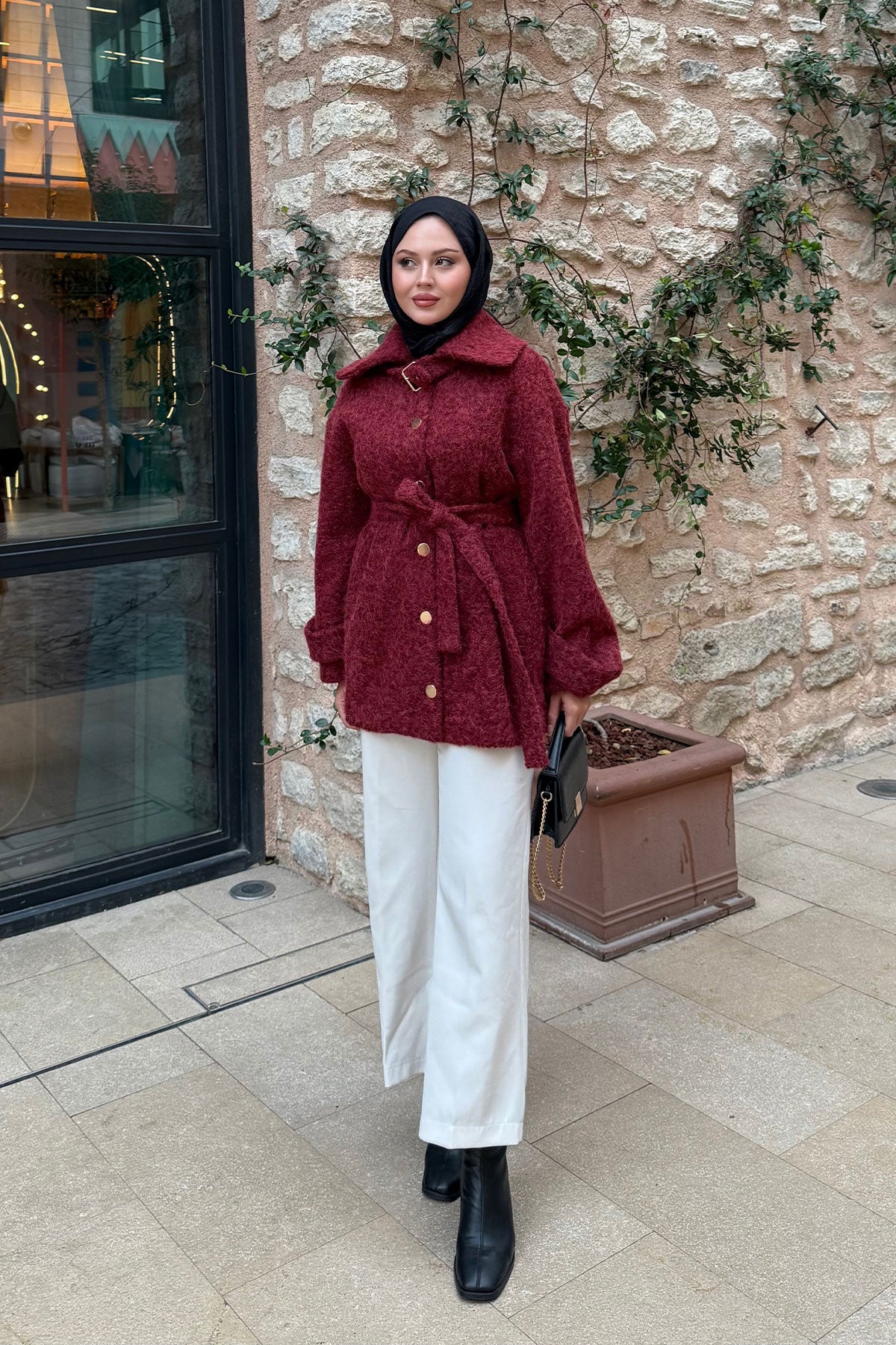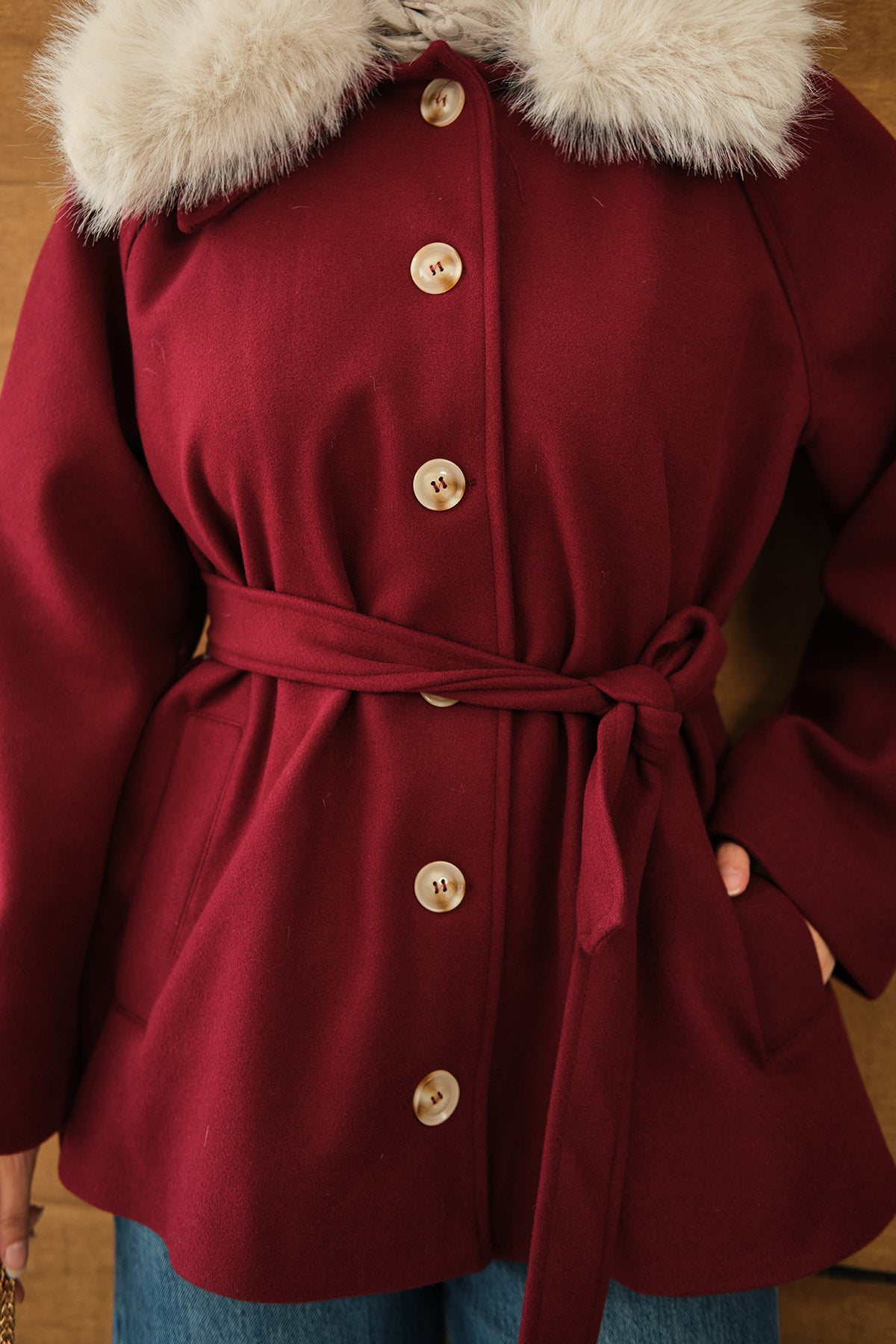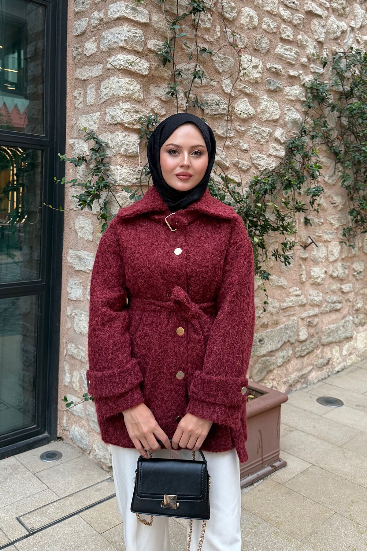 Yaka Kürk Detay Bel Bağlamalı Ceket Bordo