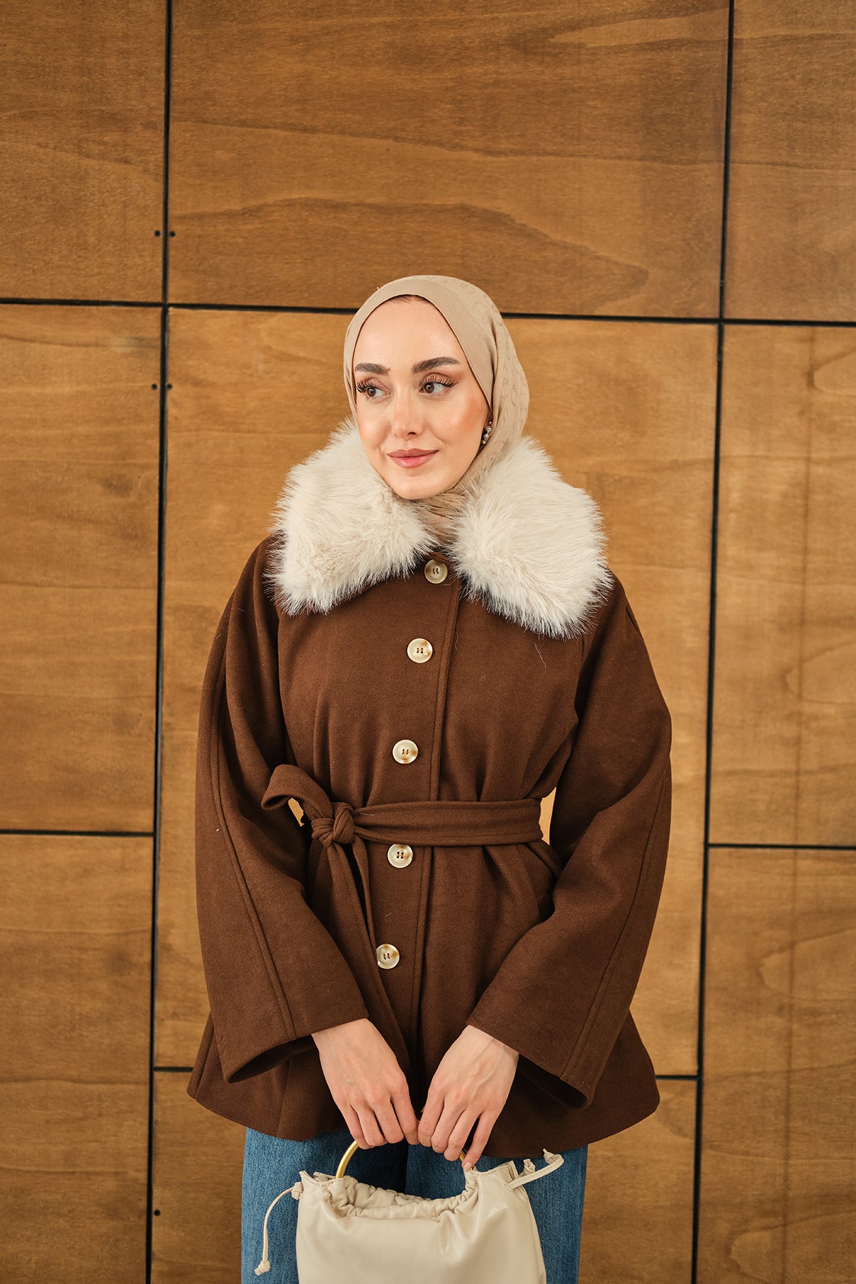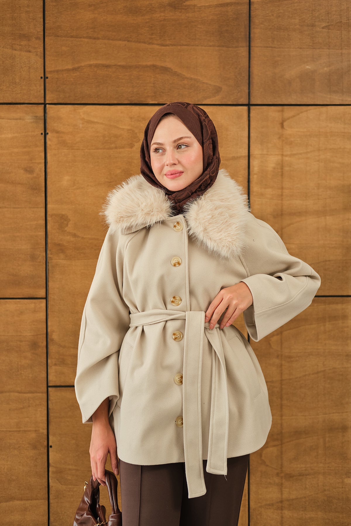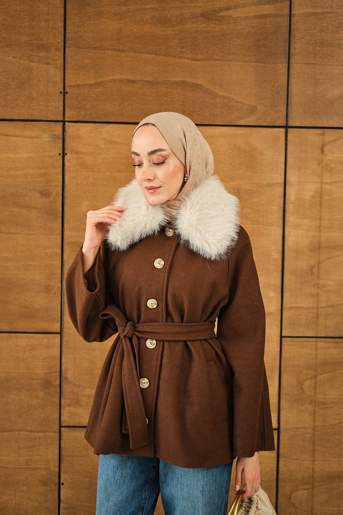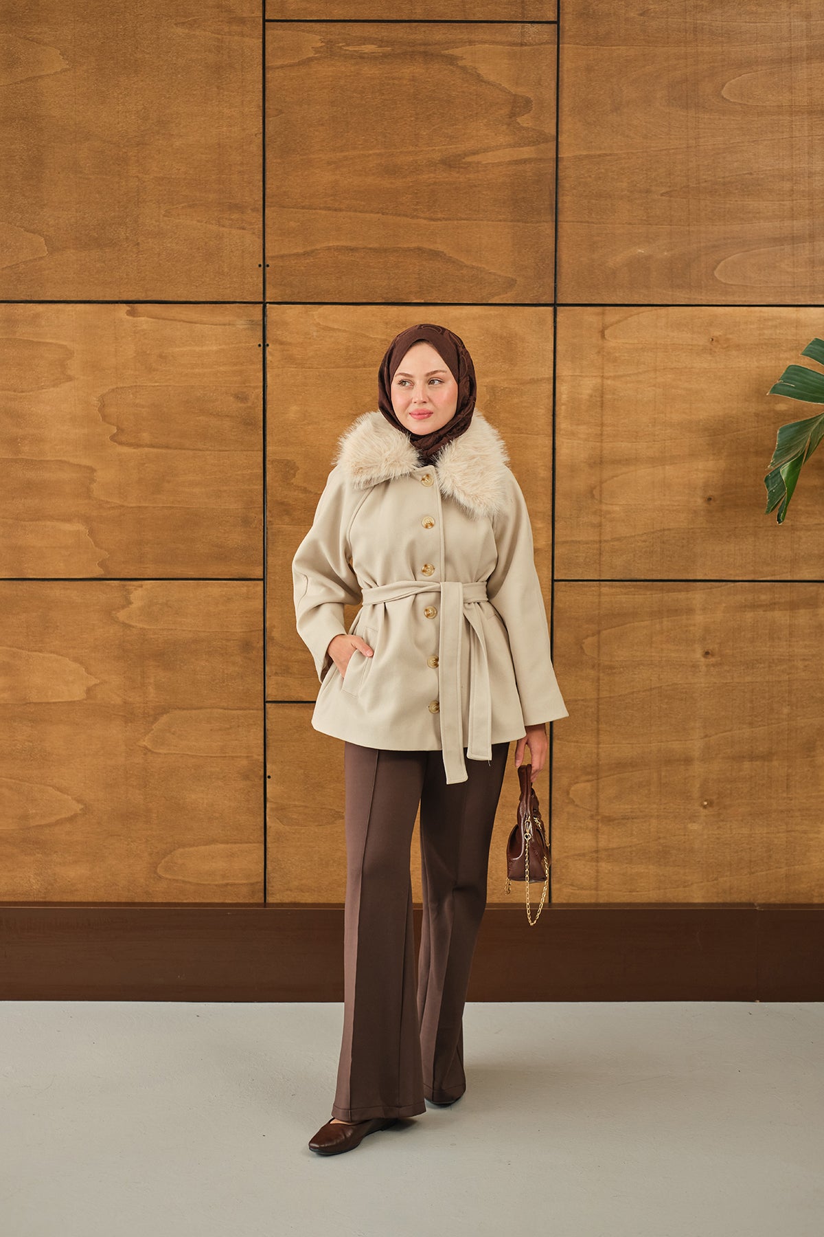 Yaka Kürk Detay Bel Bağlamalı Ceket Kahverengi