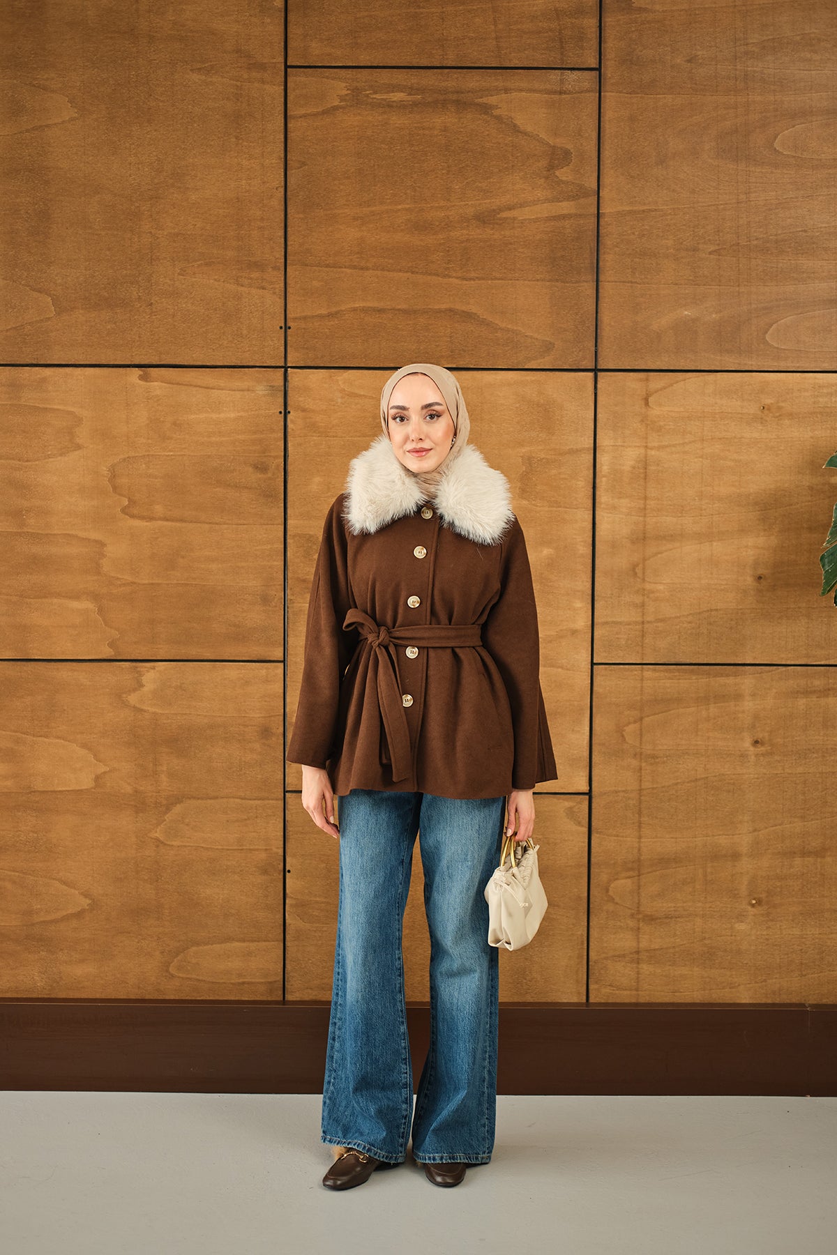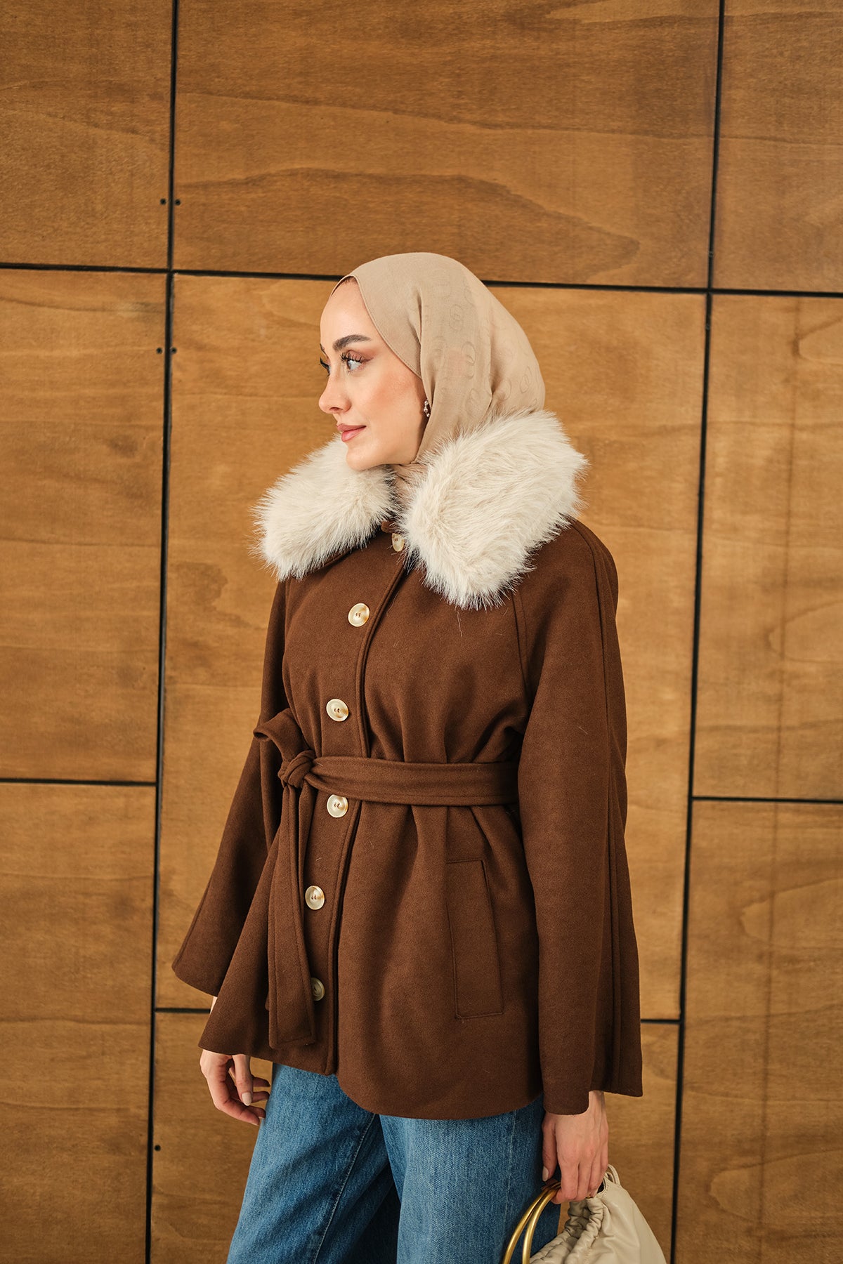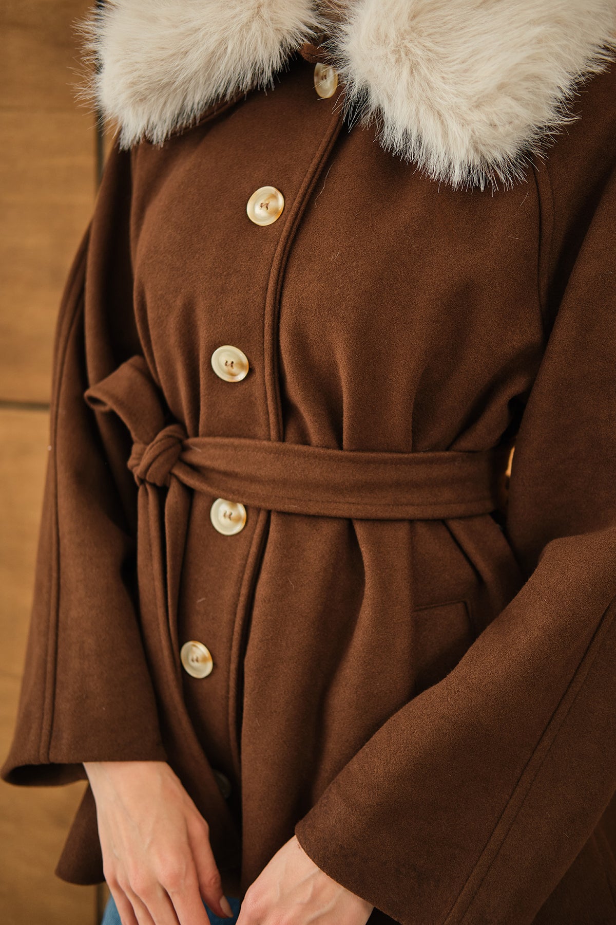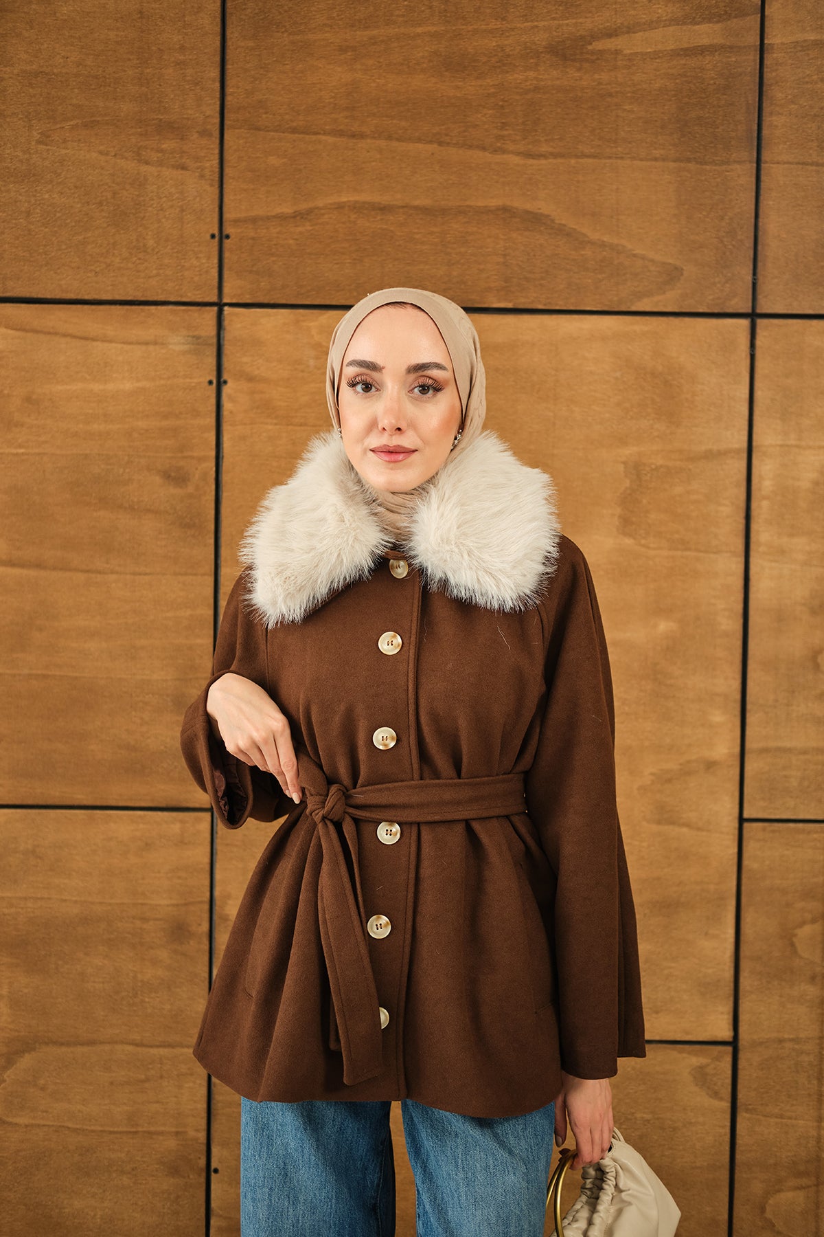 Yaka Kürk Detay Bel Bağlamalı Ceket Kahverengi