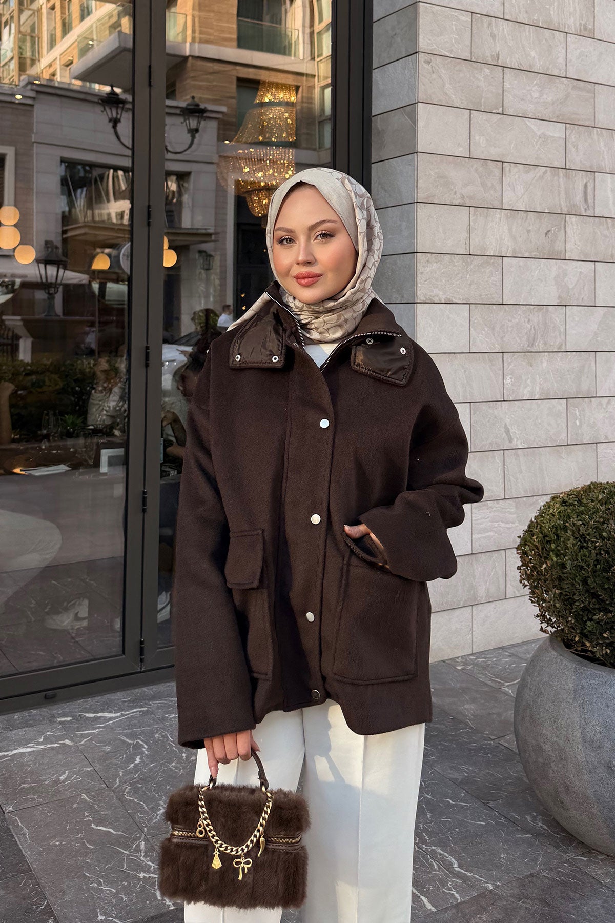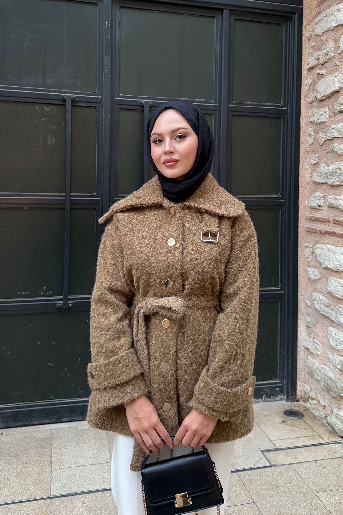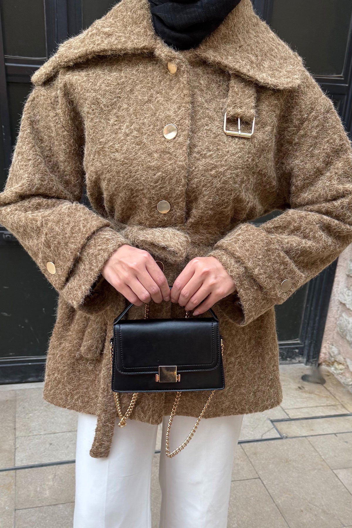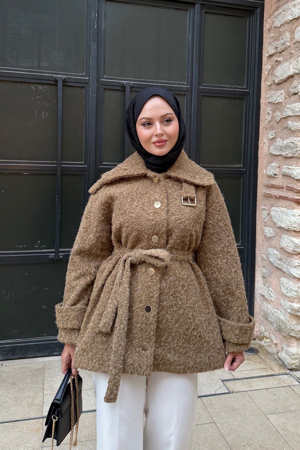 Yaka Kürk Detay Bel Bağlamalı Ceket Kahverengi