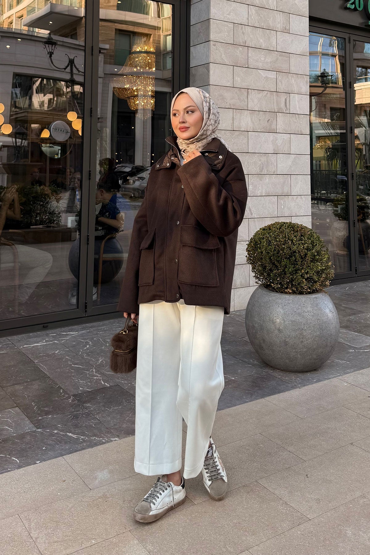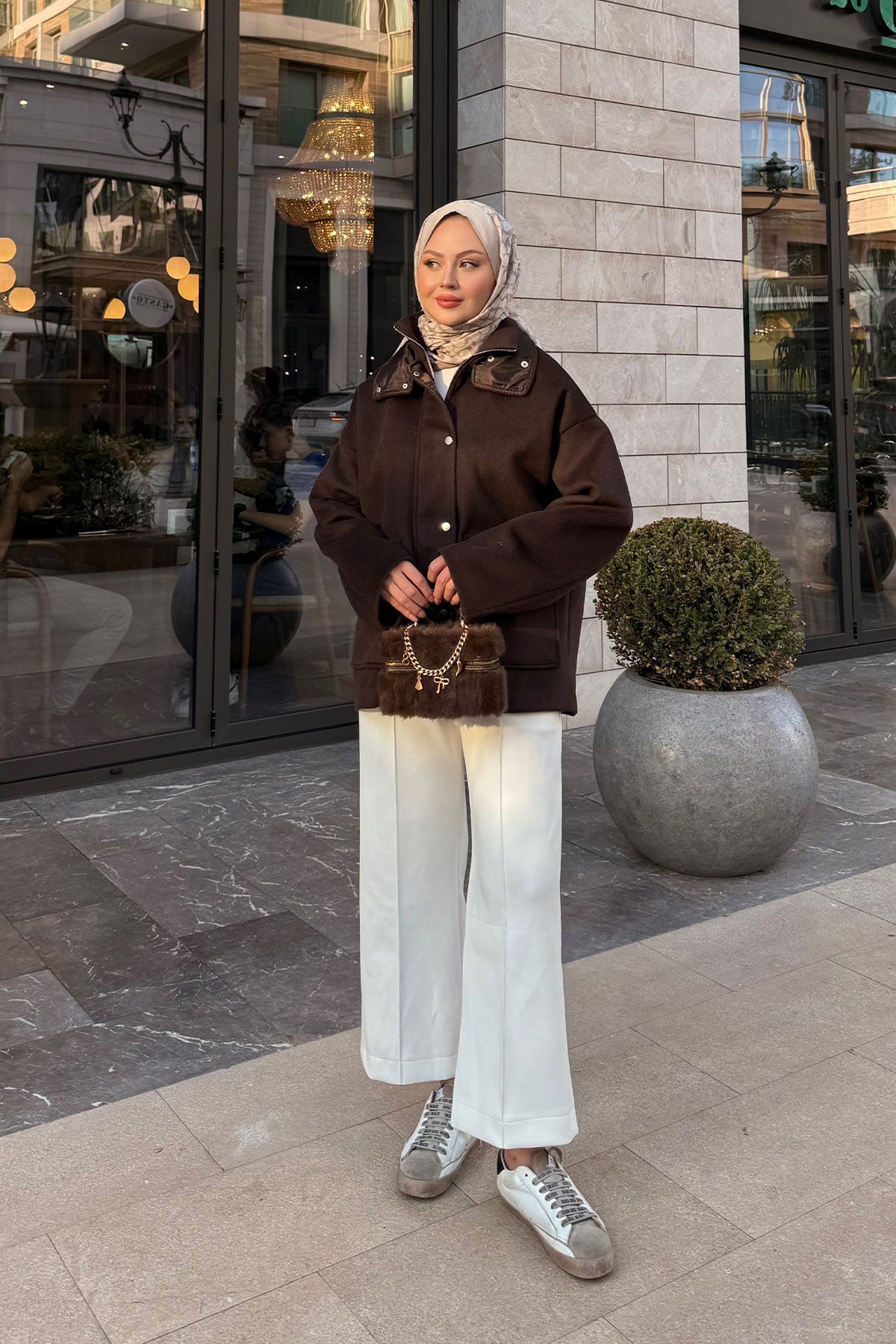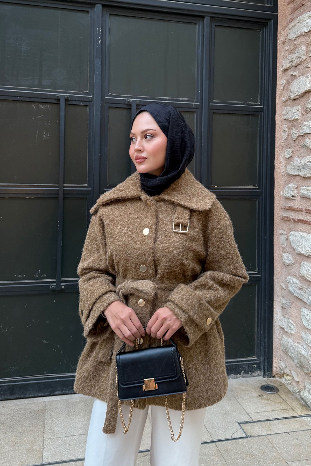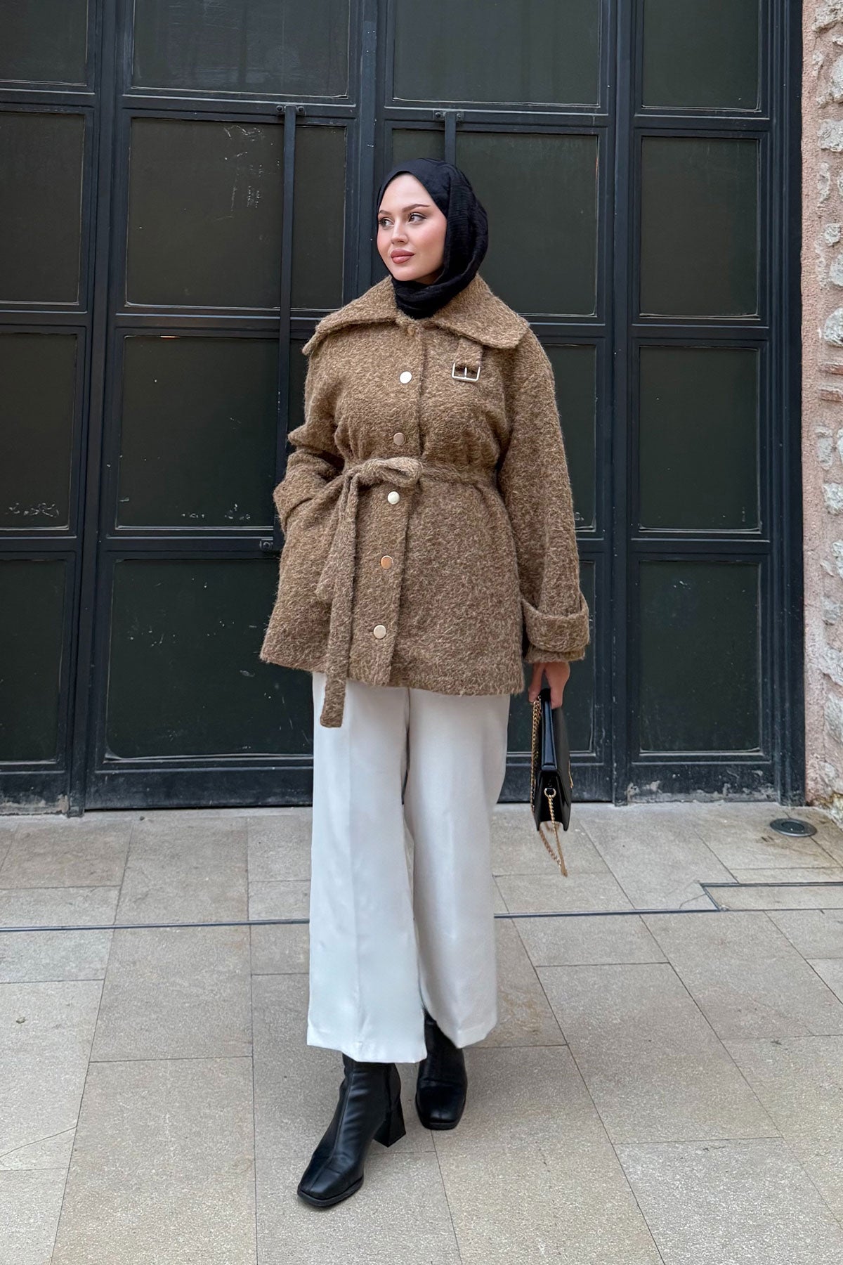 Yaka Kürk Detay Bel Bağlamalı Ceket Kahverengi