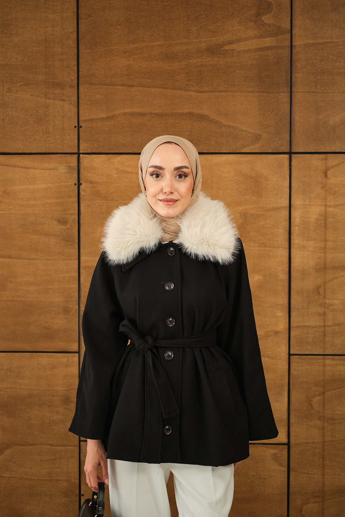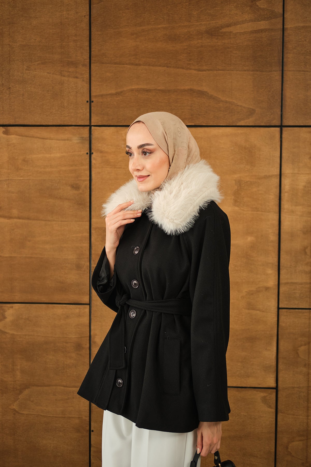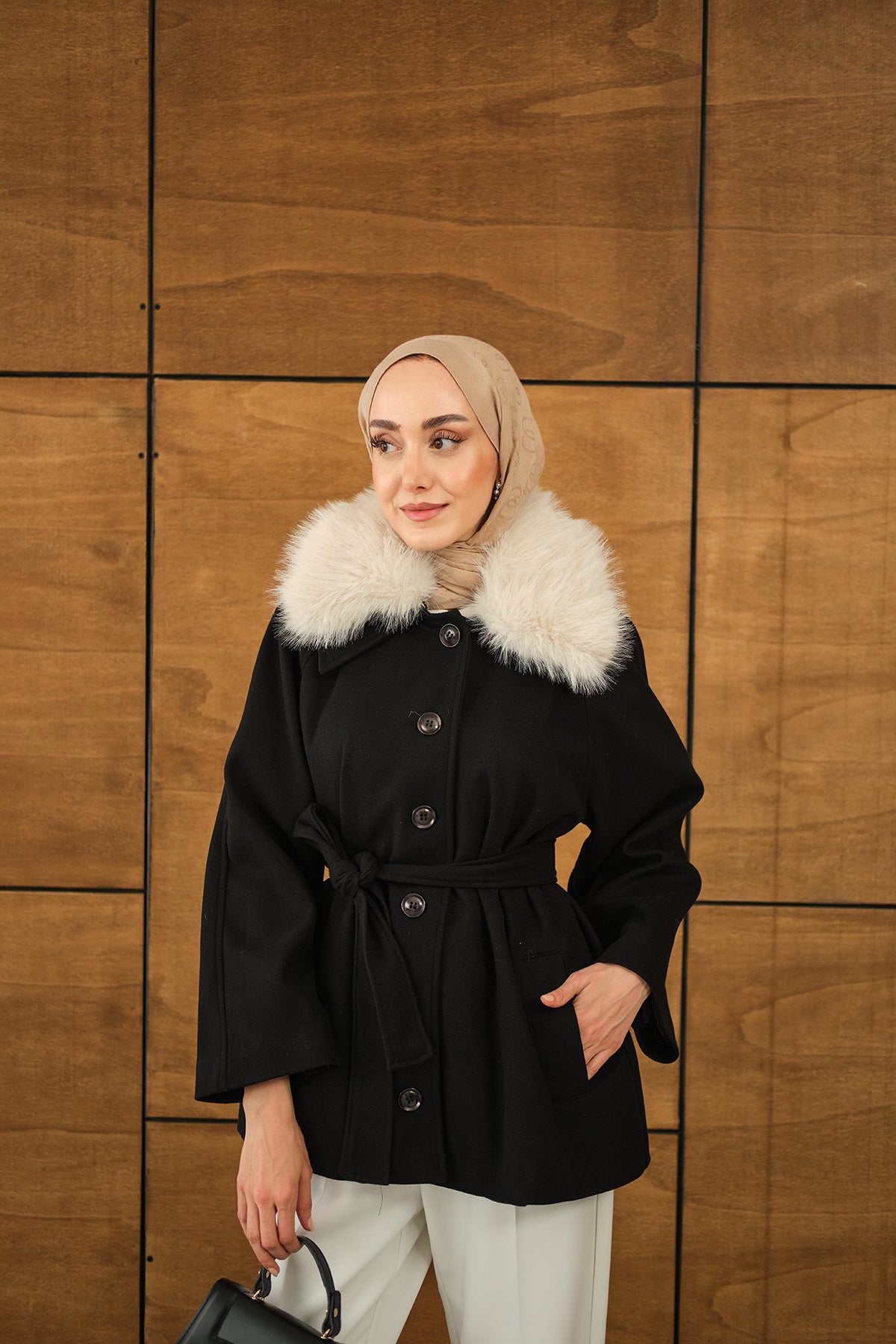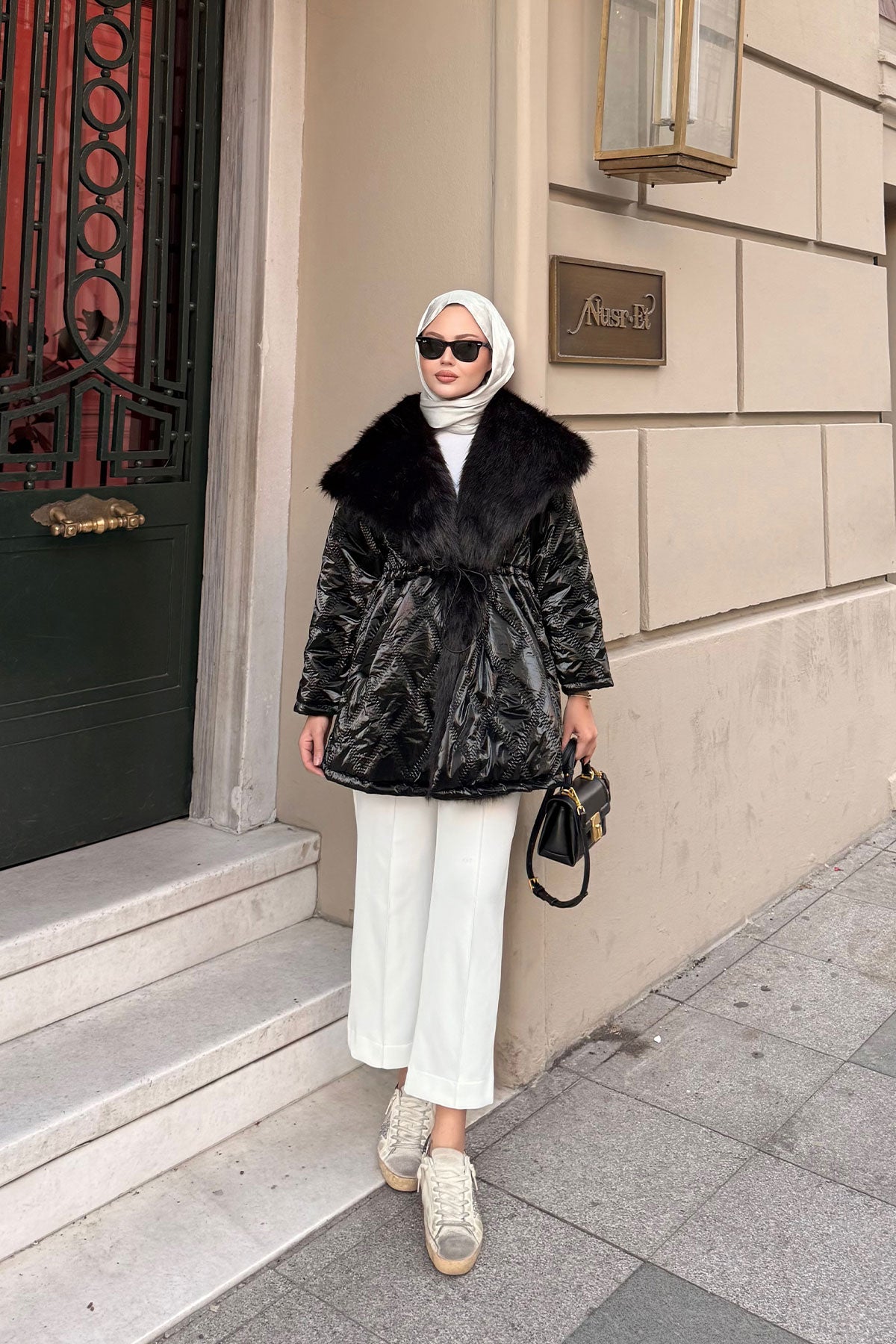 Yaka Kürk Detay Bel Bağlamalı Ceket Siyah