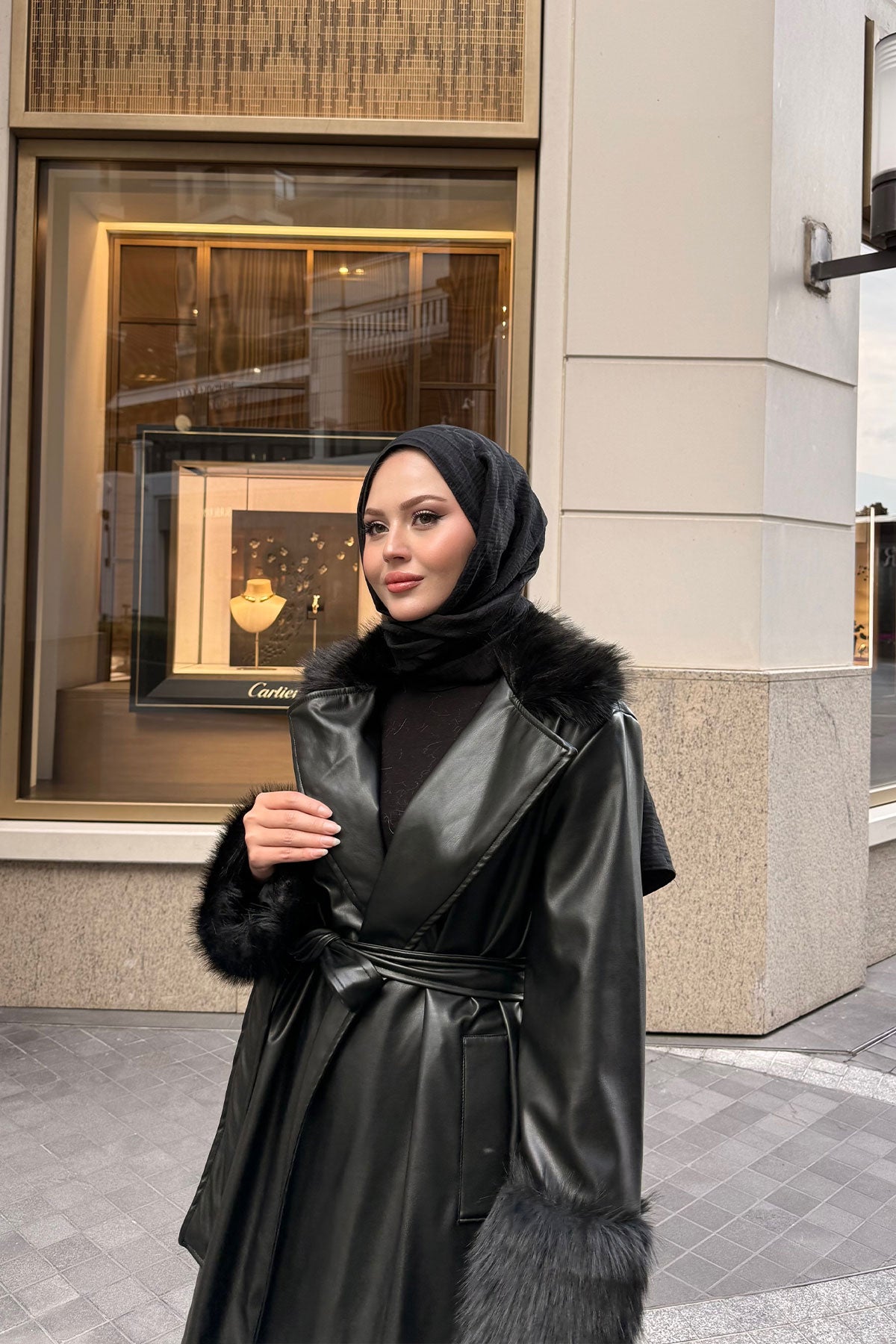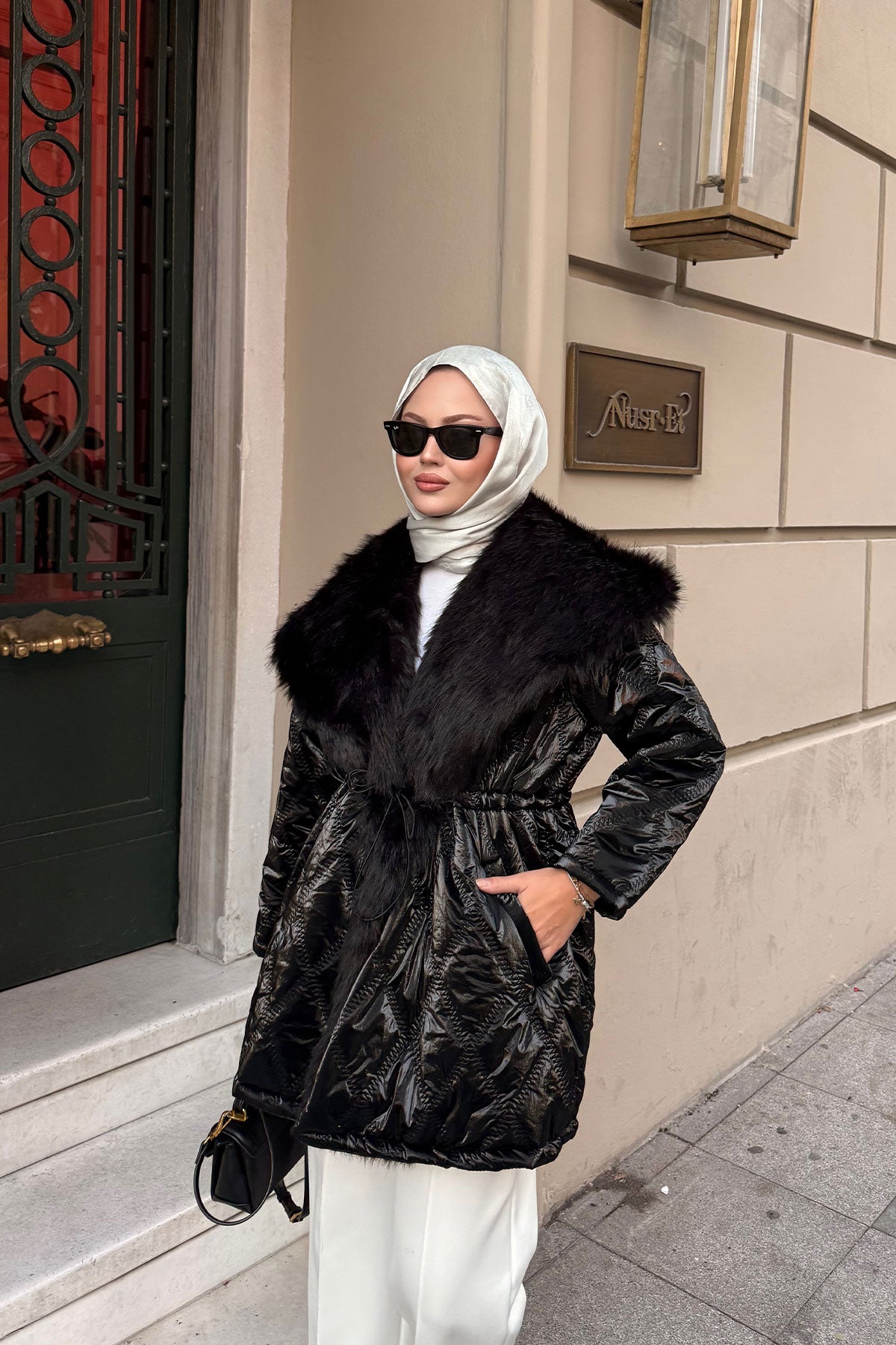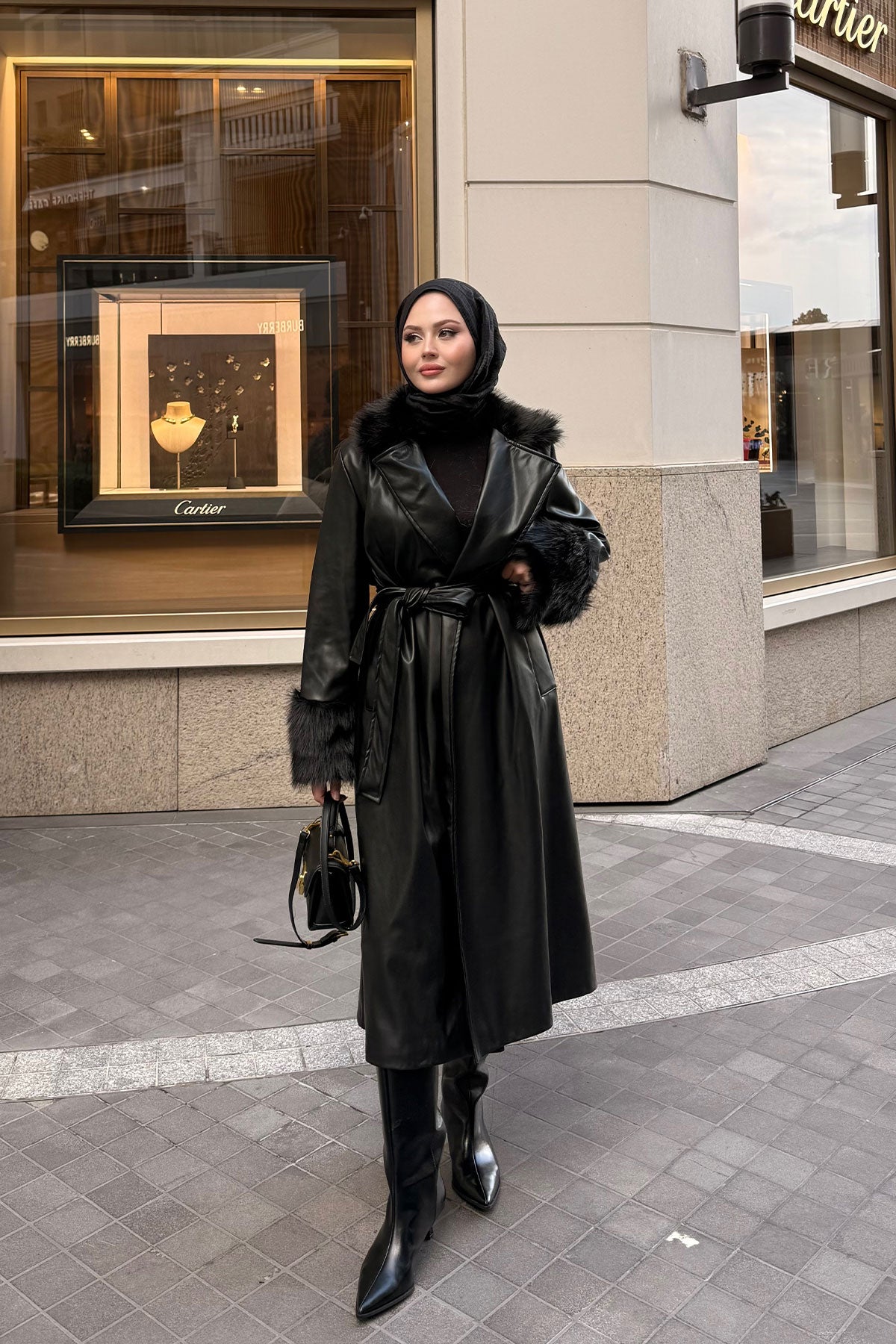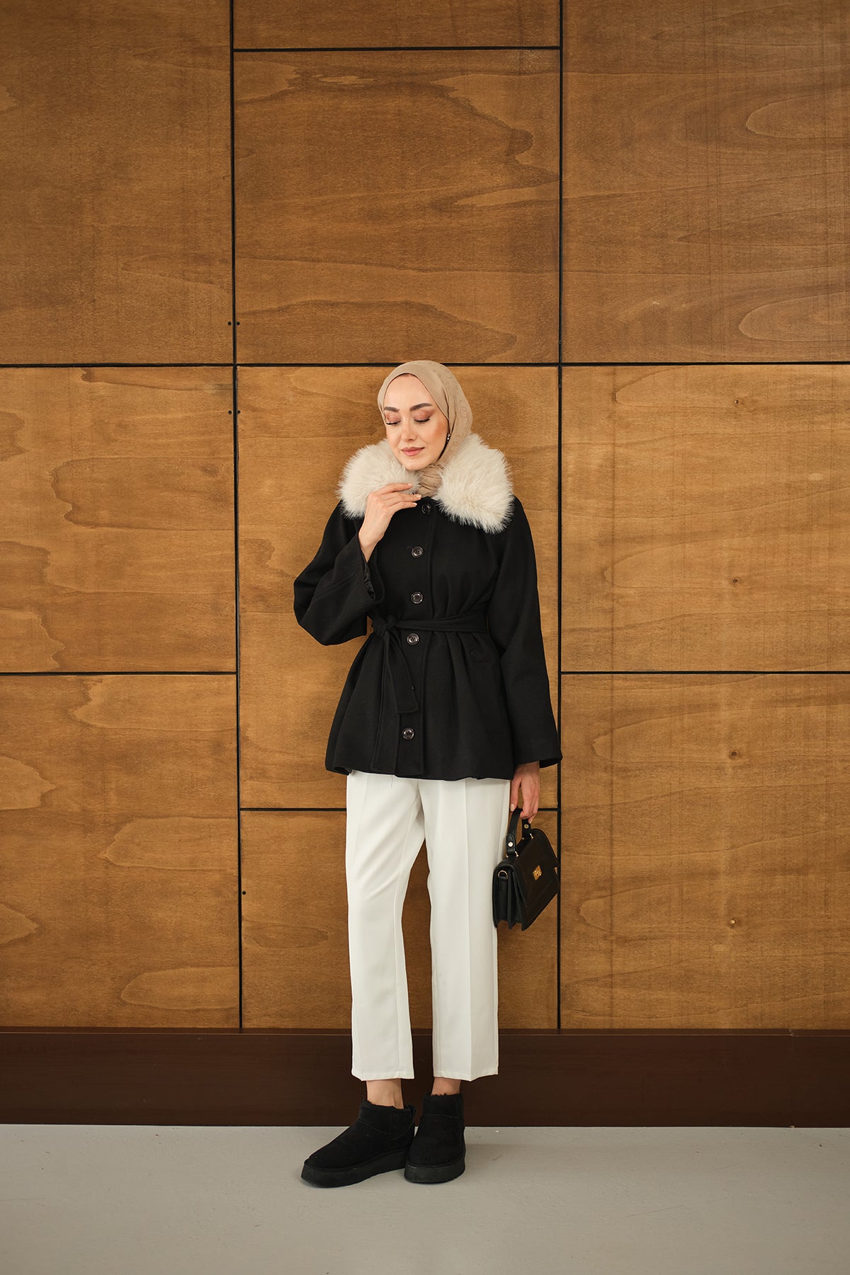 Yaka Kürk Detay Bel Bağlamalı Ceket Siyah