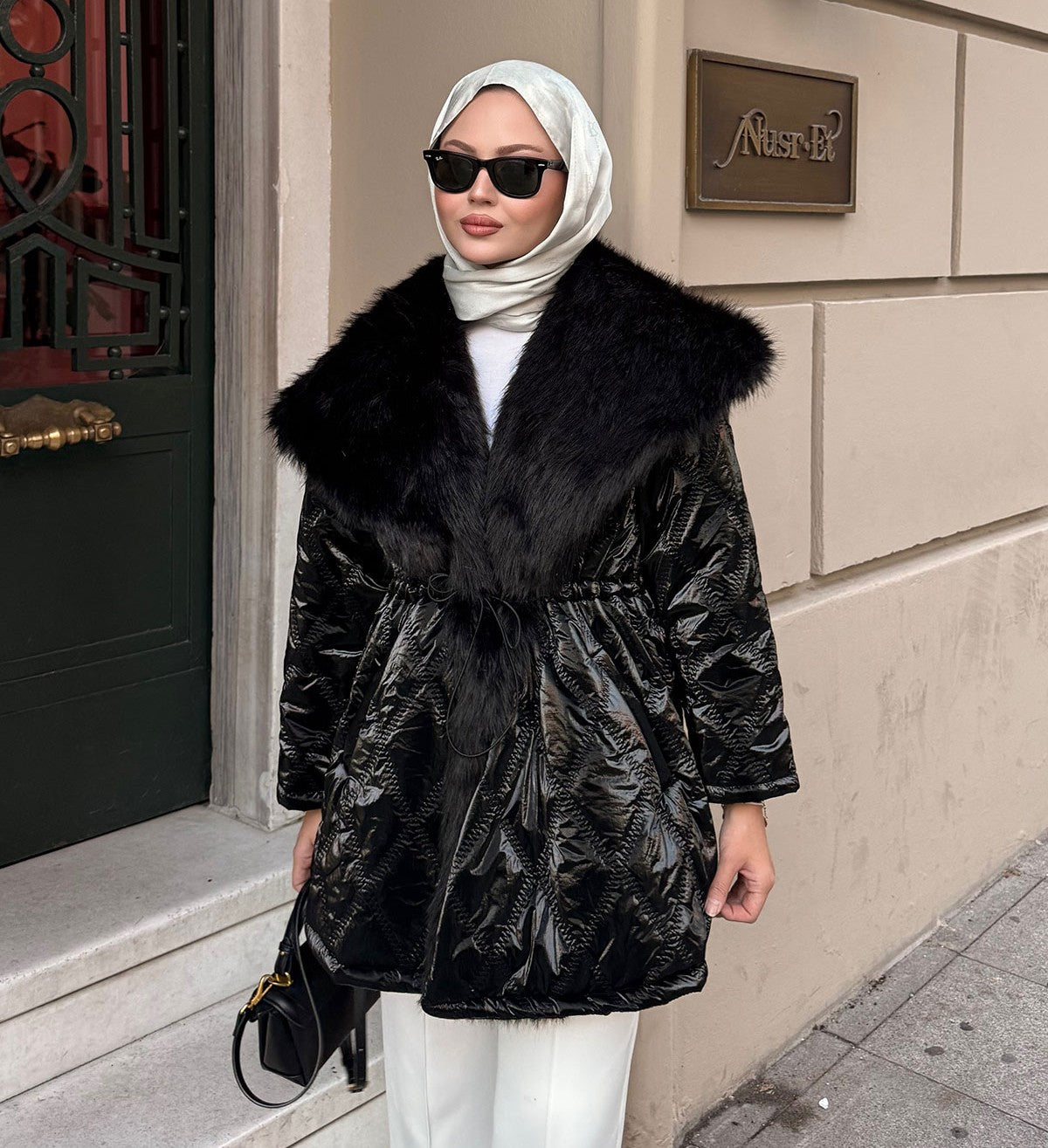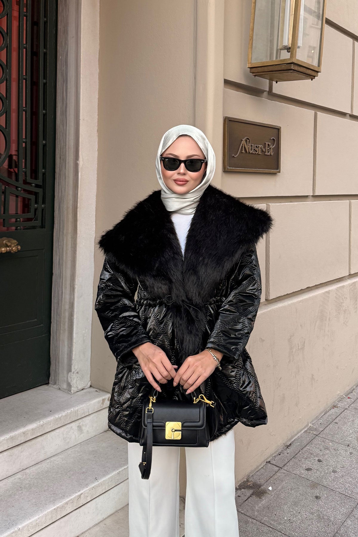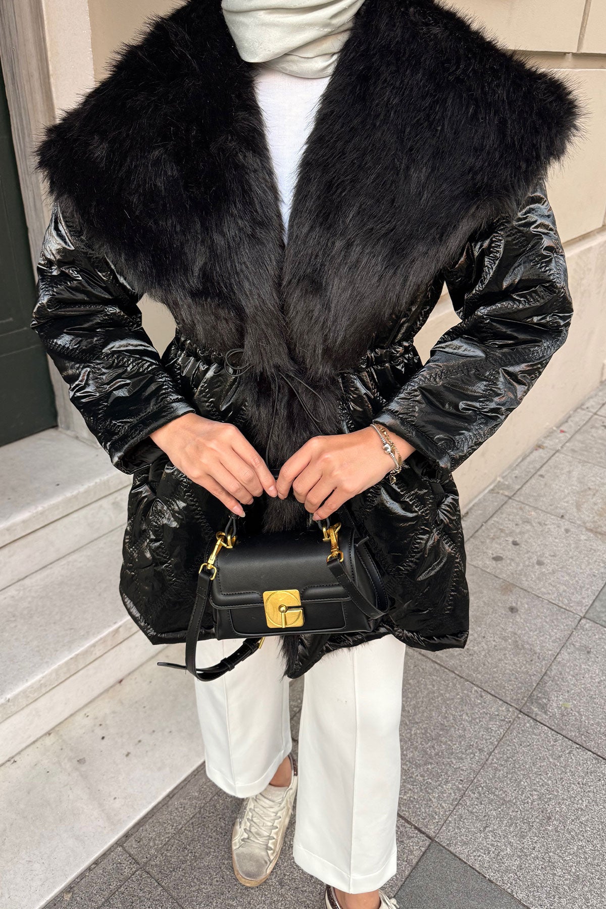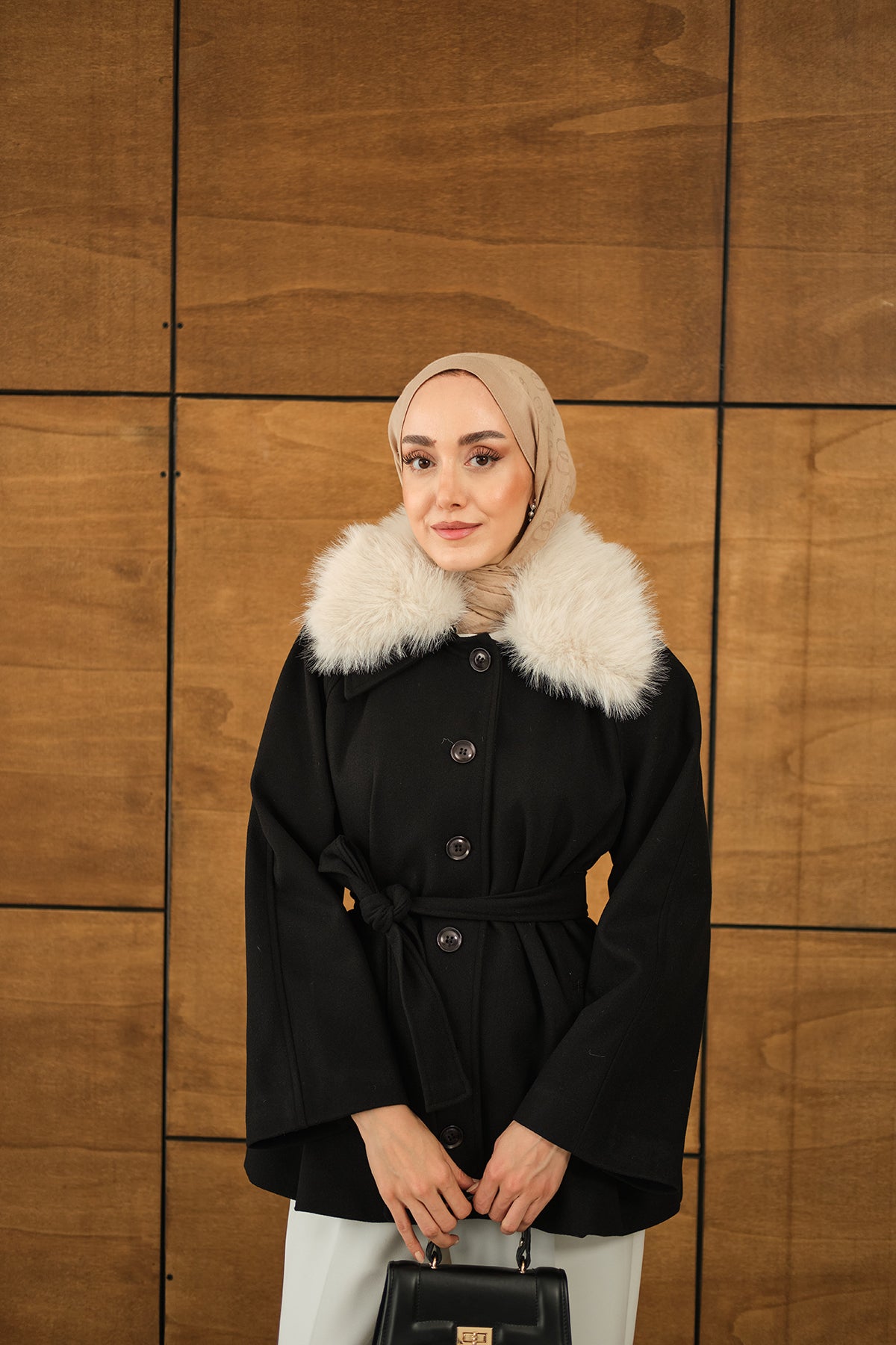 Yaka Kürk Detay Bel Bağlamalı Ceket Siyah