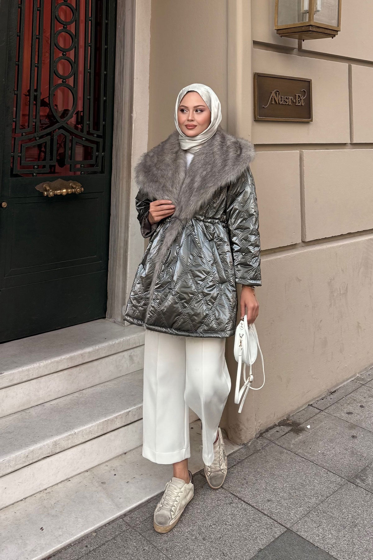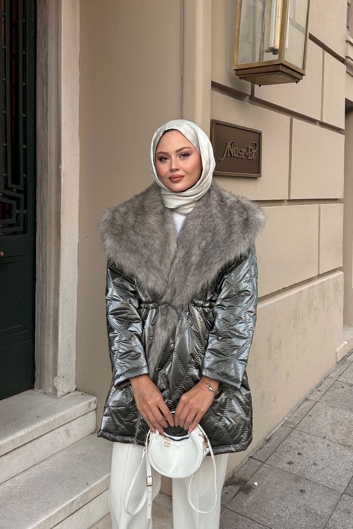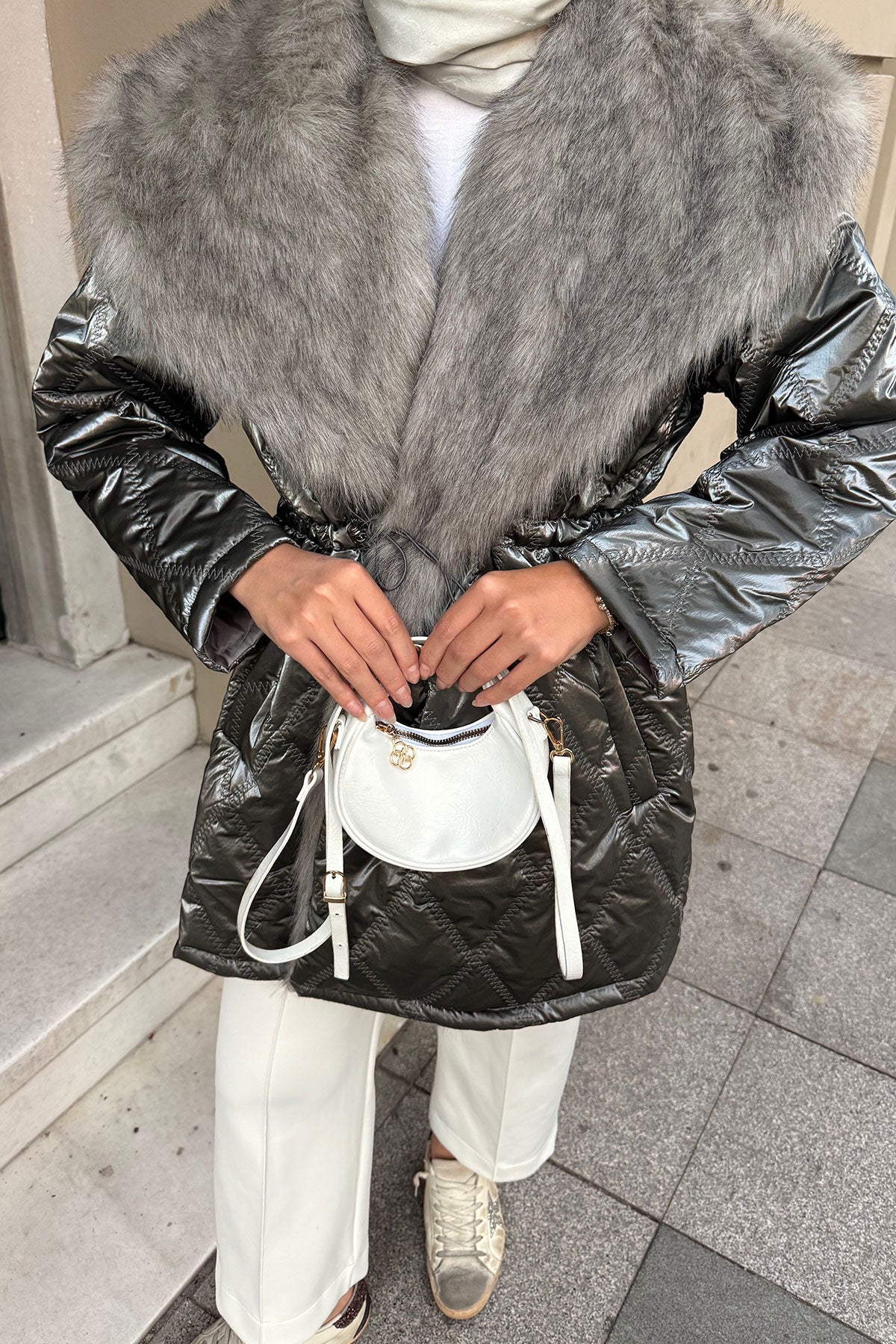 Yaka Kürklü Dikiş Detay Mont Beyaz
