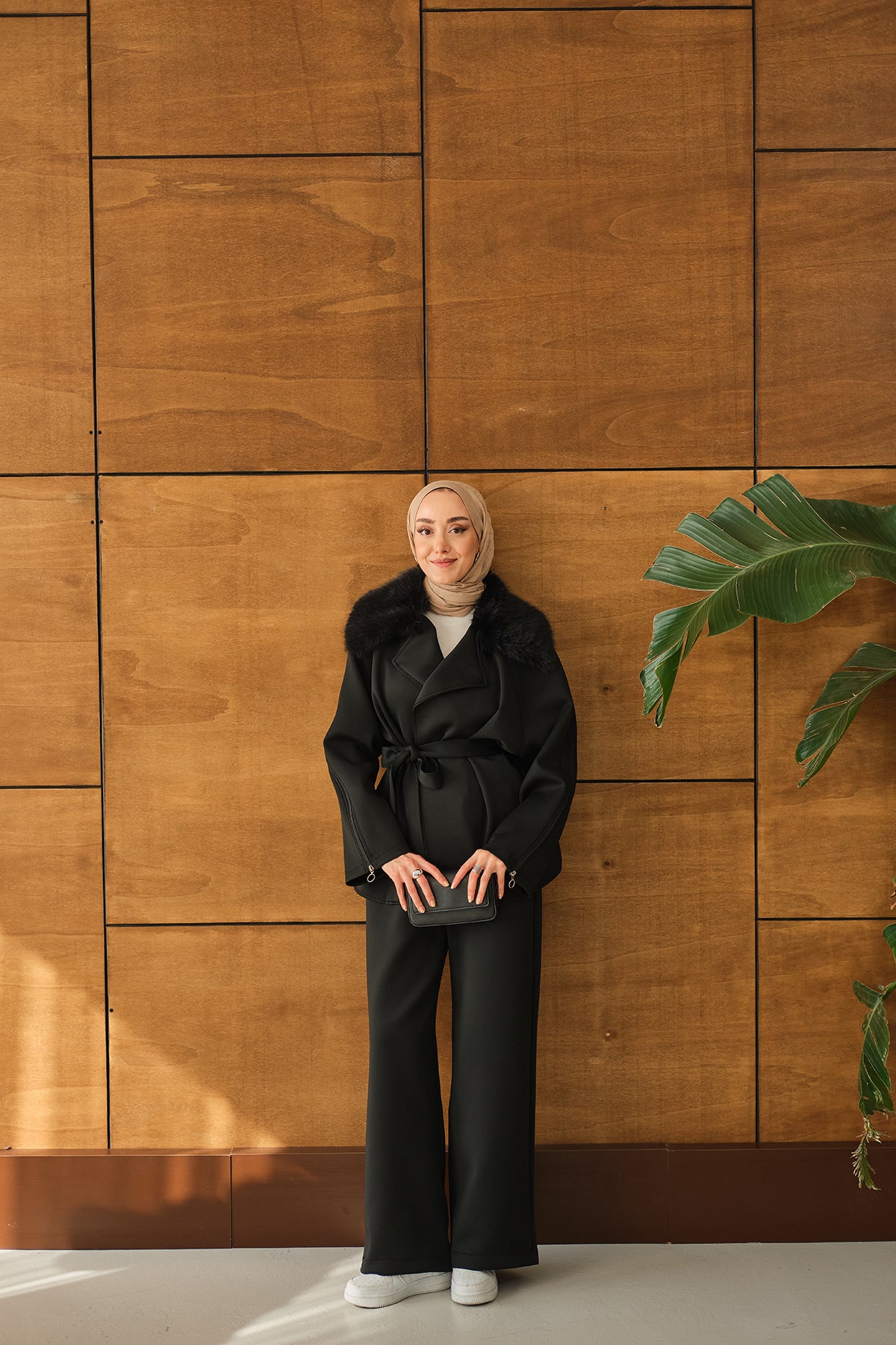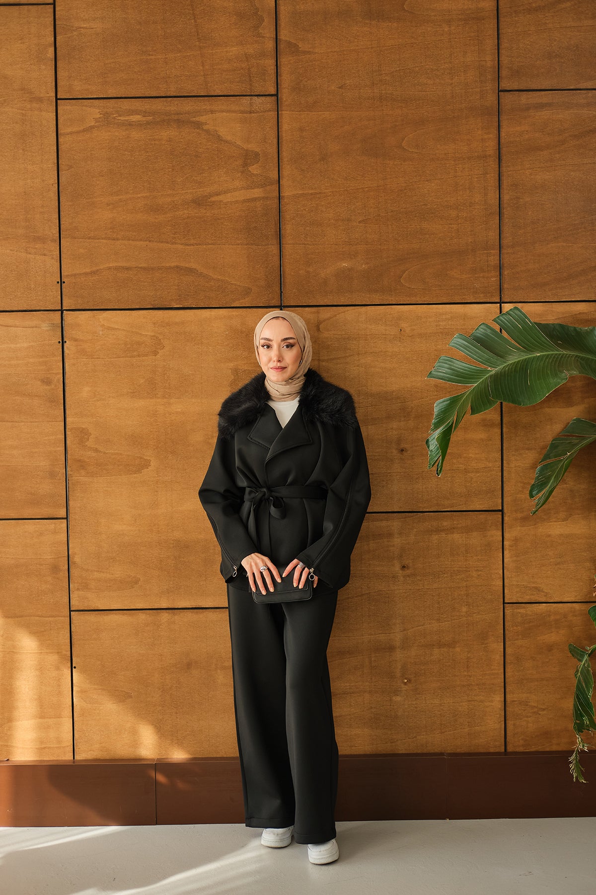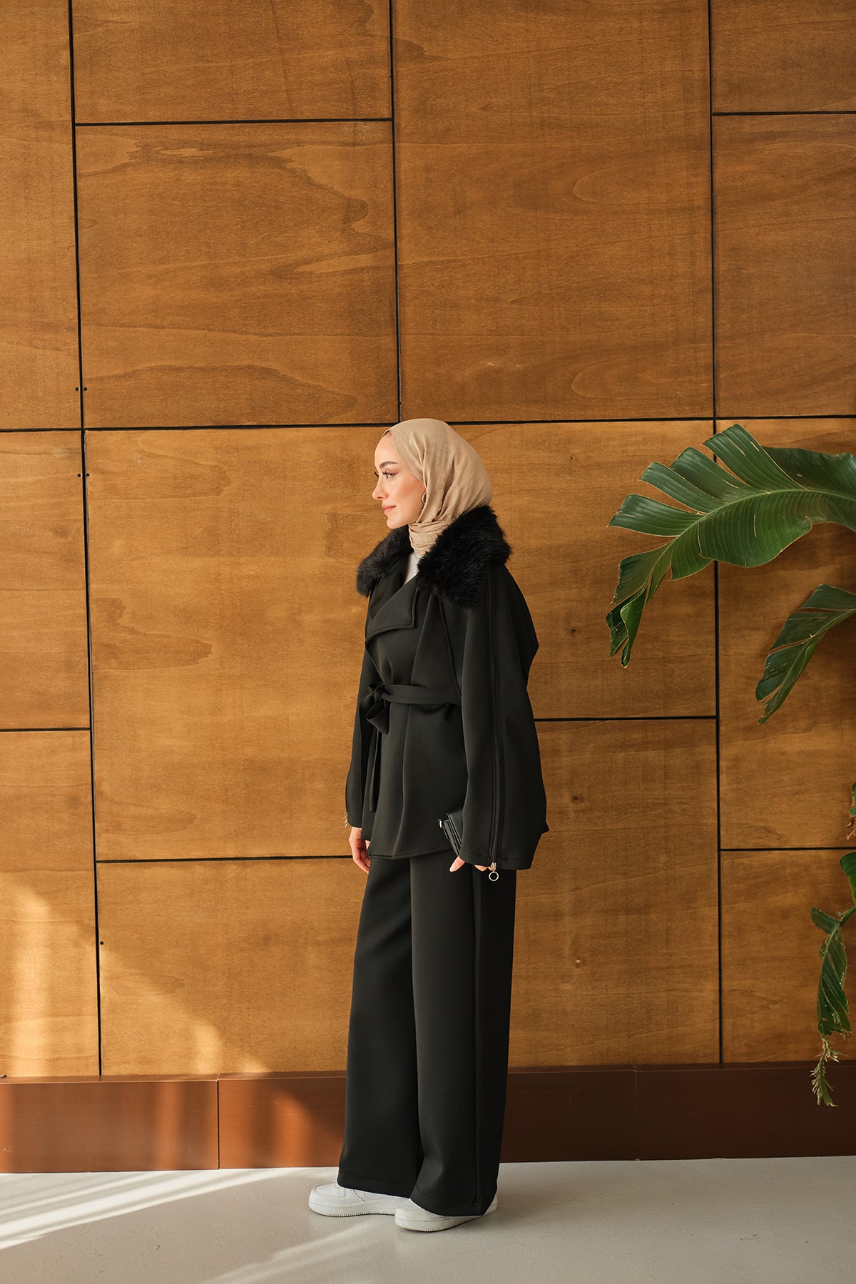 Yakası Kürk Kolları fermuarlı Takım Siyah