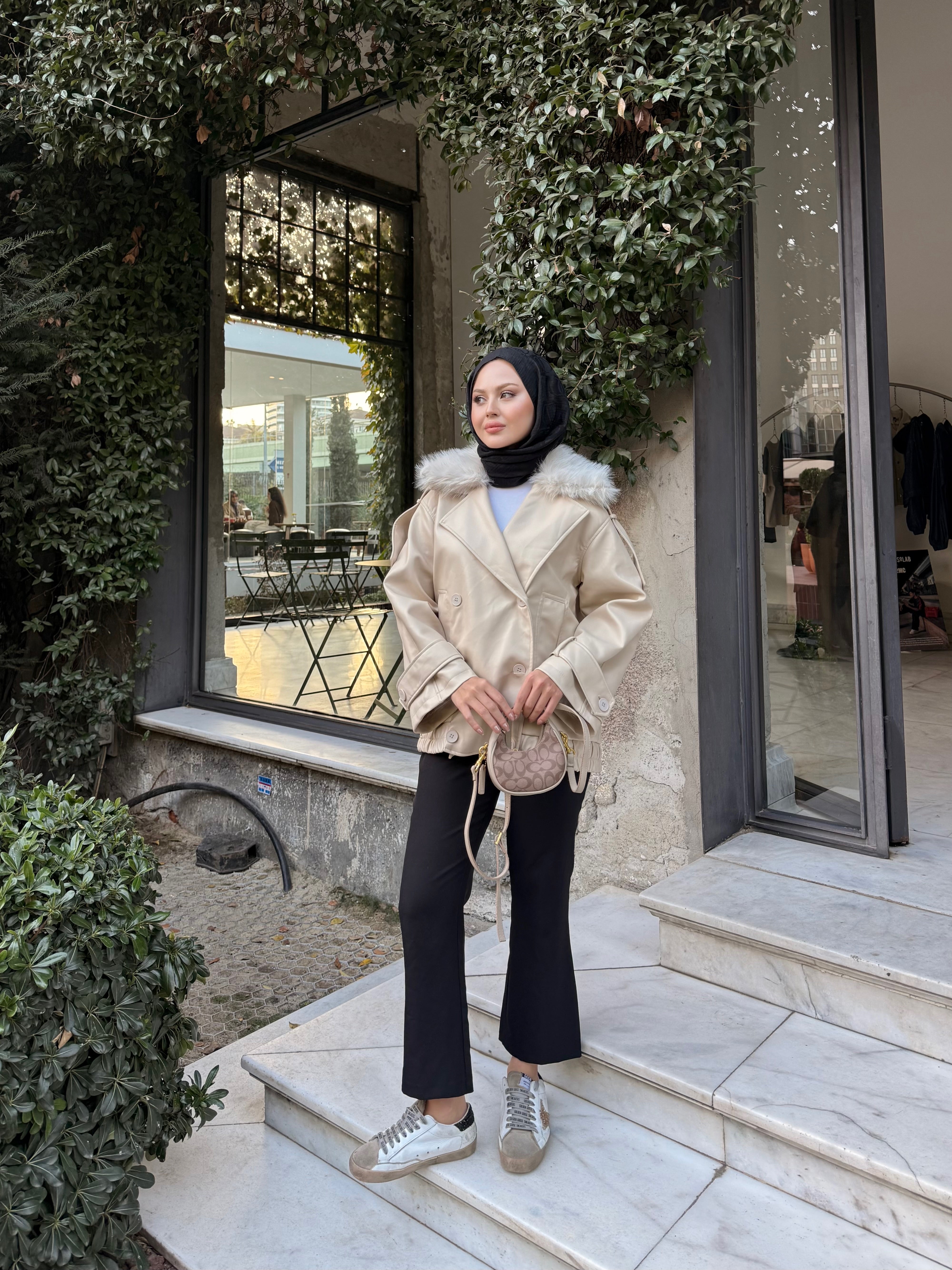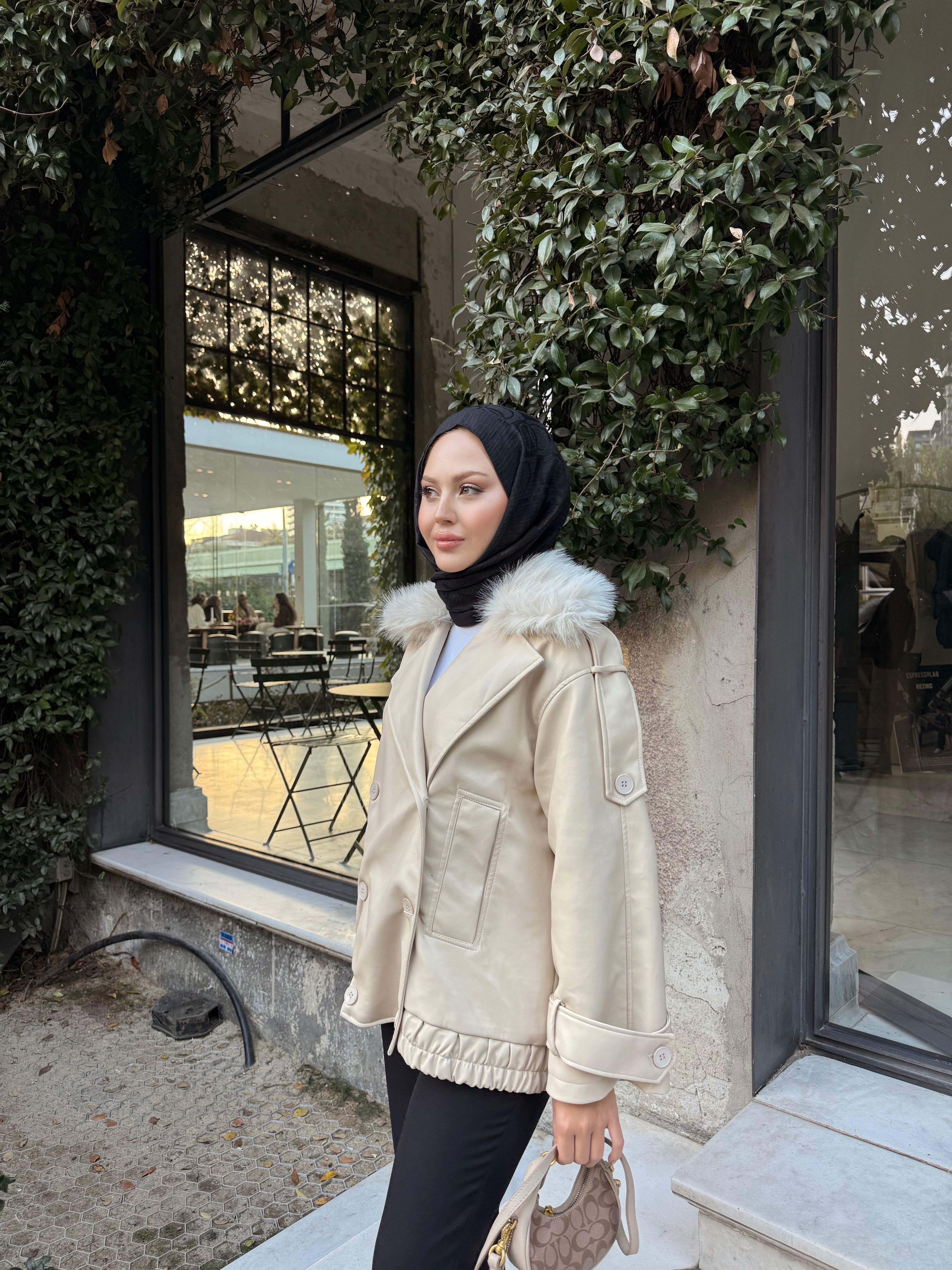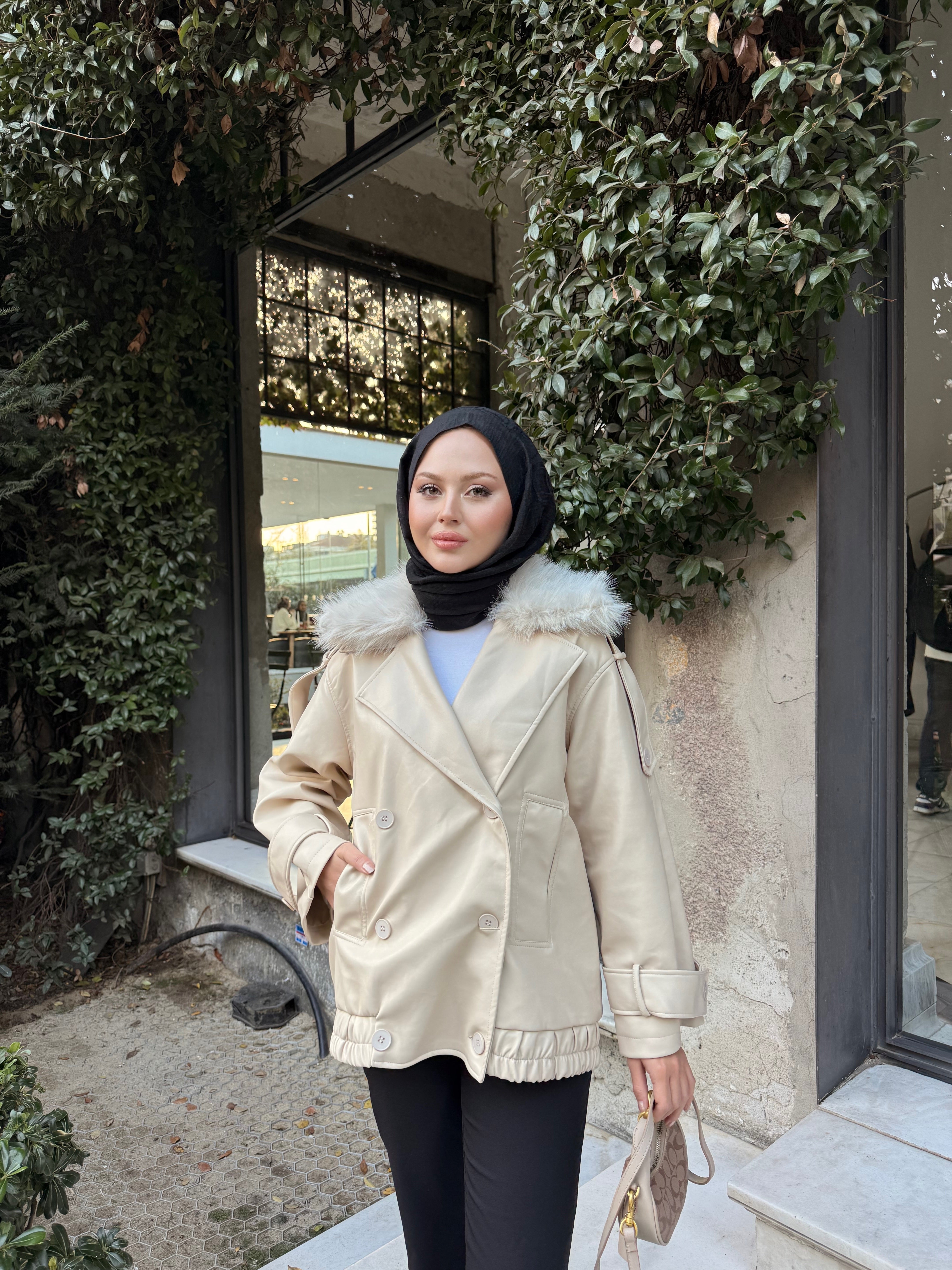 Yakası Kürk Detaylı Deri Ceket Krem