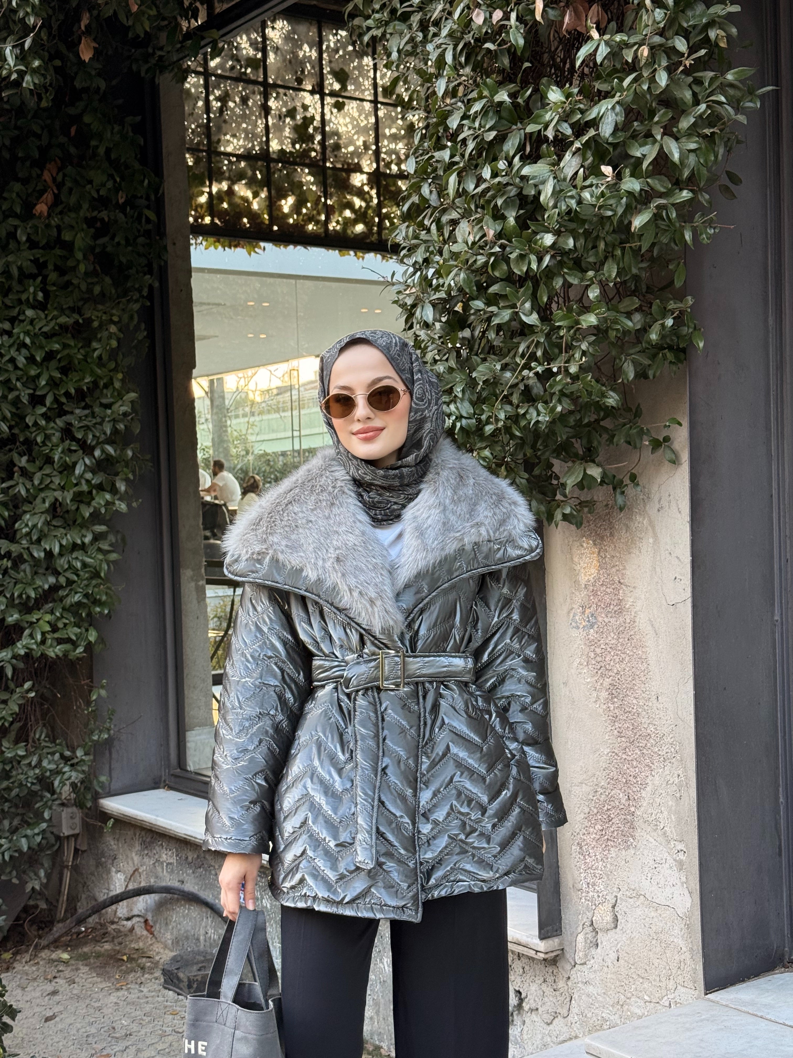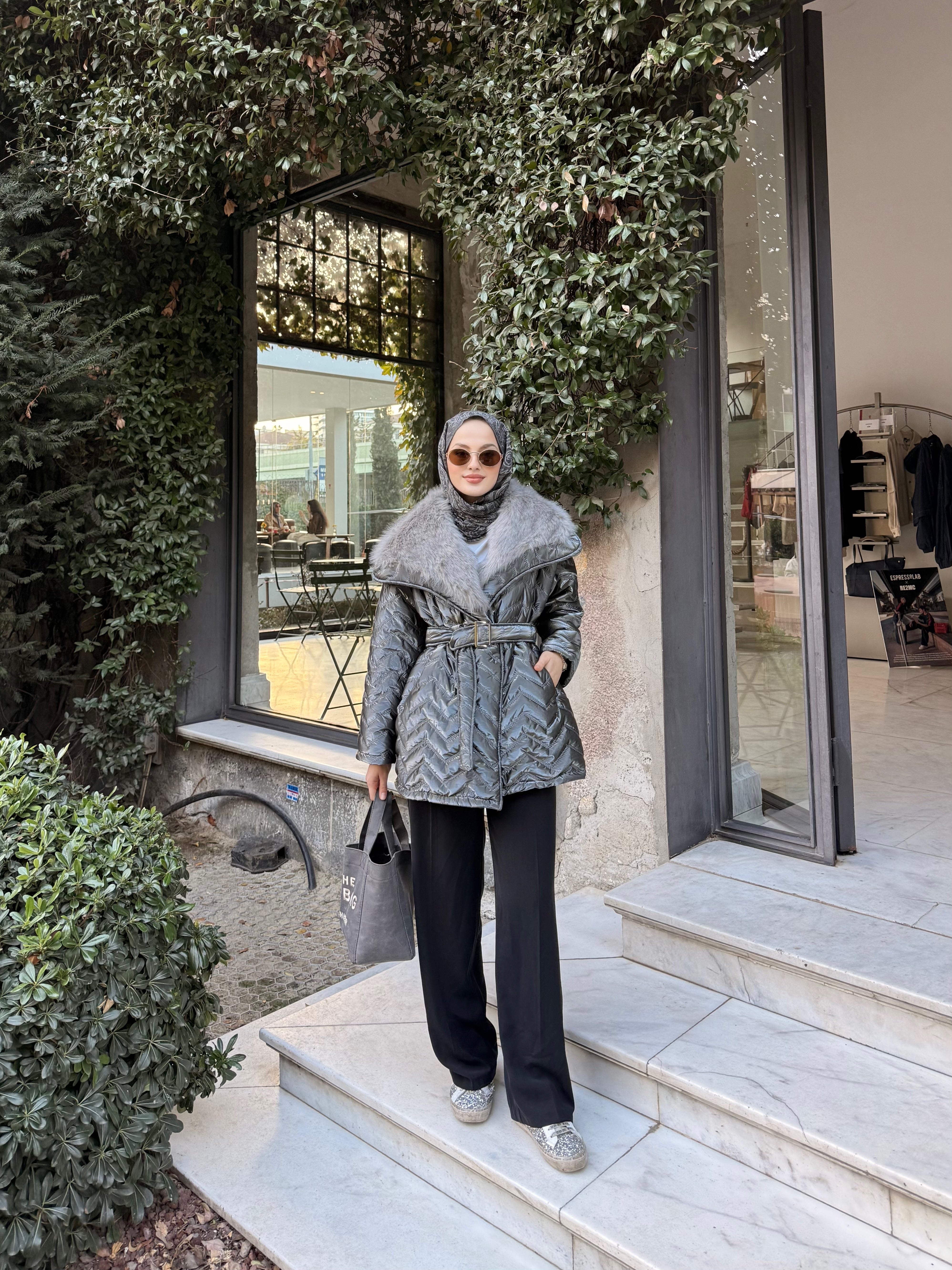 Yakası Kürk Detaylı Bel Bağlamalı Mont Gri