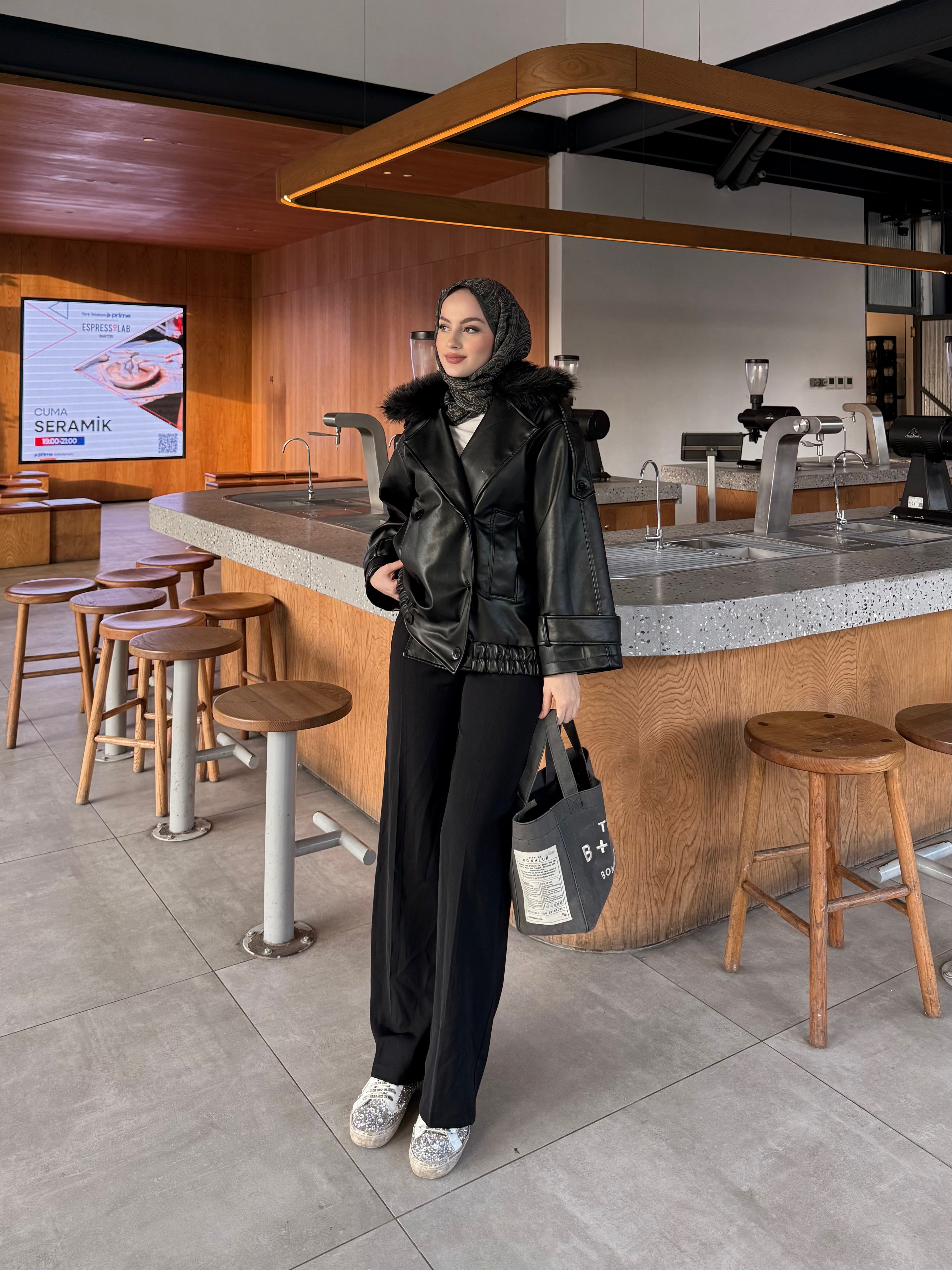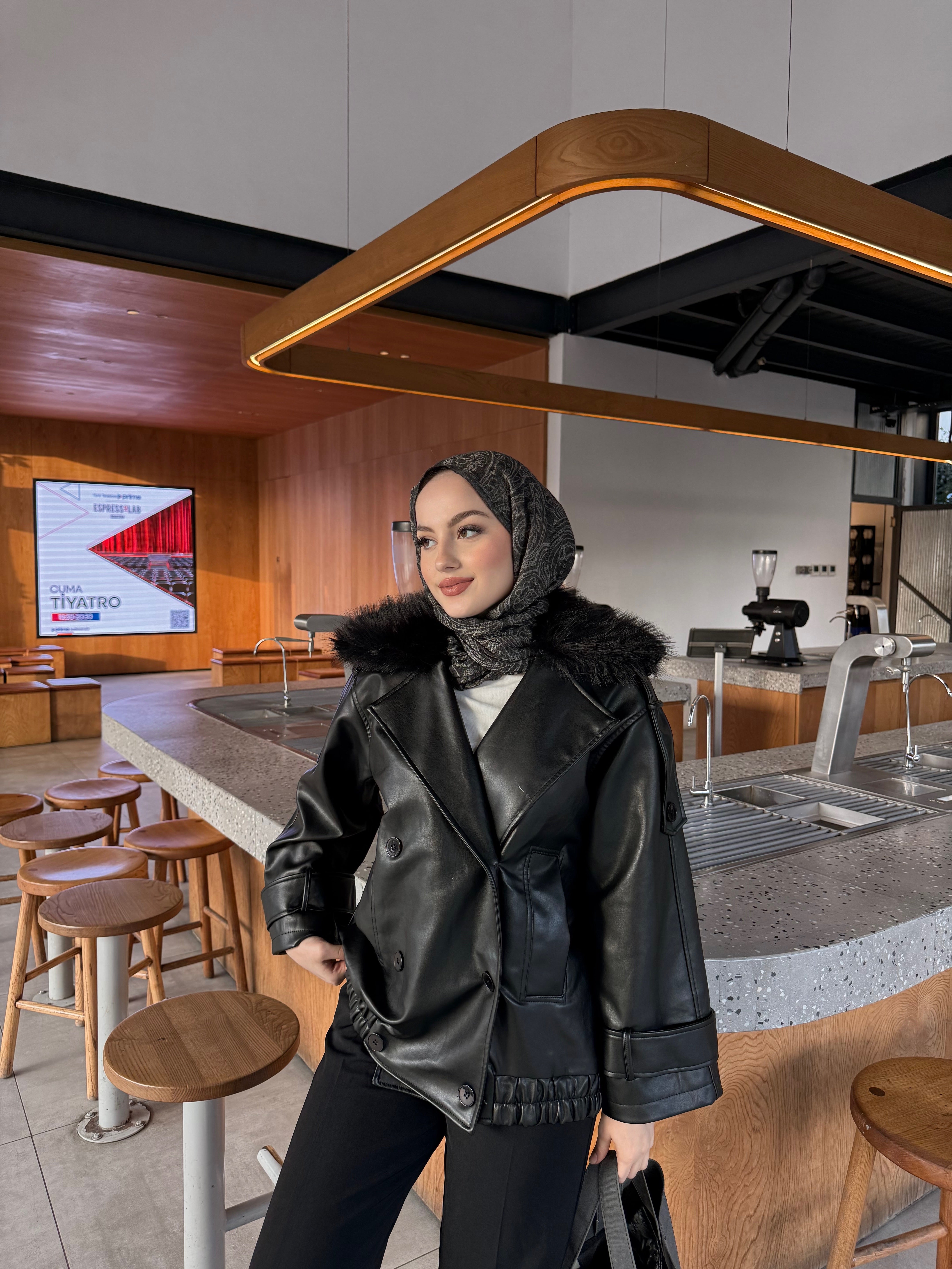 Yakası Kürk Detaylı Deri Ceket Siyah